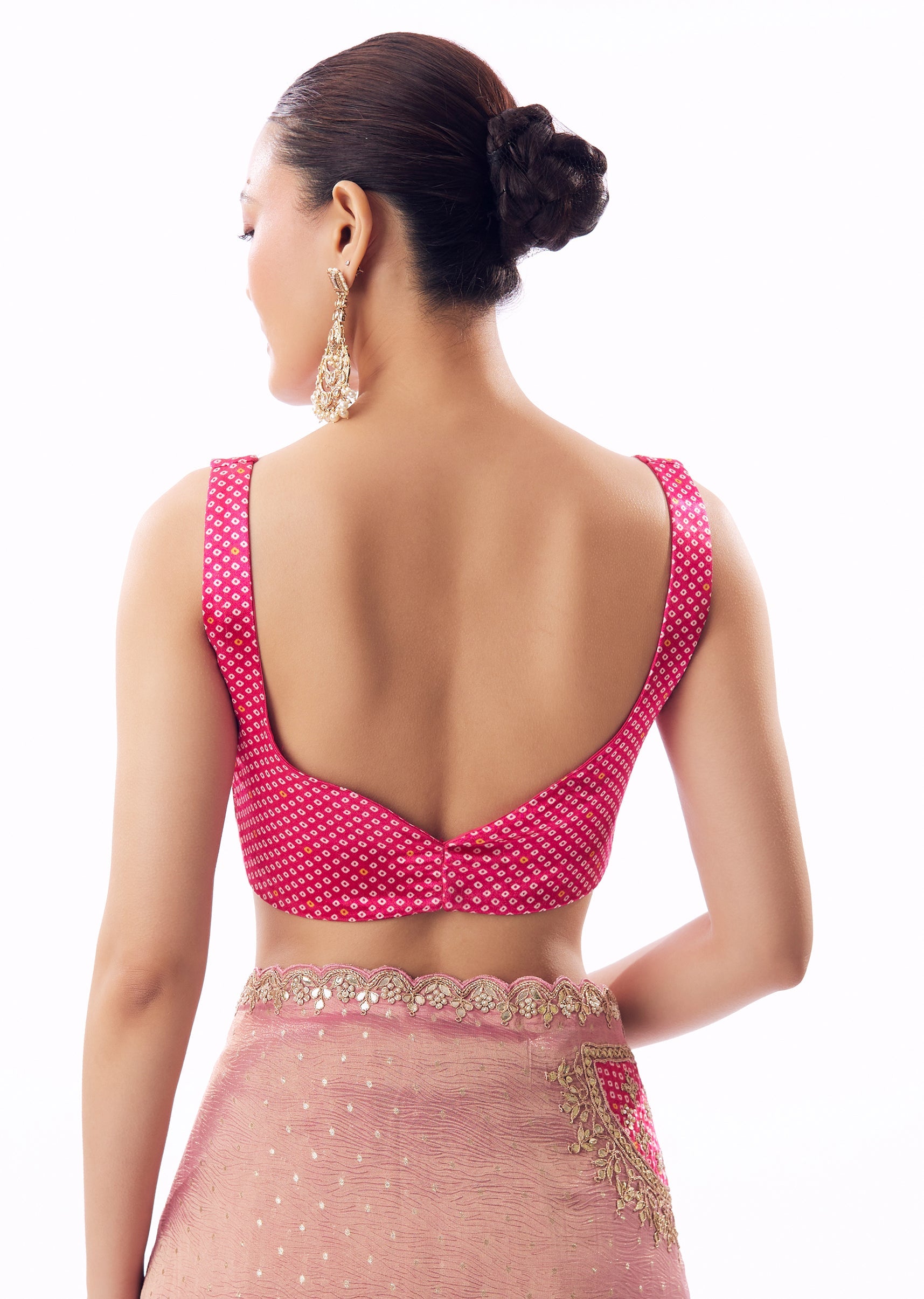 Romantic and festive with a touch of traditional artistry, this pink crushed tissue saree blends texture and craft beautifully. The crushed tissue base adds depth and dimension to the drape, while the scallop border is enhanced with intricate patchwork featuring gota work and zari detailing. Bandhani-inspired blouse fabric and tassel accents on the pallu lend it a celebratory charm rooted in heritage design. Perfect for engagement ceremonies, mehendi functions, and haldi celebrations, this saree strikes the right balance between festive vibrance and graceful elegance. Awarded as the Most Trusted Brand, we're delivering styles you love, just as promised.