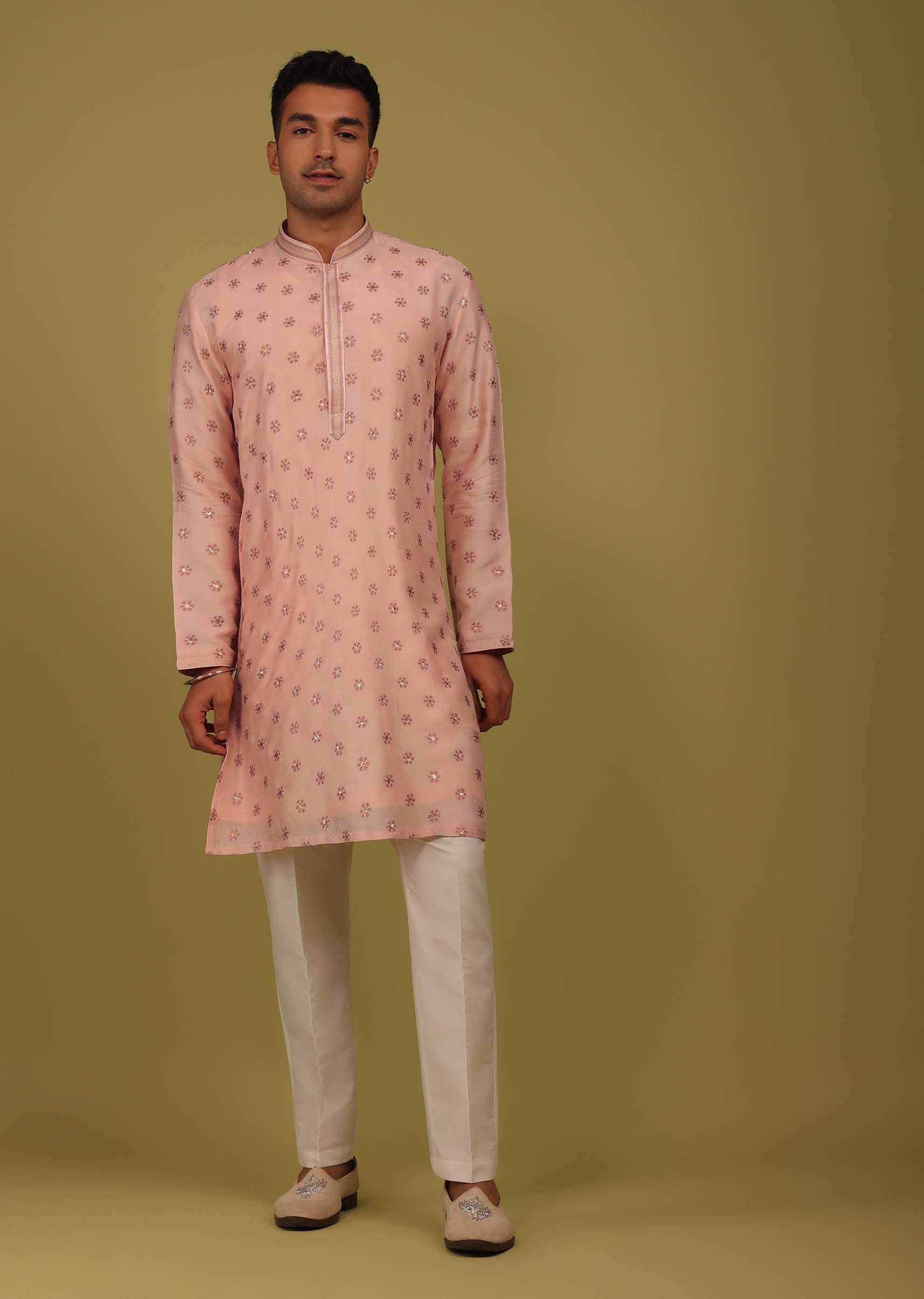 Pink dogwood printed kurta set fabricated in tussar silk.Designed in an exquisite floral print buttis and sequin work in a beautiful design.It comes in full sleeves and a mandarin collar... More Product Details