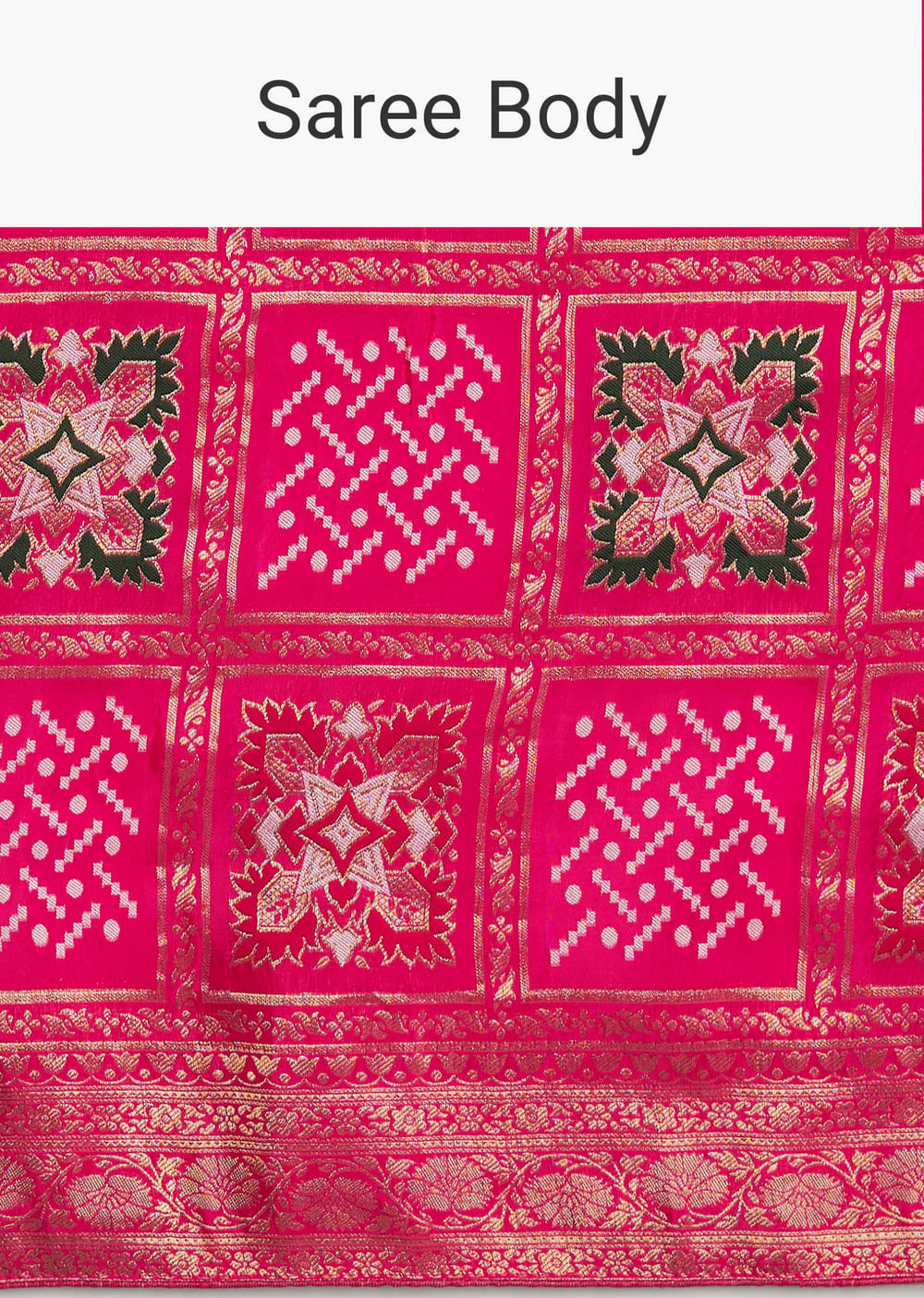 This Pink Dola Silk Saree showcases exquisite woven patola patterns that bring a touch of heritage to its vibrant hue. Perfect for festive occasions, weddings, or cultural events, it offers a graceful and traditional aesthetic with a modern flair. Blouse design may vary. Awarded as the Most Trusted Brand, we're delivering styles you love, just as promised.