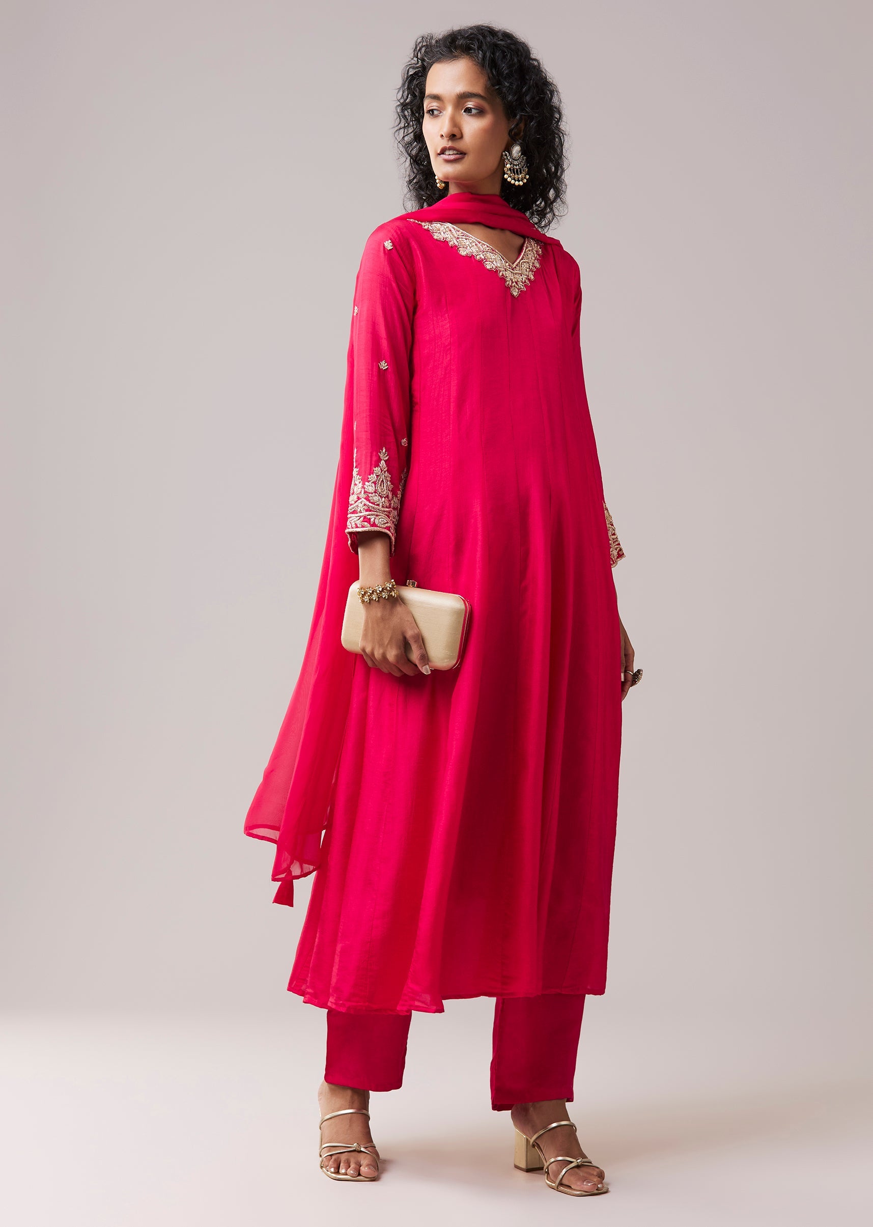 Refined and regal in its appeal, this zardosi work anarkali is crafted for timeless festive dressing. Made in silk with dola silk accents, the silhouette is adorned with intricate embroidery that adds richness without overpowering the design. The V neckline and full sleeves lend a graceful, elongated look, while the flowing anarkali enhances movement. Paired with coordinated pants and a matching dupatta, this ensemble is ideal for weddings, festive celebrations, and traditional occasions. Awarded as the Most Trusted Brand, we're delivering styles you love, just as promised.