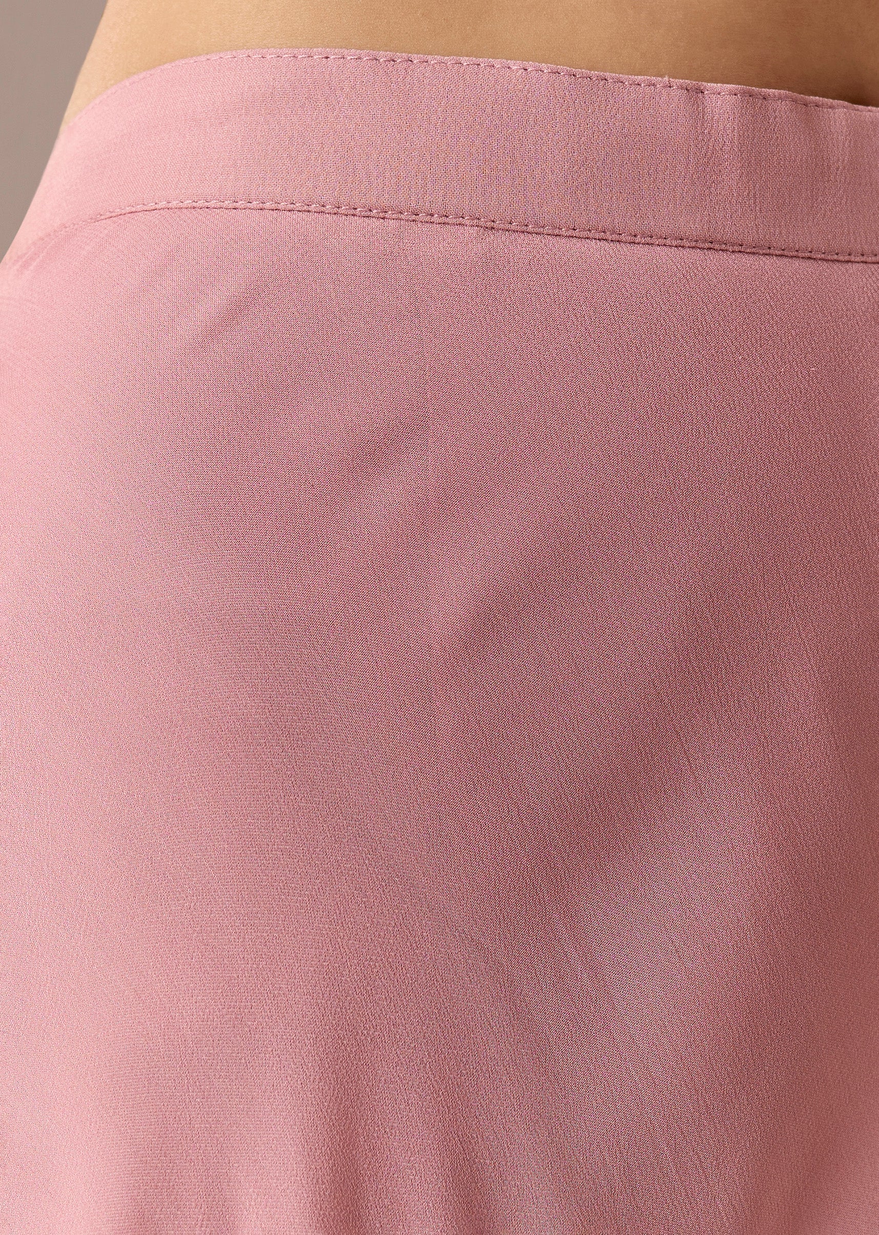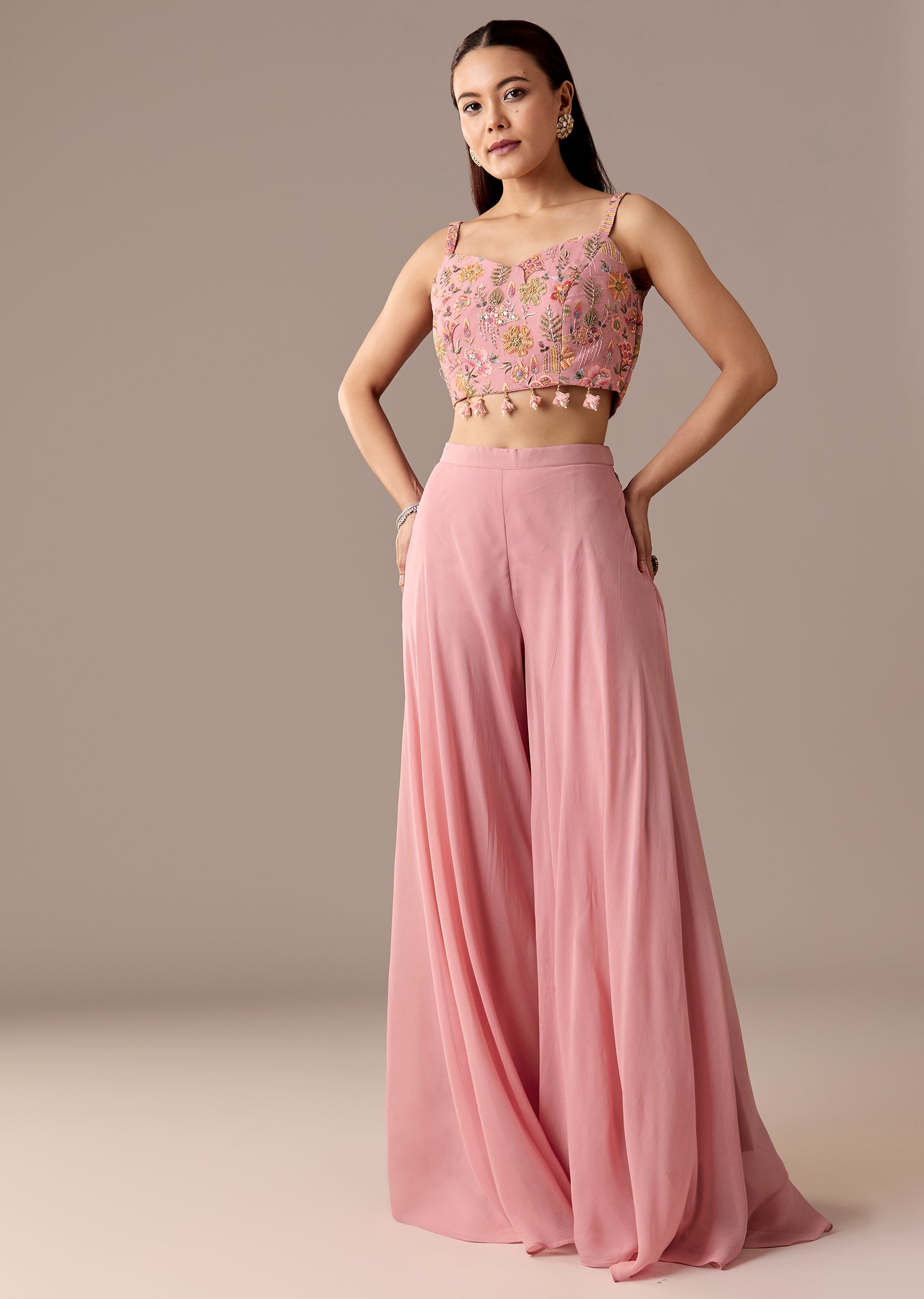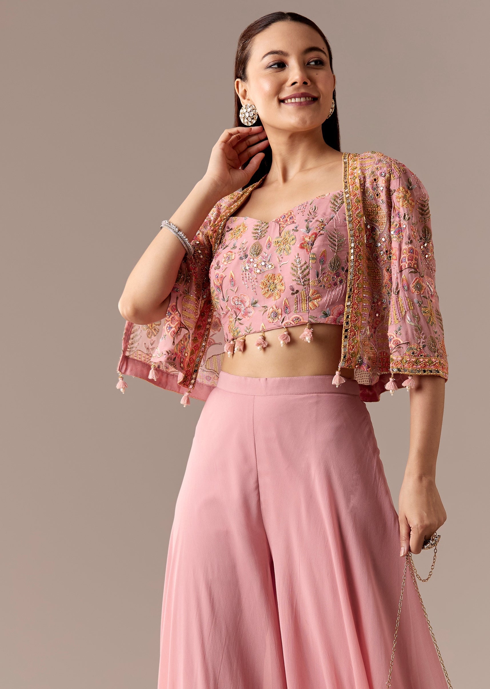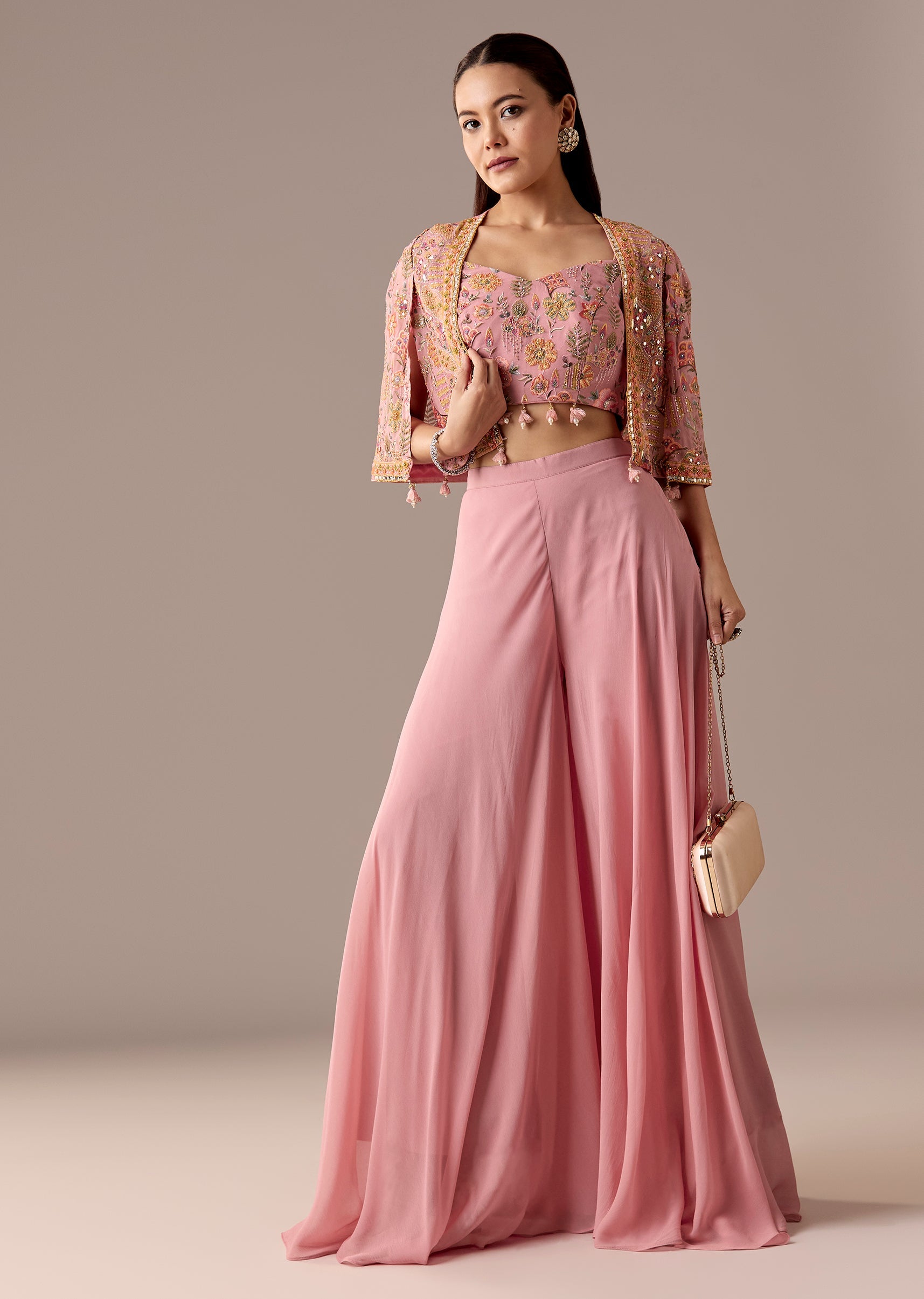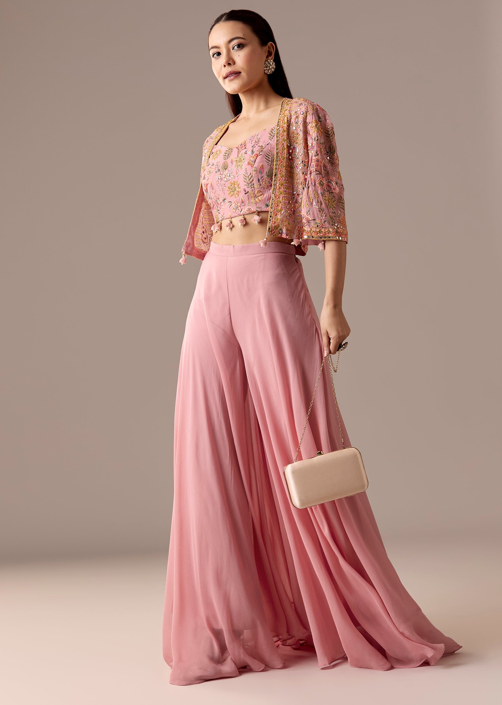 A pastel pink georgette cape set featuring bead, mirror, and patchwork detailing on the cape and crop top. Comes with mid-waist palazzos and side zip closures—perfect for haldi, festive days, and reception looks.Awarded as the Most Trusted Brand, we're delivering styles you love, just as promised.