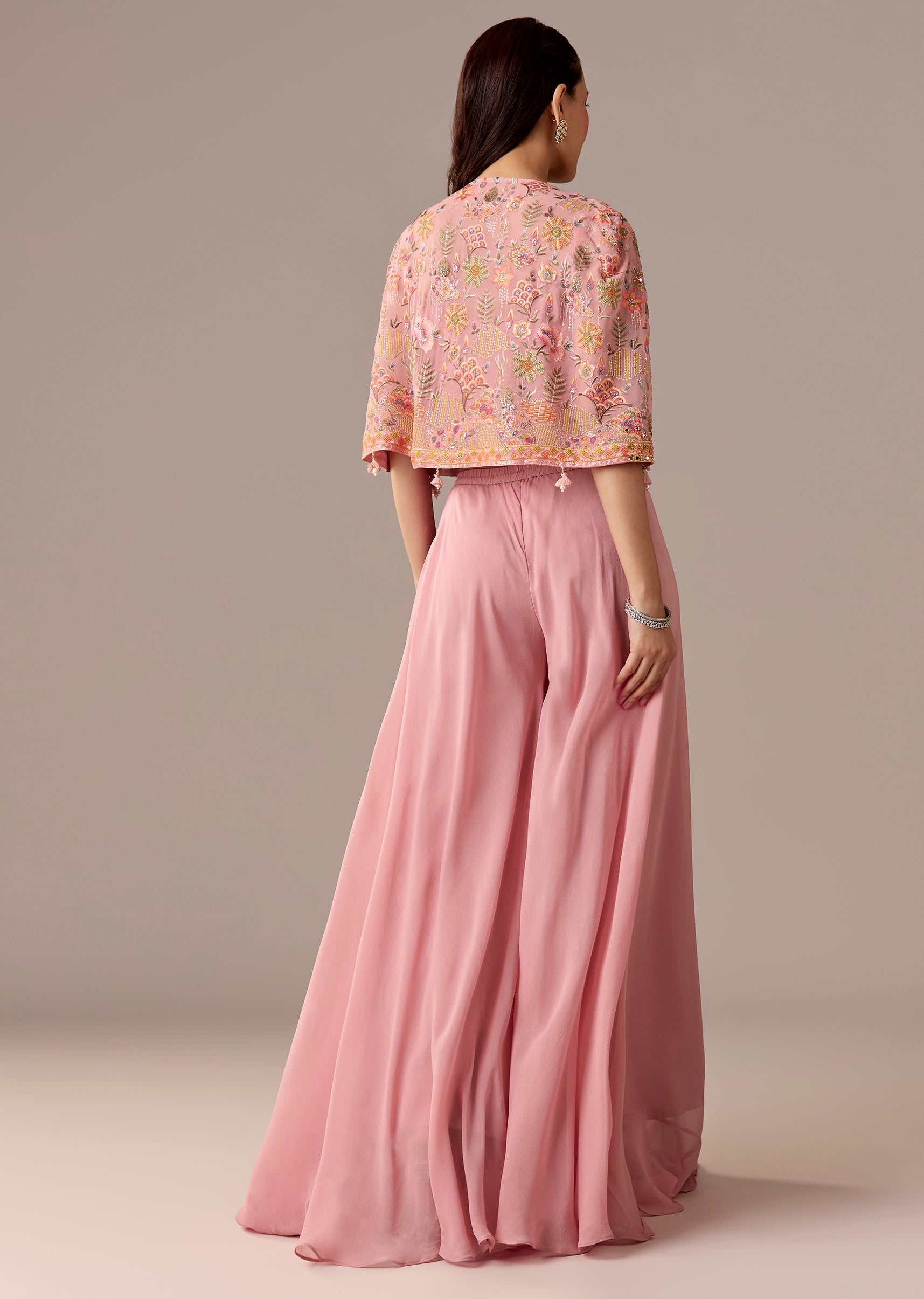 A pastel pink georgette cape set featuring bead, mirror, and patchwork detailing on the cape and crop top. Comes with mid-waist palazzos and side zip closures—perfect for haldi, festive days,... More Product Details