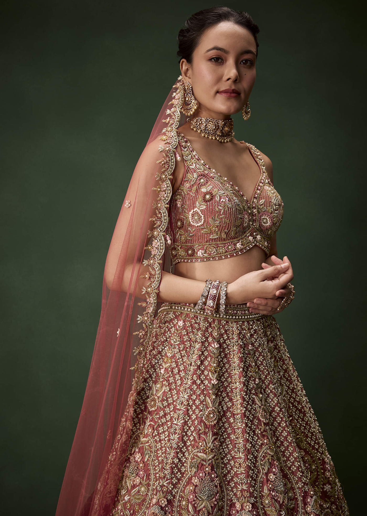 Pink Embroidered Bridal Raw Silk Lehenga Set with Two Dupattas