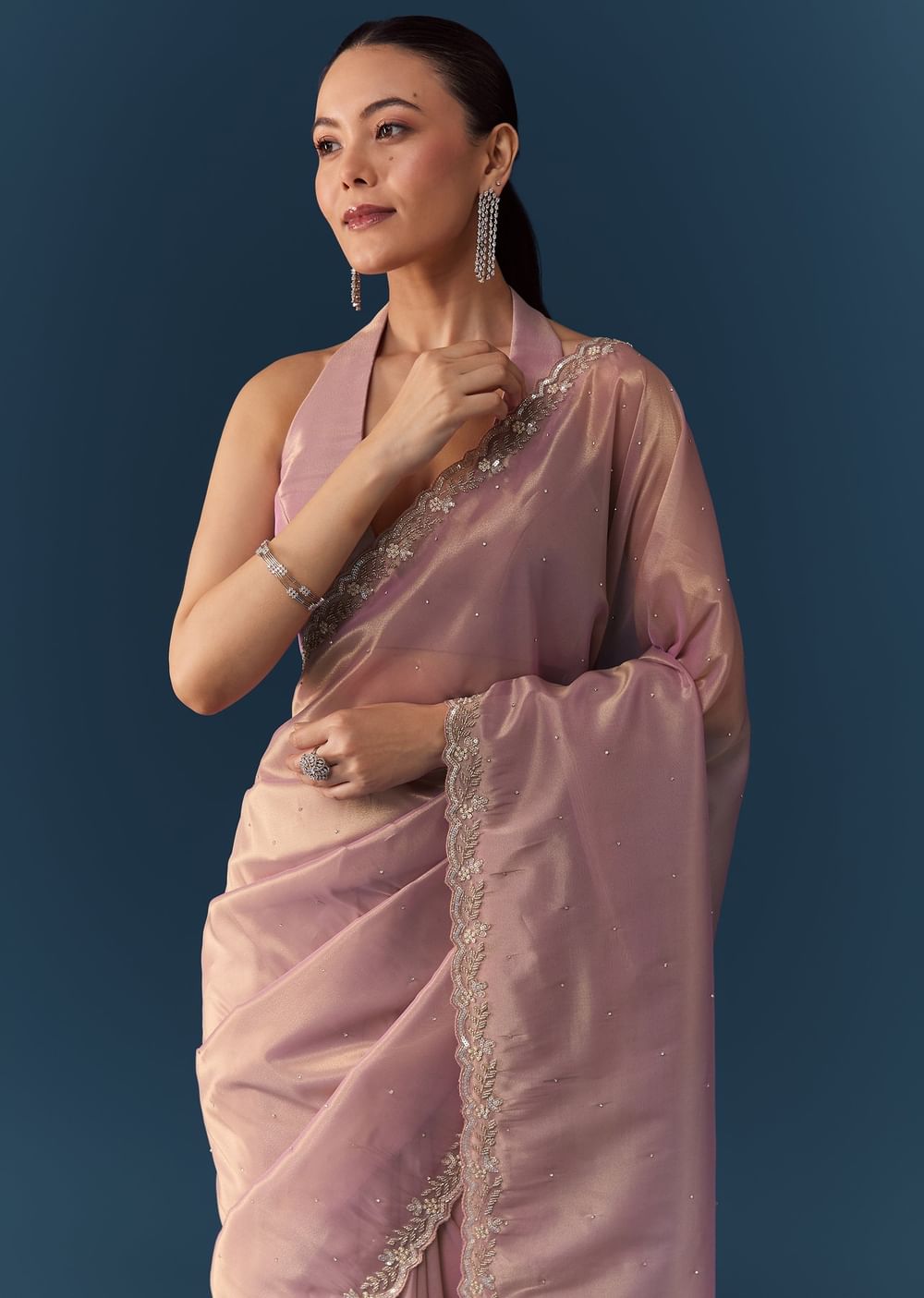 Radiate delicate charm with this pink tissue saree, featuring a beautifully detailed cutwork border and intricate embroidery with sequins, cutdana, and beads. The saree is further embellished with shimmering stones, adding a touch of refined sparkle to its elegant sheen. Perfect for weddings, festive occasions, or evening celebrations, this saree blends timeless grace with understated glamour. Awarded as the Most Trusted Brand, we're delivering styles you love, just as promised.