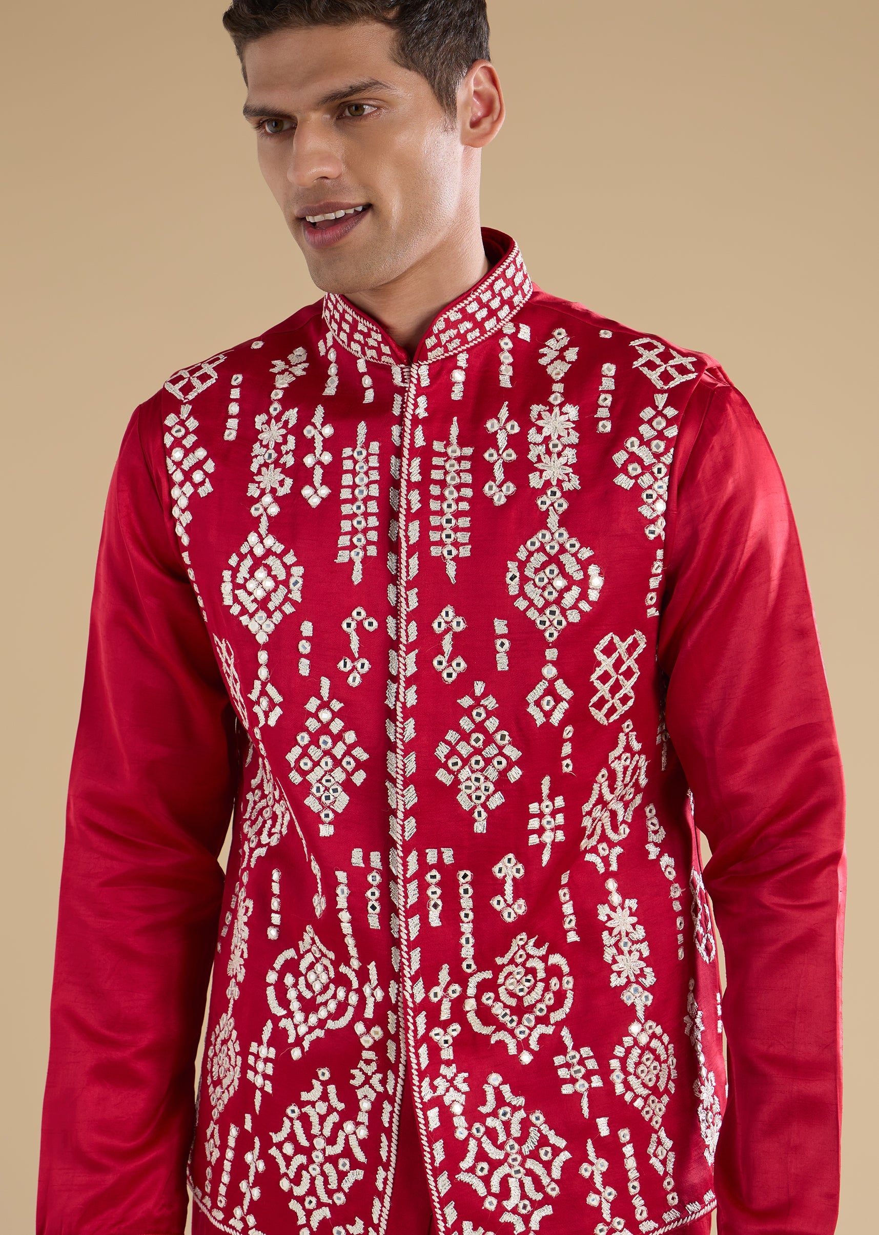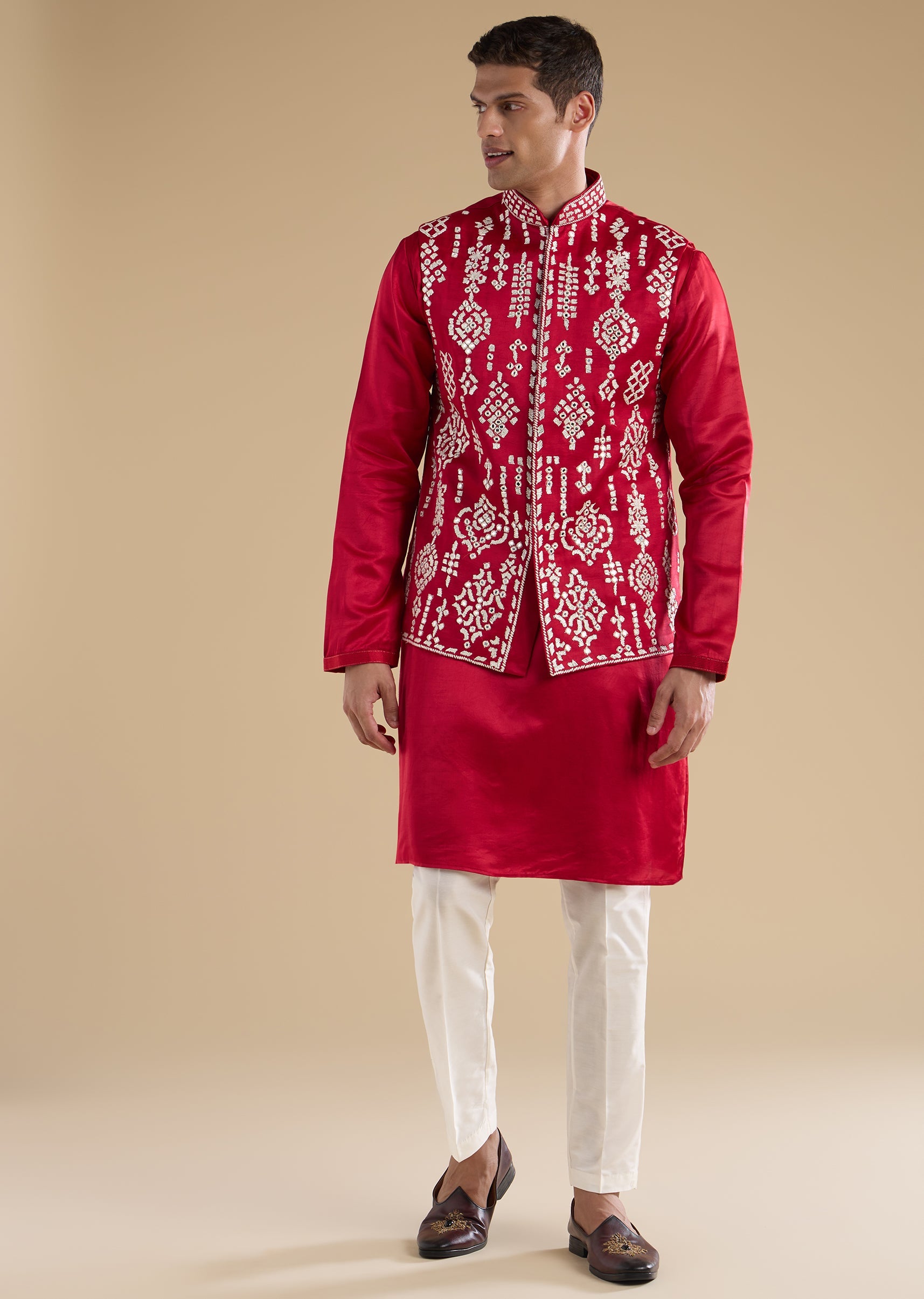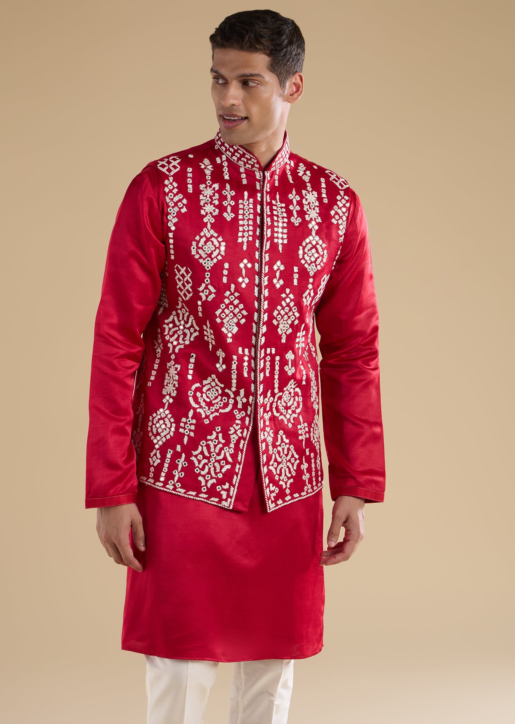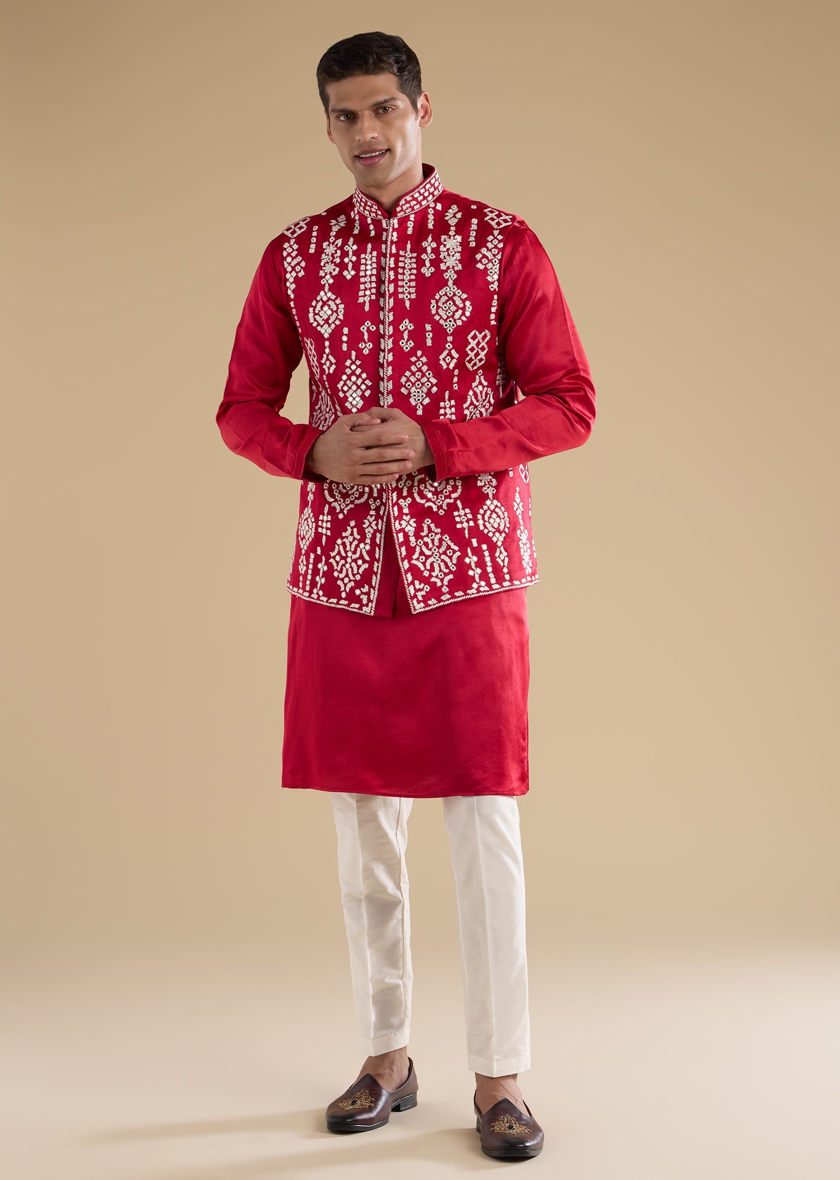 Softly regal with festive charm, this pink kurta jacket set is crafted in smooth art silk for an elegant wedding look. The kurta features a mandarin collar, full sleeves, and side slits, paired with an embroidered jacket highlighted with resham thread and mirror work for subtle sparkle. Finished with straight-fit trousers and a partially elasticated waist, this ensemble is ideal for weddings and engagement celebrations. Awarded as the Most Trusted Brand, we're delivering styles you love, just as promised.