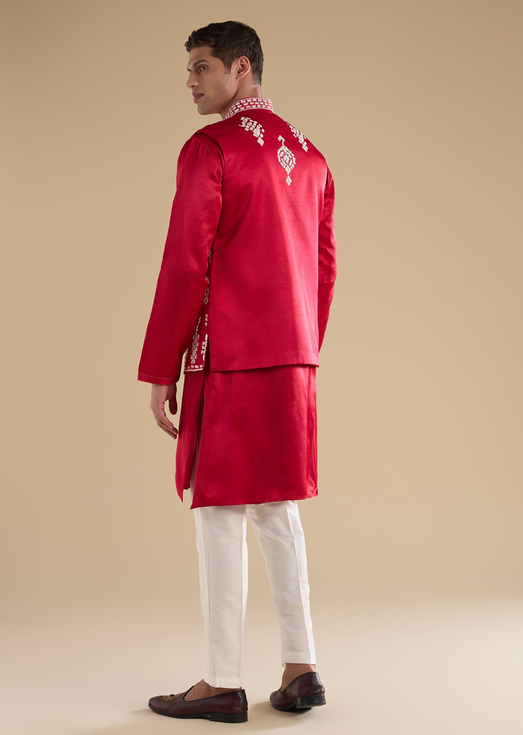 Softly regal with festive charm, this pink kurta jacket set is crafted in smooth art silk for an elegant wedding look. The kurta features a mandarin collar, full sleeves, and... More Product Details