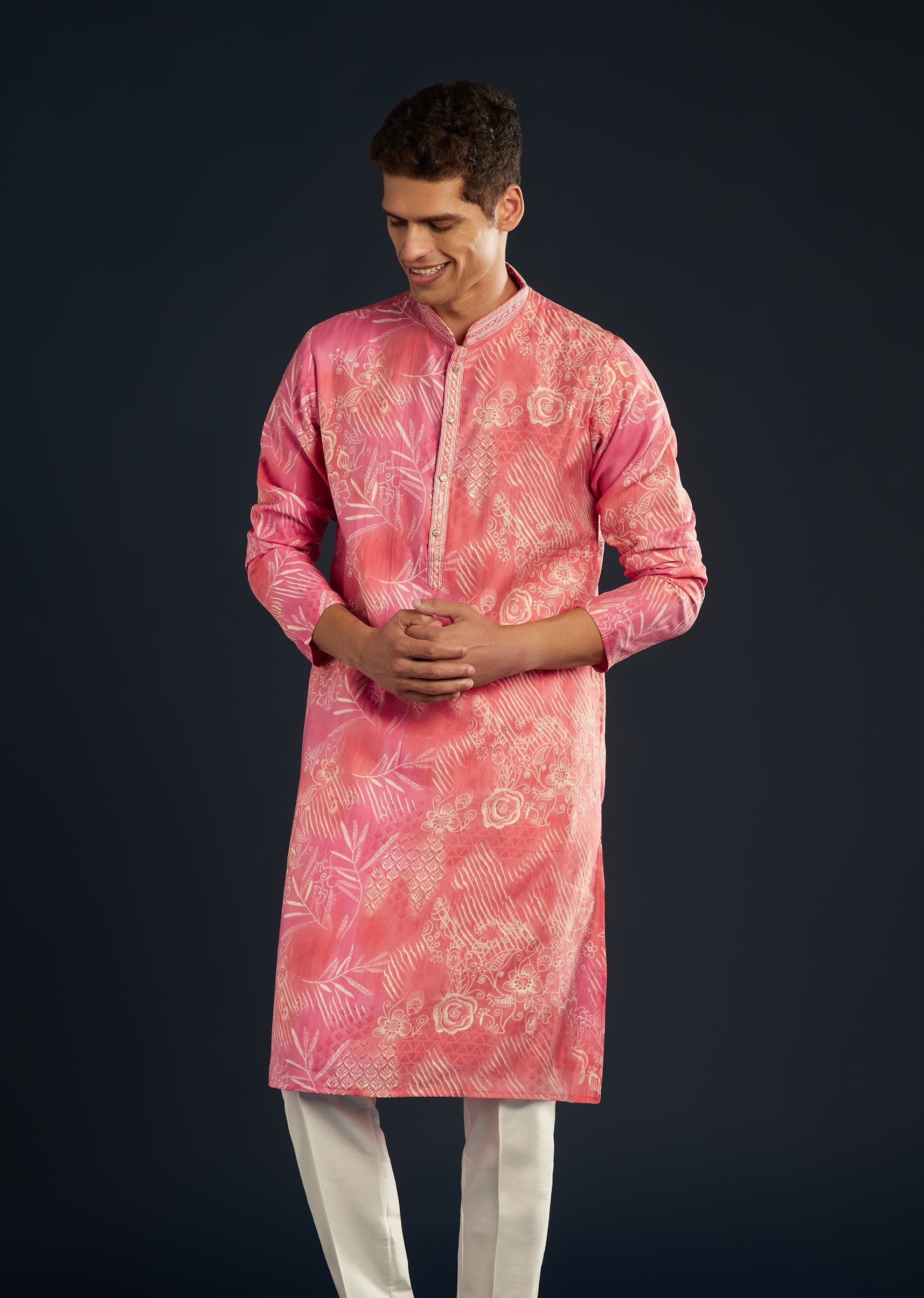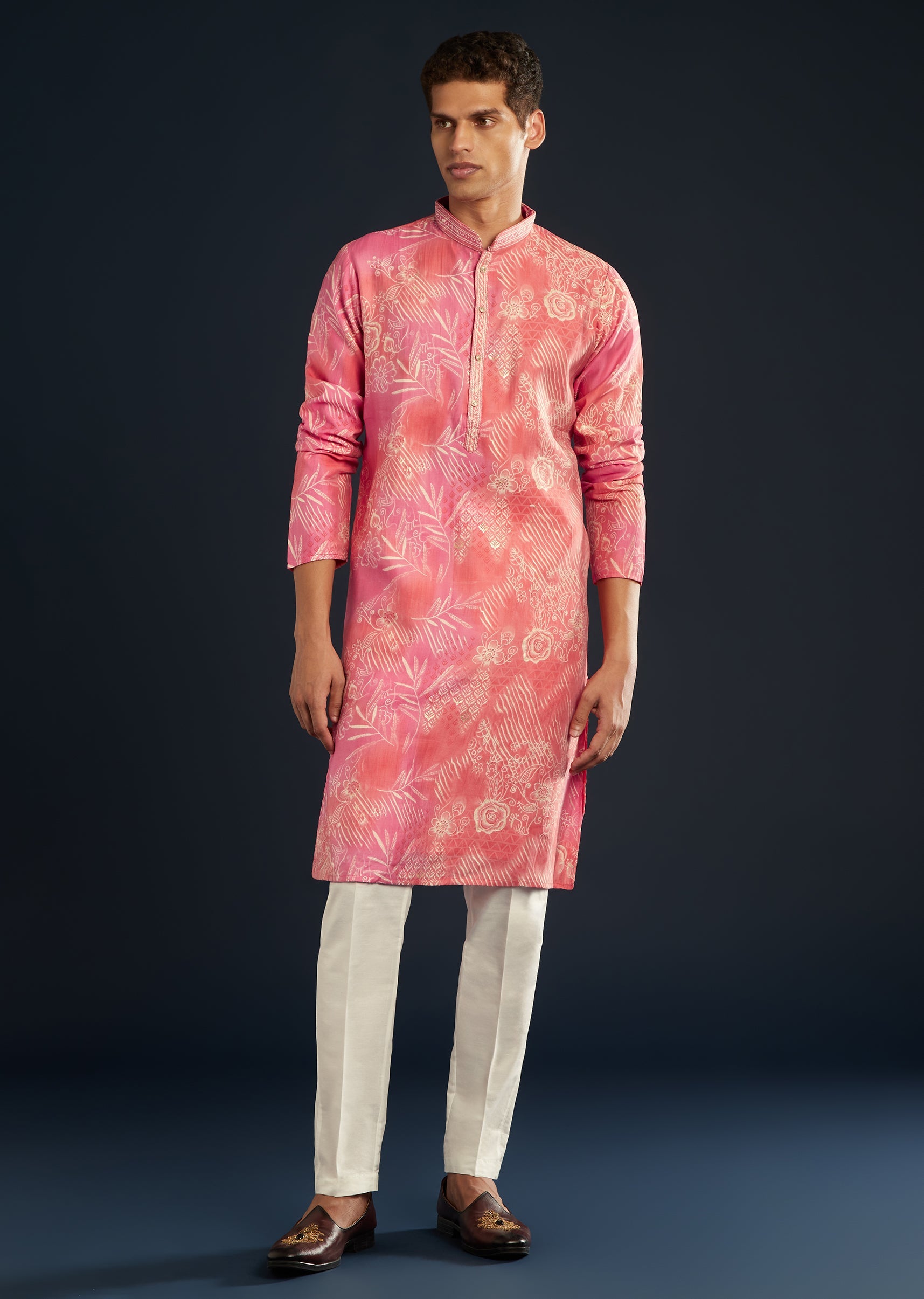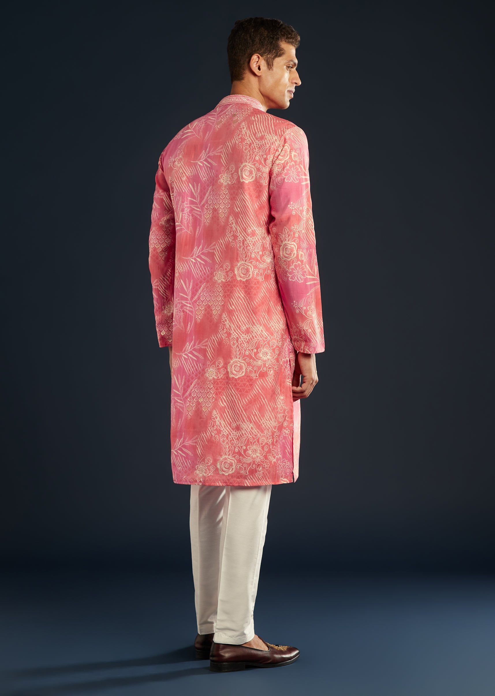 Radiant and regal, this pink silk kurta set brings together elegance and sophistication. Doused in vivid multi-hued prints, it catches the light with every movement — perfect for wedding nights... More Product Details