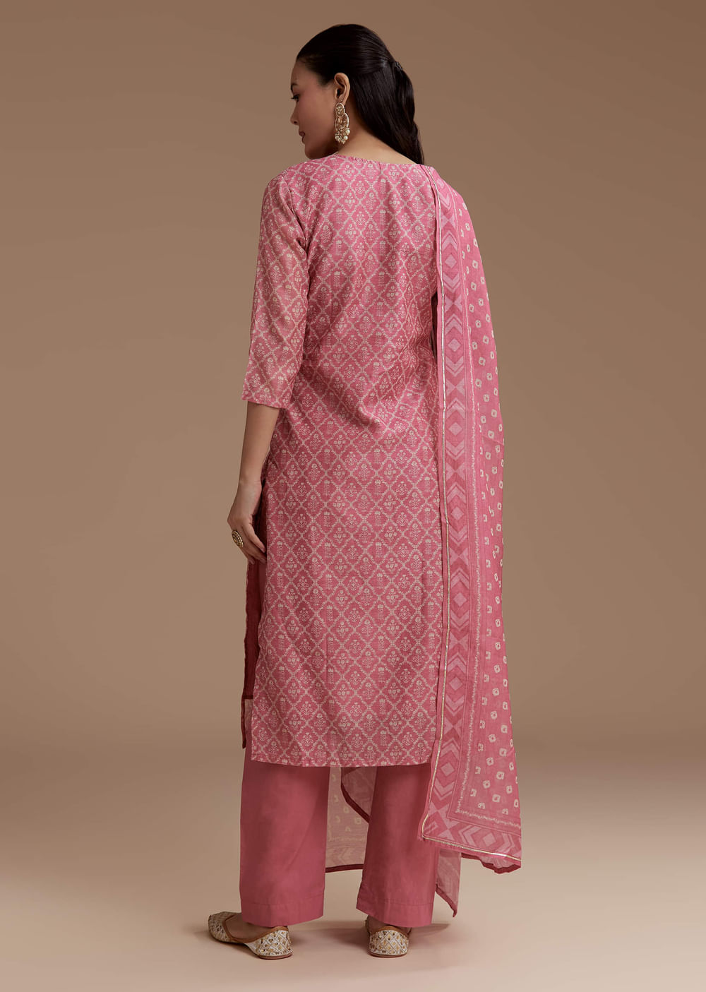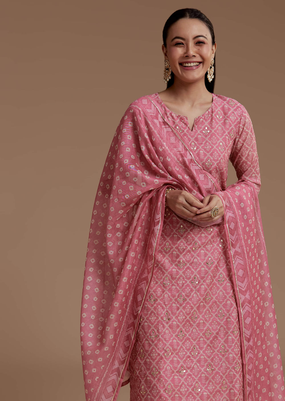 Pink Floral Print Chanderi Kurta Set with Gotta Work