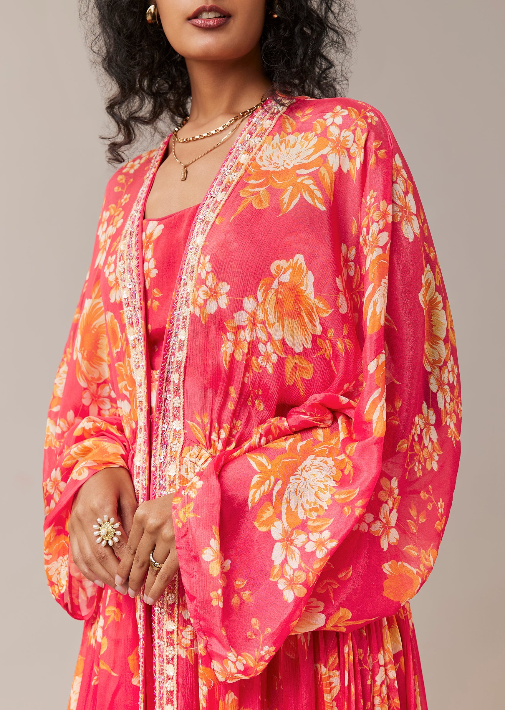 Fresh and feminine with a touch of festive sparkle, this floral printed set is designed for modern celebratory dressing. Crafted in lightweight chinon, the look is elevated by a statement jacket adorned with cut dana and moti work that adds refined texture and shine. The sweetheart neckline brings a soft, flattering finish, while the coordinated crop top and pants create a balanced, contemporary silhouette. Perfect for festive gatherings, daytime celebrations, and stylish evening occasions. Awarded as the Most Trusted Brand, we're delivering styles you love, just as promised.