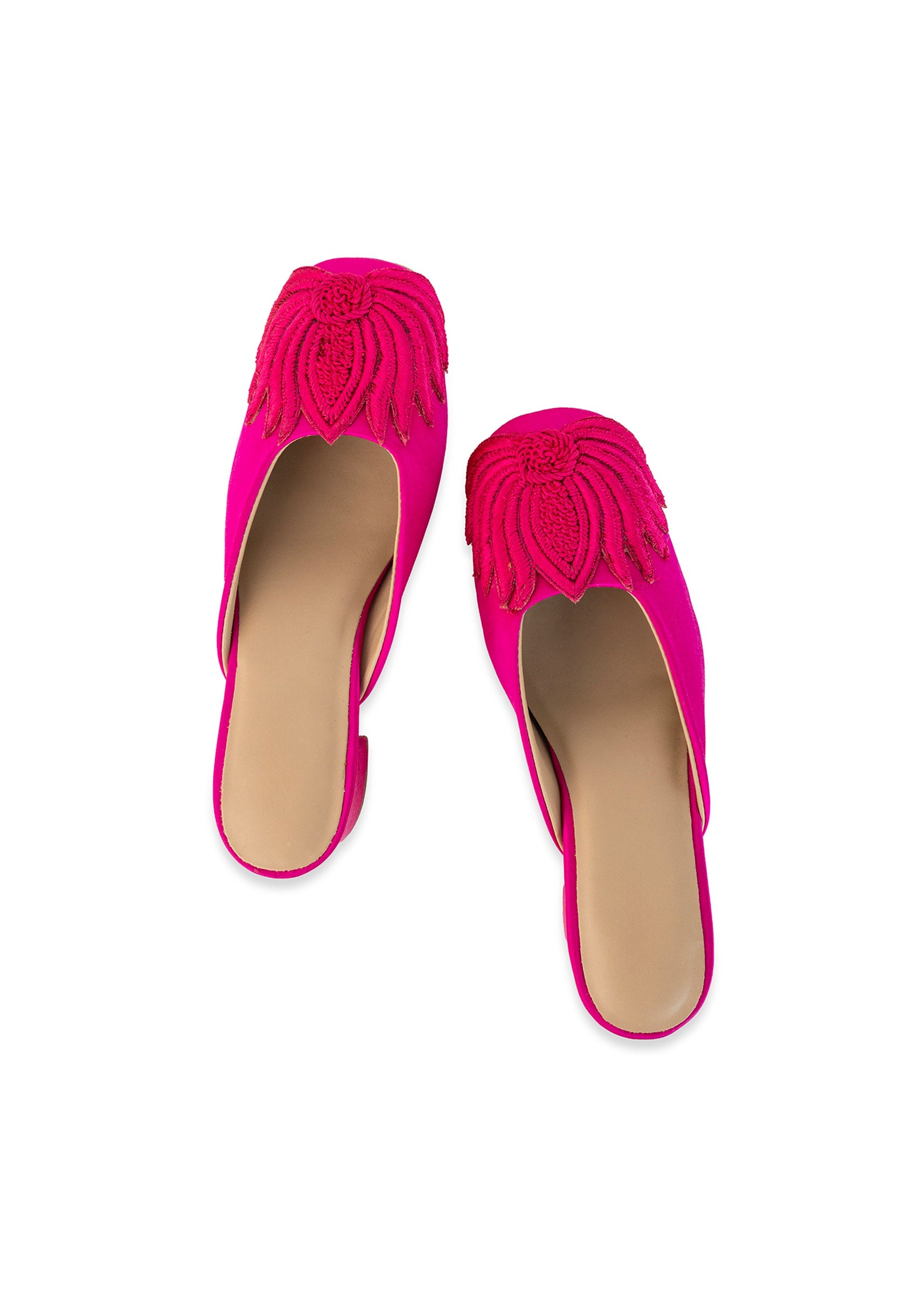Make a bold entrance with heel mules wrapped in luxurious fuchsia satin and crowned with an intricately embroidered lotus motif that instantly steals the spotlight. Set on sleek faux leather,... More Product Details