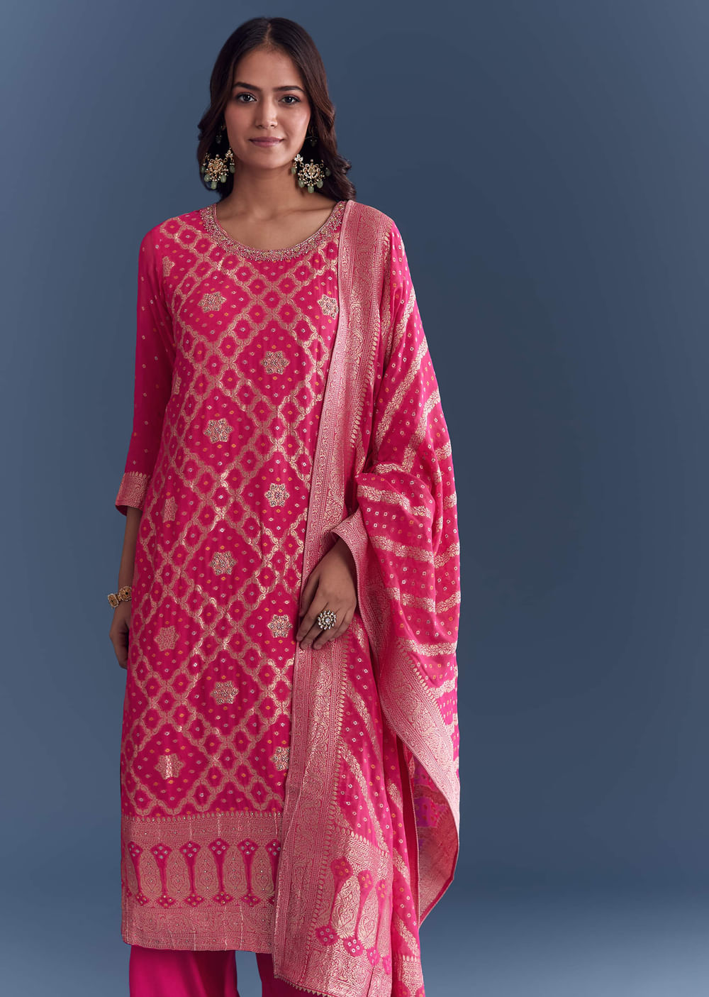 Pink Georgette Kurta Set With Bandhani Print And Jacquard Weave