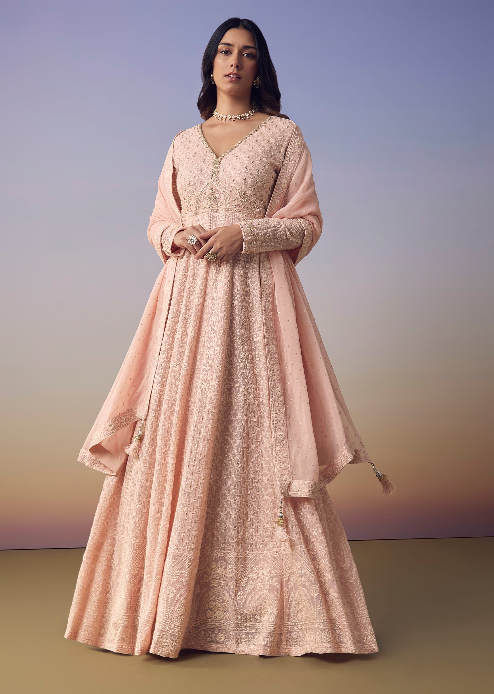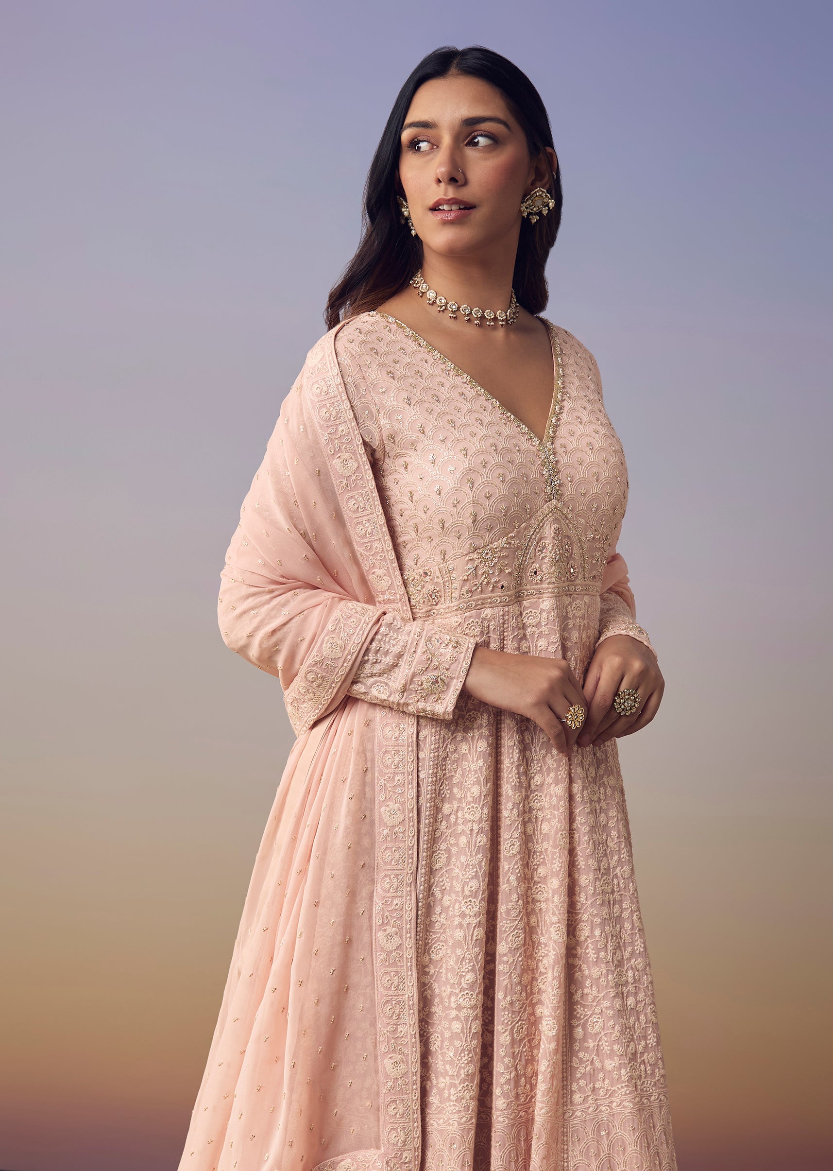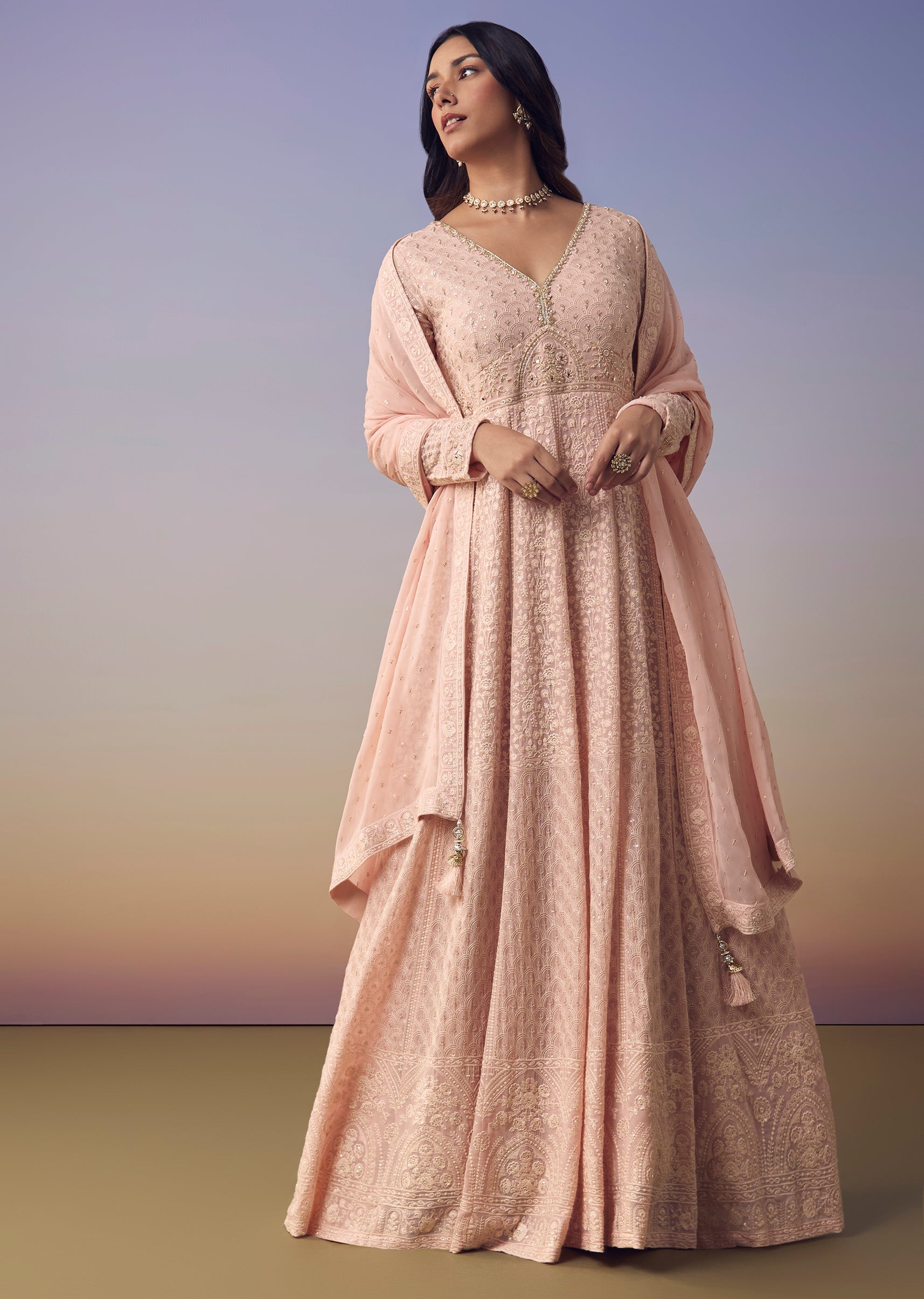 Step into feminine charm with this pink floor length anarkali crafted in airy georgette and embellished with shimmering sequins and delicate thread work that add a radiant festive touch. The... More Product Details