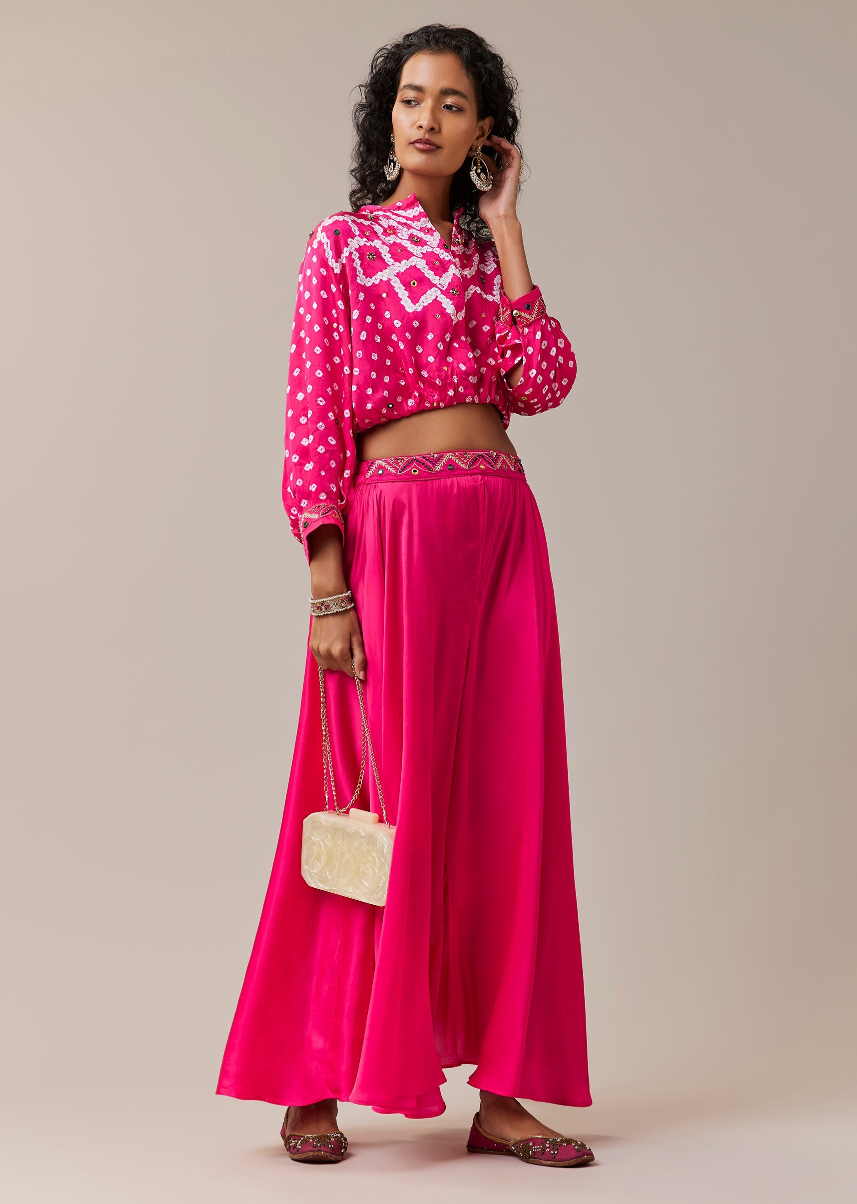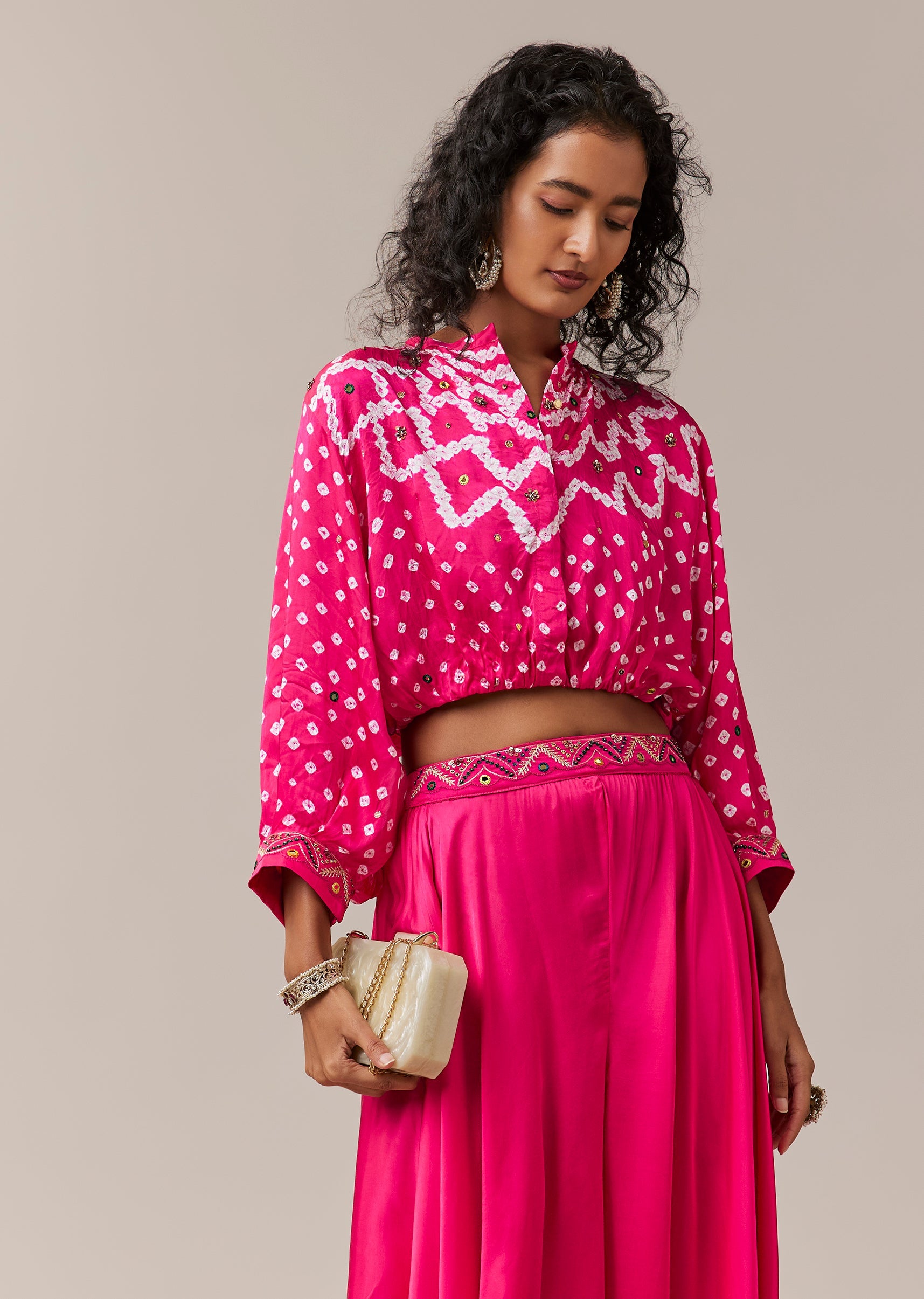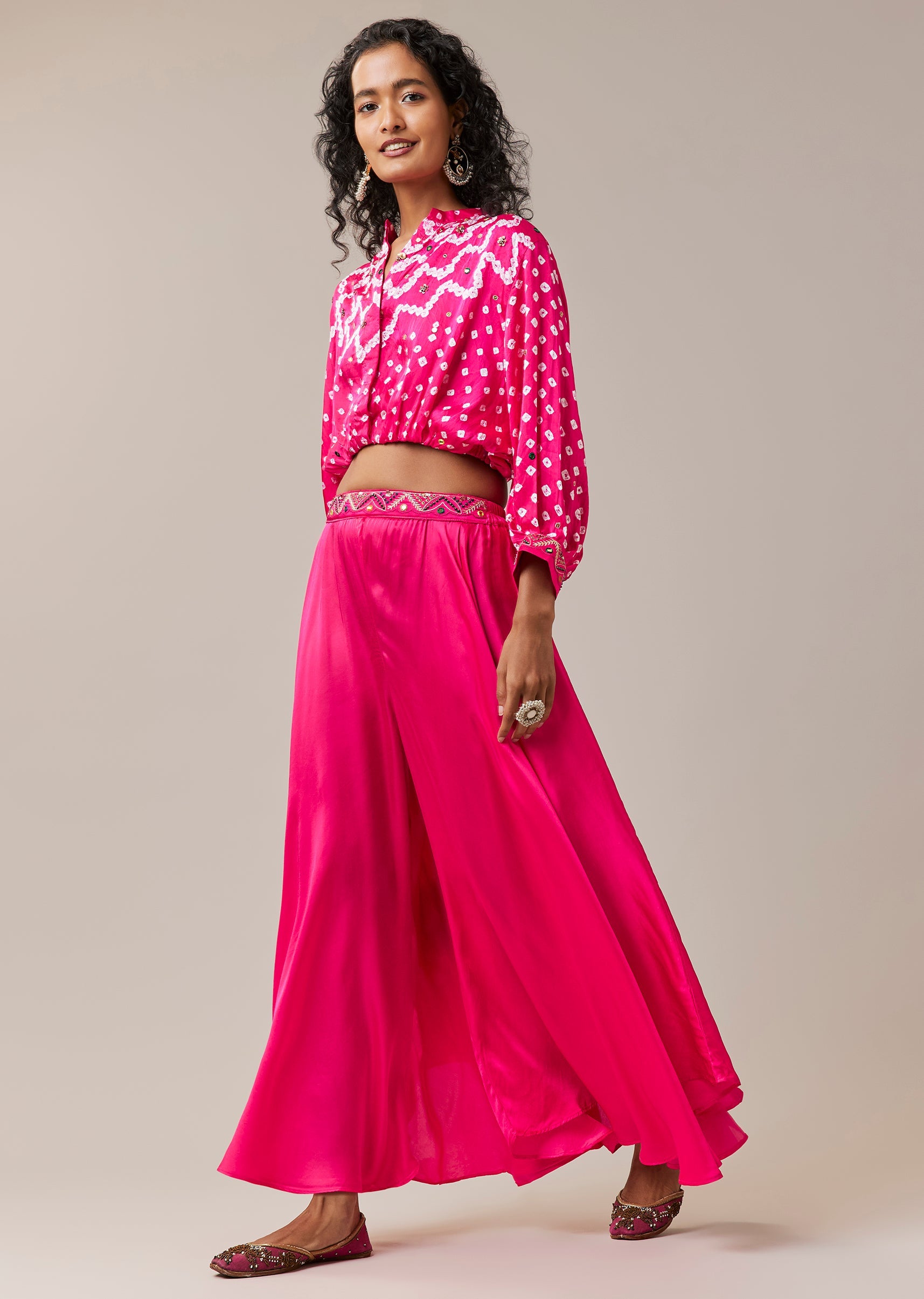 Pink Hand Dyed Bandhani Crop Top and Palazzo Set