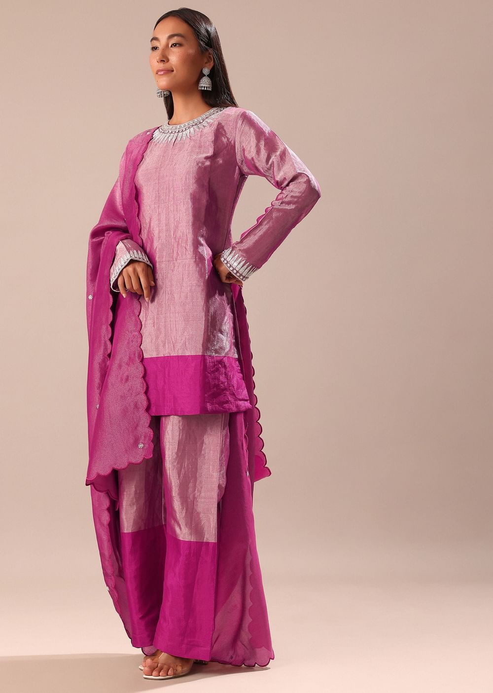 Radiate in the spotlight of our pink kurta palazzo set adorned with hand embroidered zardosi. This outfit is fabricated on a tissue base. The kurta is paired with a palazzo... More Product Details