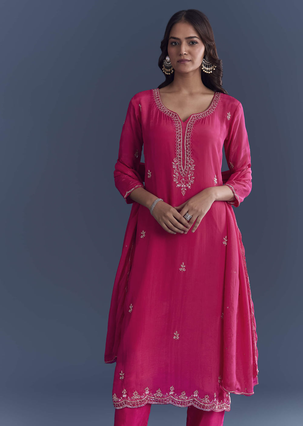 For comfort-first dressing that still shines, this pink hosiery kurta set pairs a soft, easy drape with sparkle. Cutdana and mirror work add precise highlights so the outfit feels festive... More Product Details