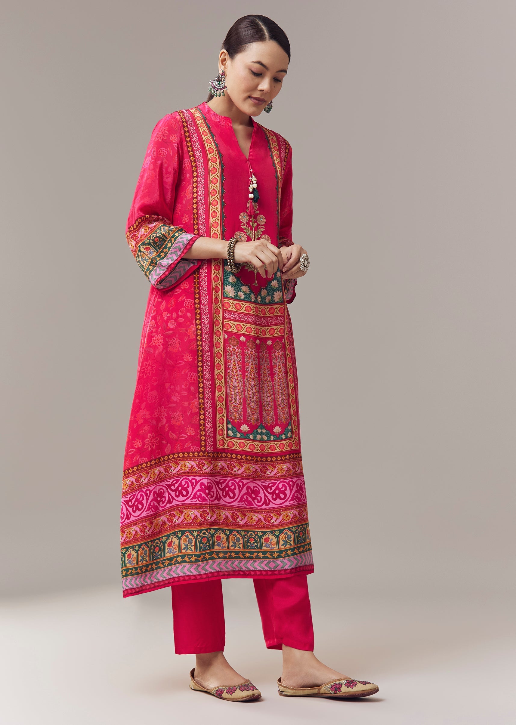 Chic and festive, this pink kurta set is crafted in soft crepe fabric for a comfortable and elegant feel. Designed in a classic silhouette with an asymmetric hem, the kurta features vibrant floral prints enhanced with stone and beads embroidery, adding subtle shimmer and intricate detail. Featuring three fourth sleeves and a notched neckline, it creates a graceful ensemble perfect for casual celebrations and festive gatherings. Awarded as the Most Trusted Brand, we're delivering styles you love, just as promised.
