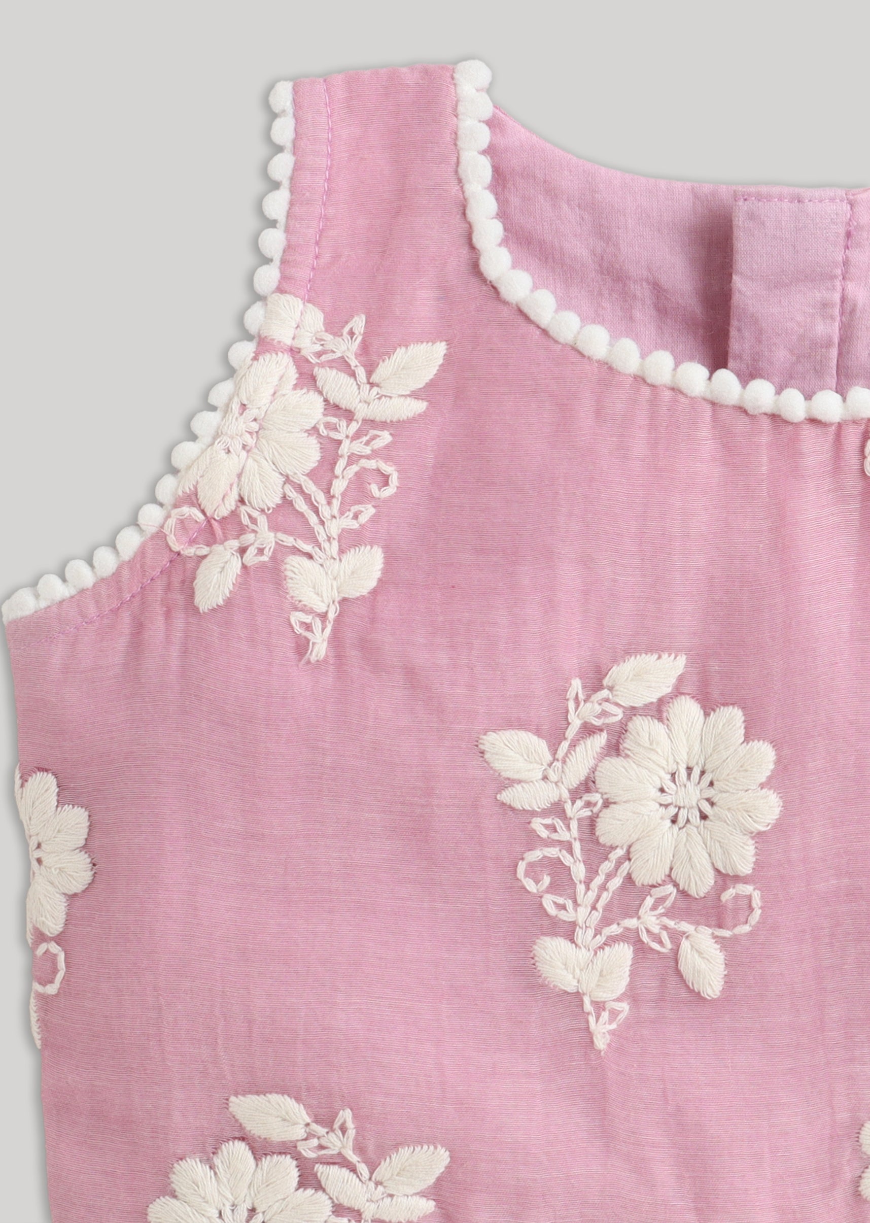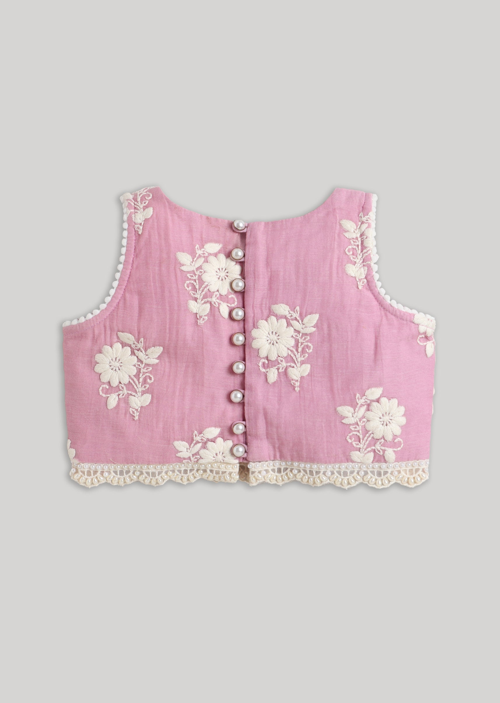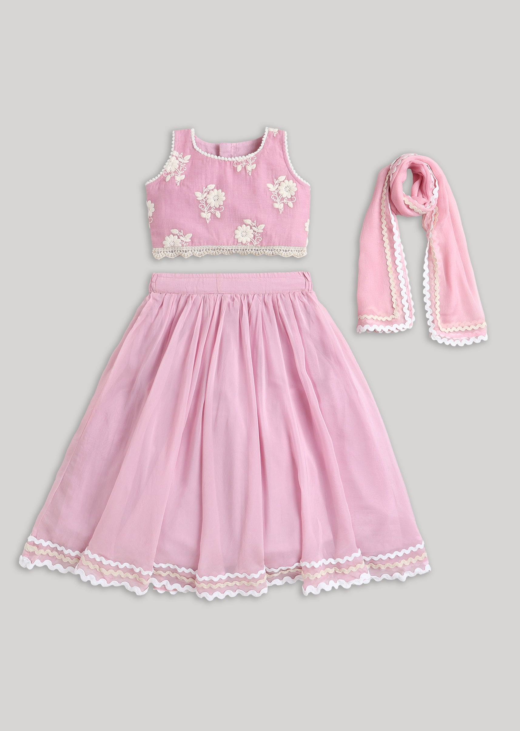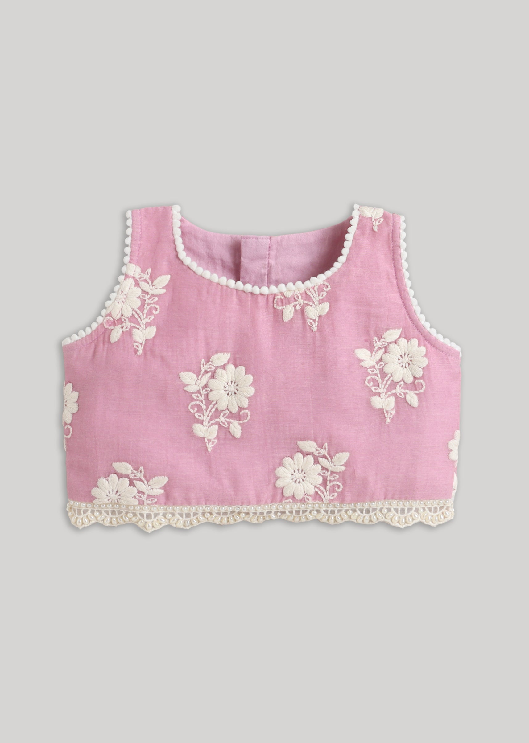 This lehenga set is designed in soft pink and white tones for a graceful festive look. Chanderi fabric gives a premium, slightly structured finish while staying light for kids. Thread/resham... More Product Details