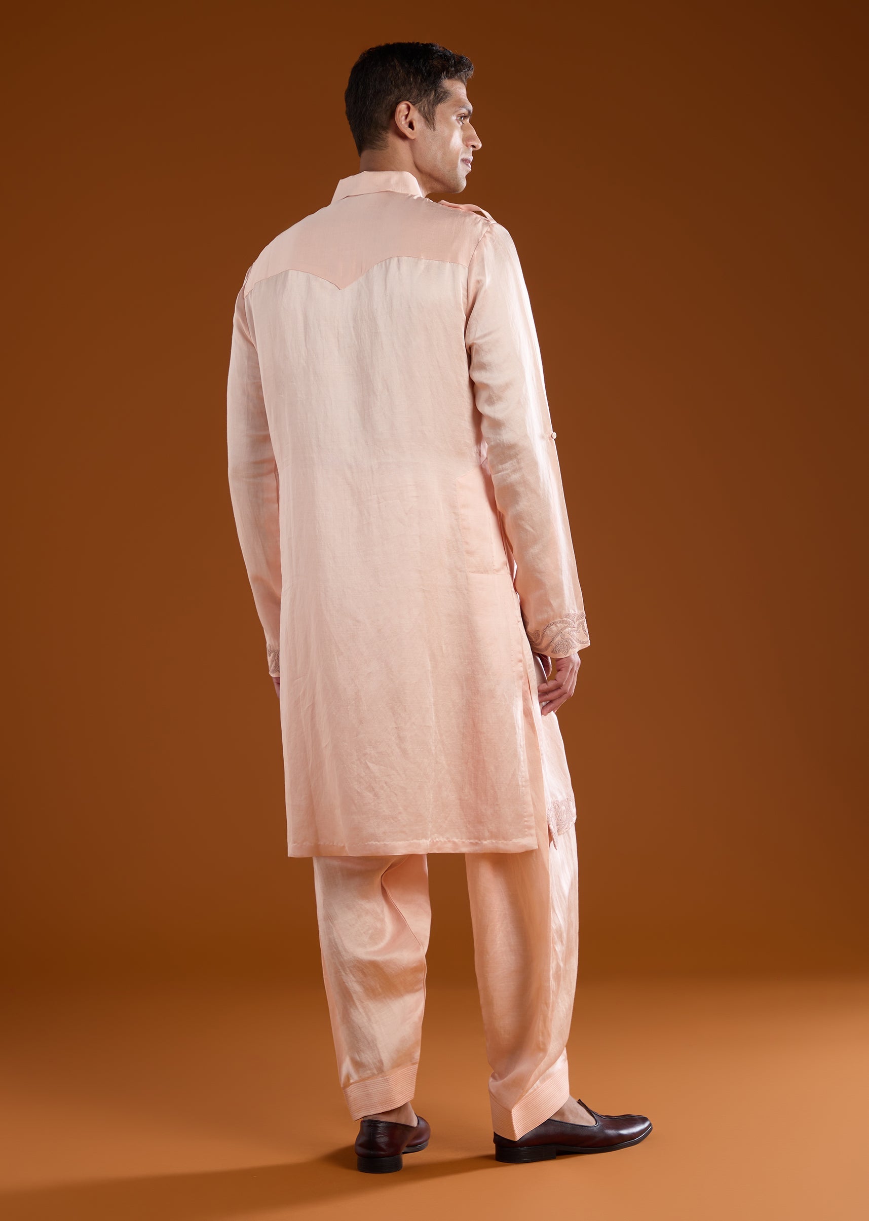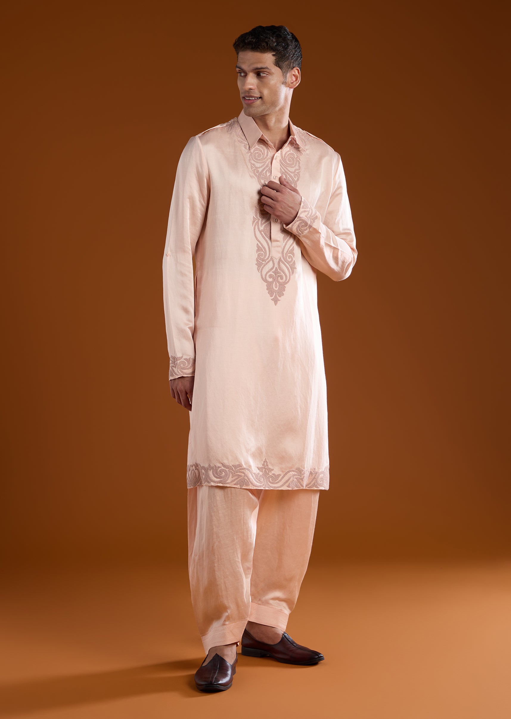 Bring effortless charm to festive dressing with this pink kurta set crafted in a refined blend of linen and satin, highlighted with elegant resham thread work and subtle dori detailing.... More Product Details