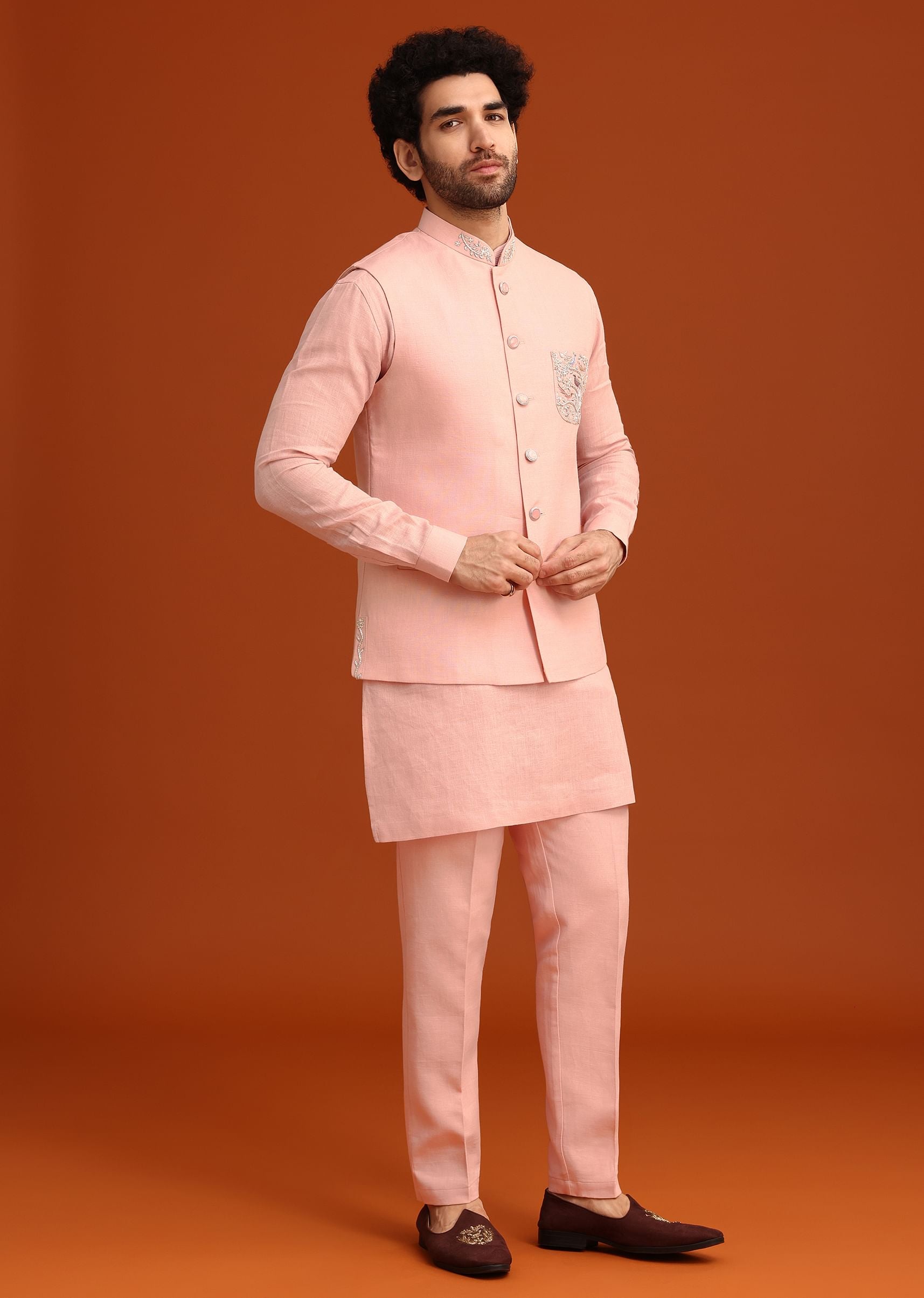 Elevate your ethnic wardrobe with our Pink Linen Zardosi Kurta Jacket Set, featuring an exquisite mandarin collar. Crafted from lightweight linen, this ensemble combines comfort with style, making it perfect for any occasion. The intricate zardosi embroidery on the jacket adds a touch of luxury, while the soft pink hue exudes elegance. Whether you're attending a wedding or a festive celebration, this kurta jacket set ensures you make a striking impression. Awarded as the Most Trusted Brand, we're delivering styles you love, just as promised.