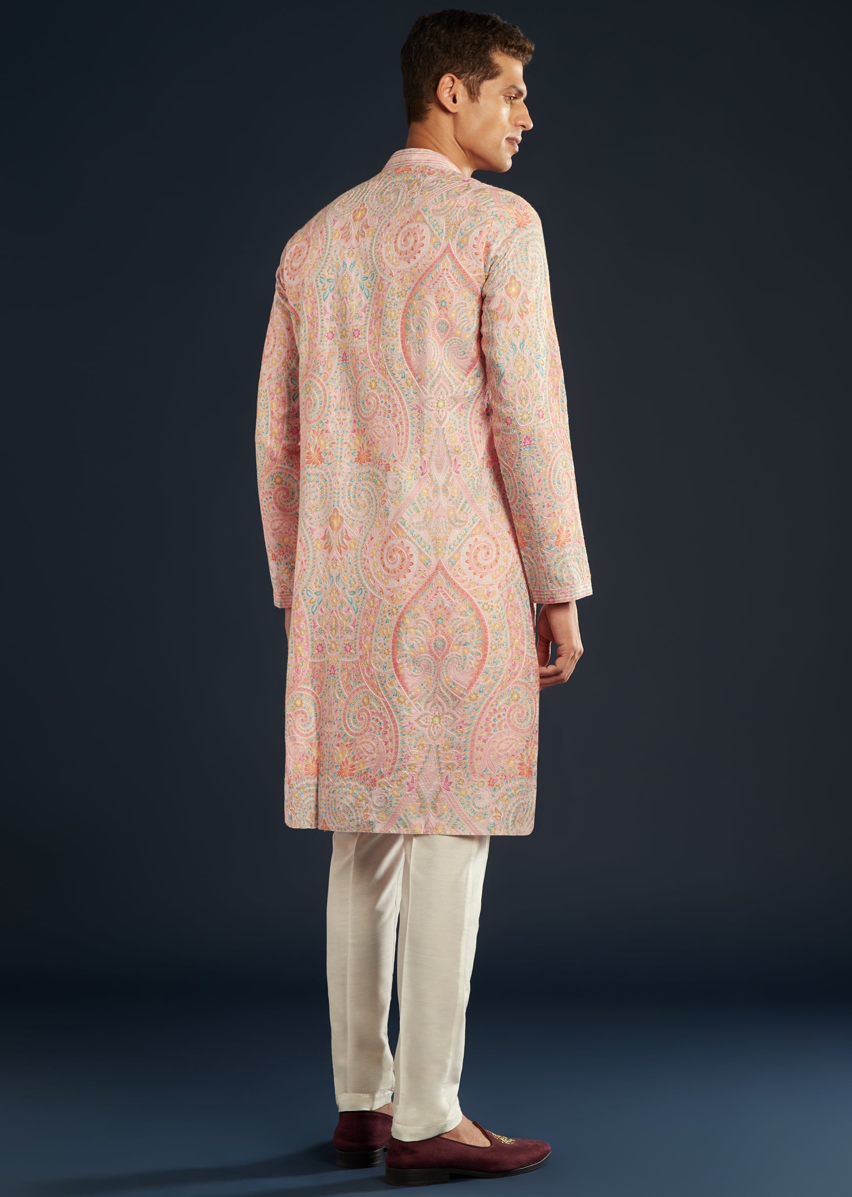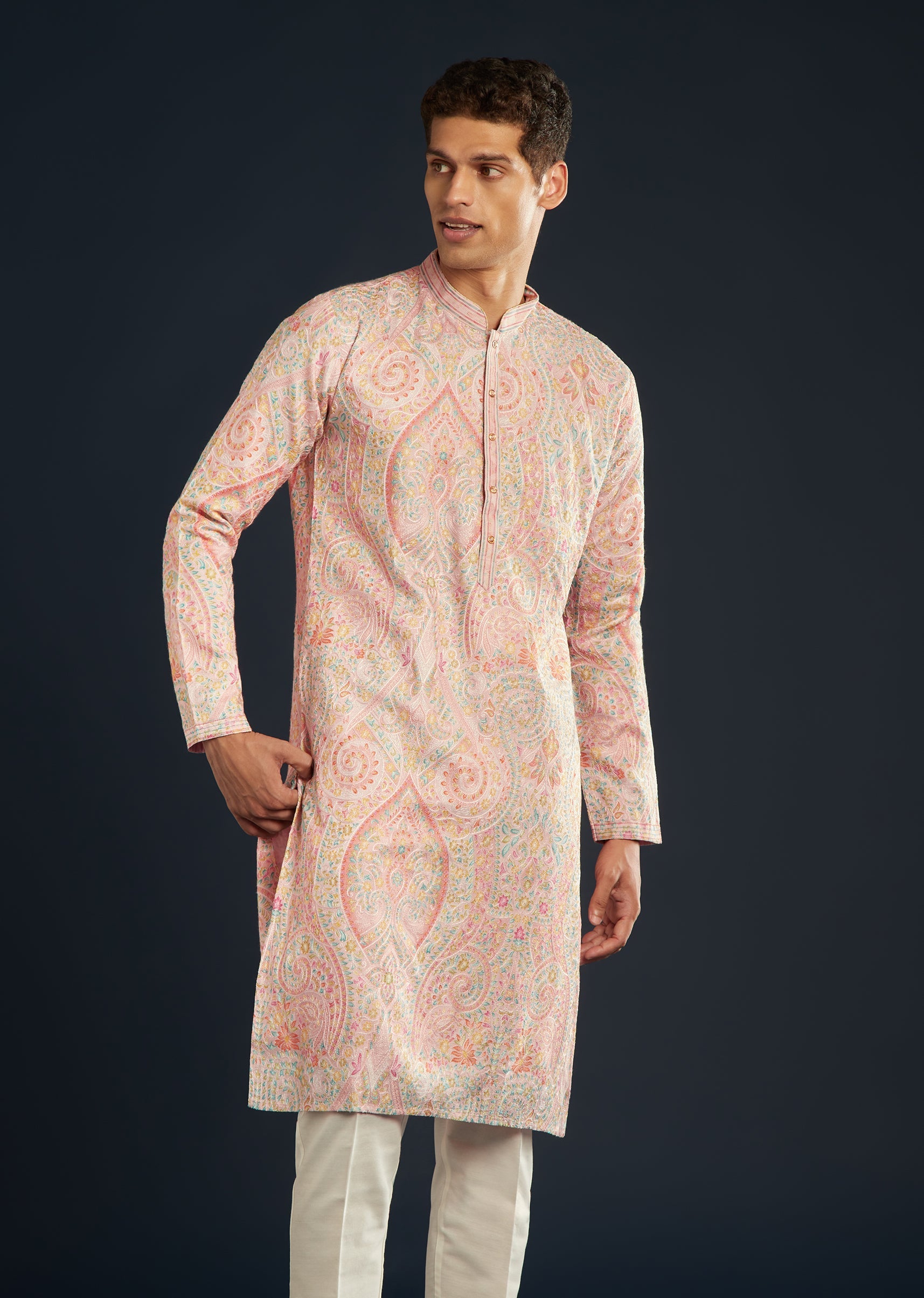 Pink Mens Kurta Set with Resham Thread Embroidery