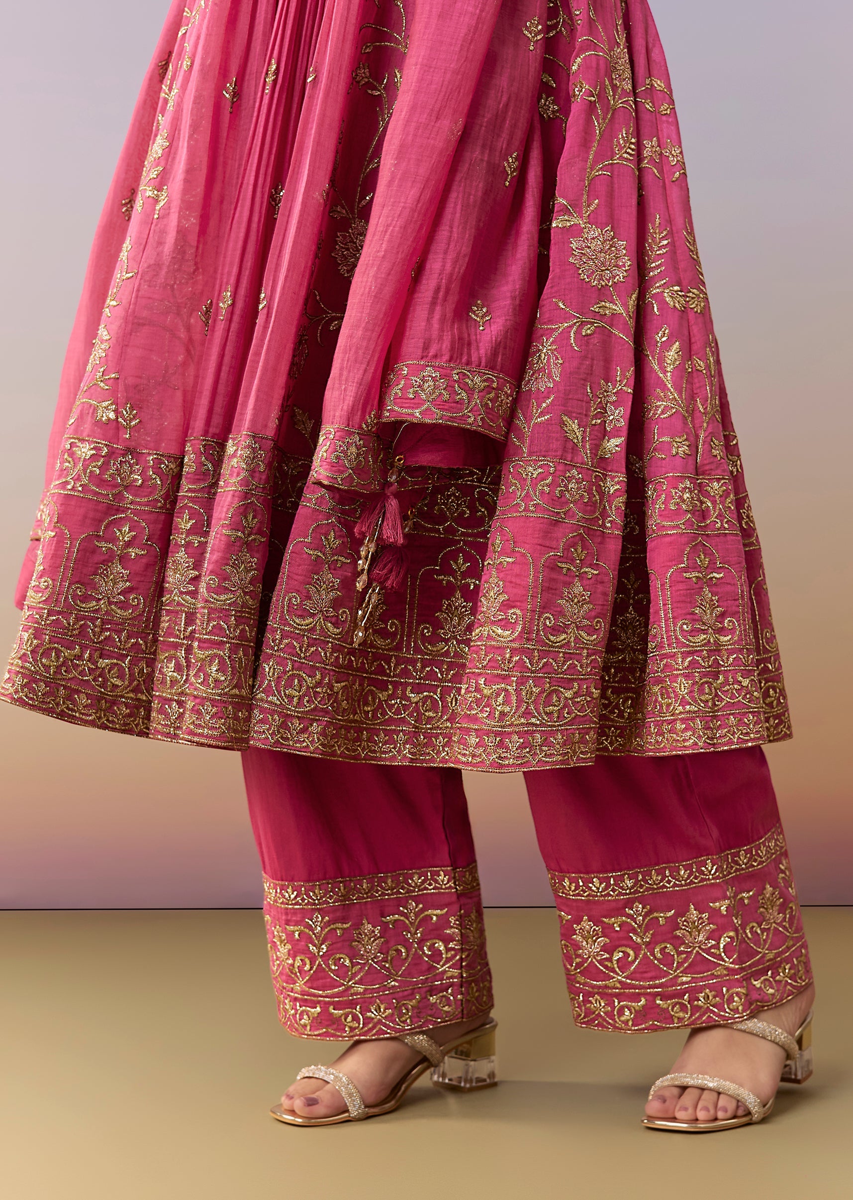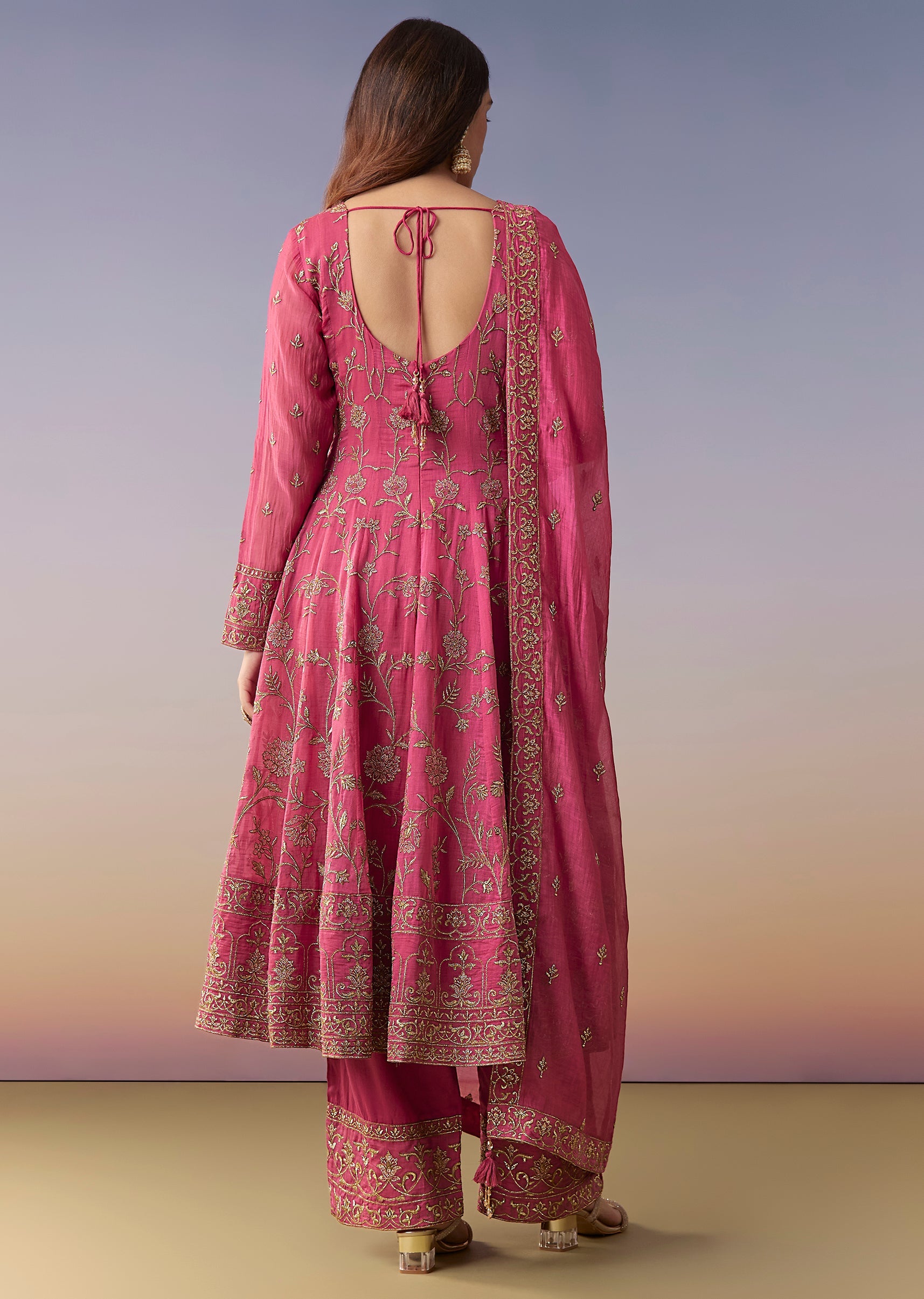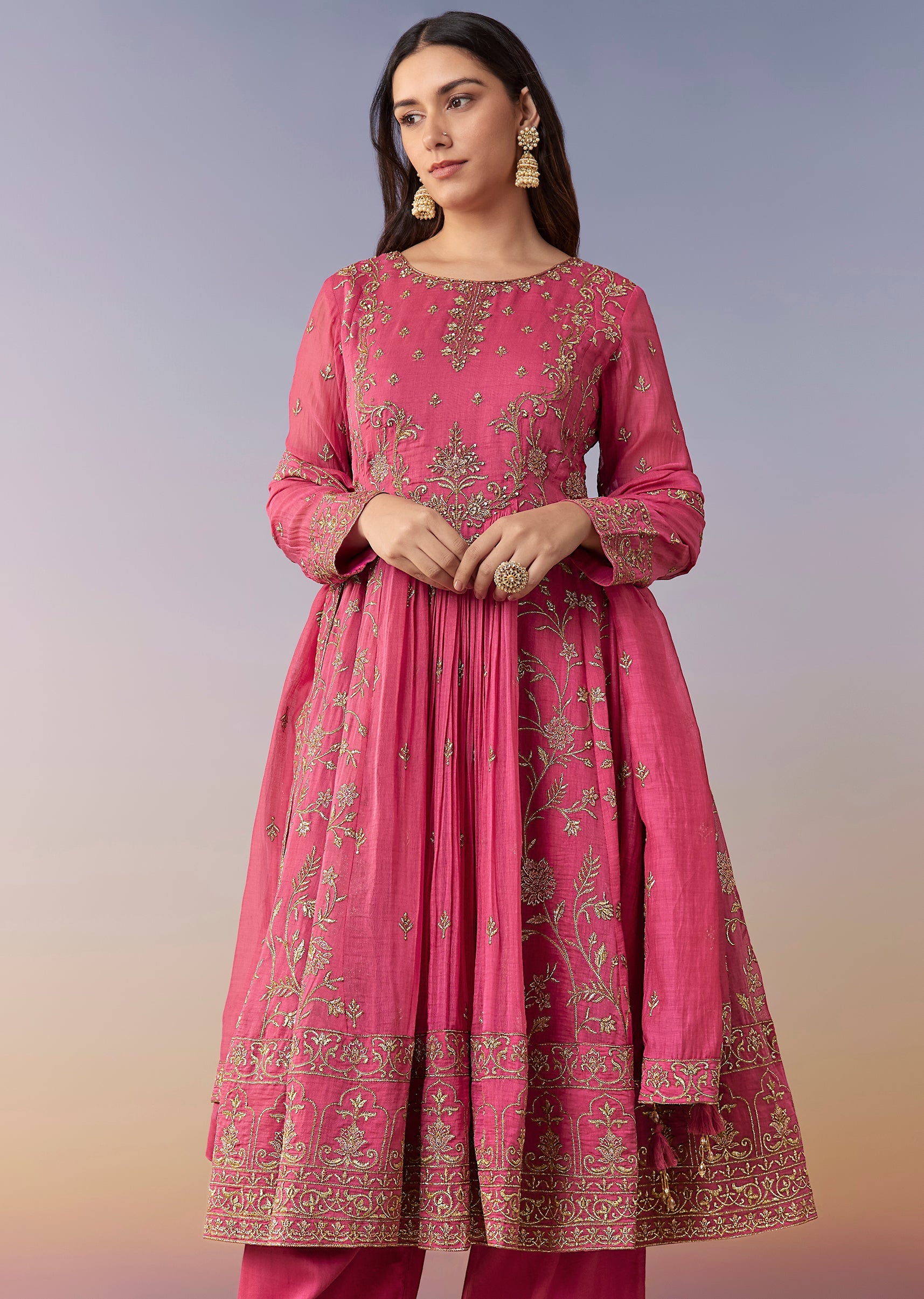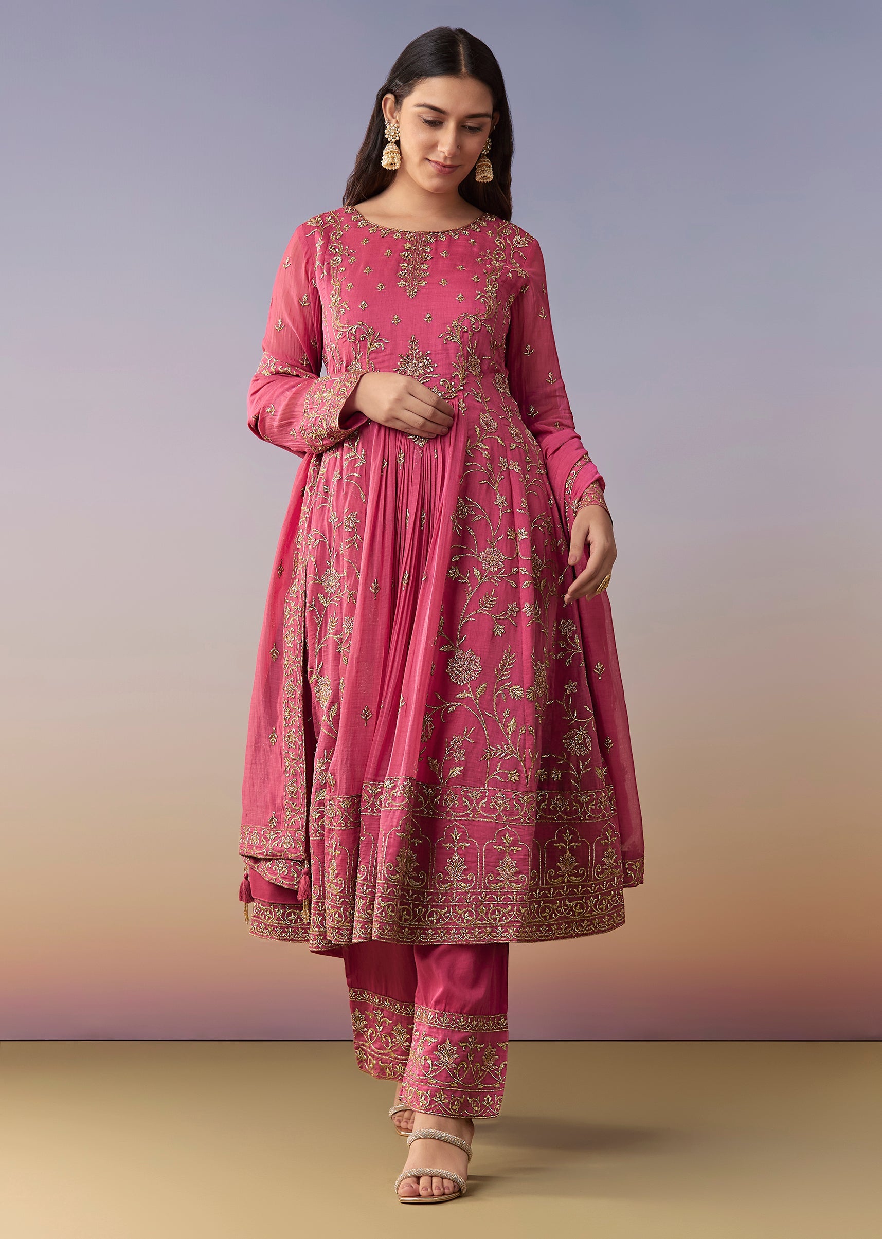Pink Metallic Embroidered Anarkali Suit Set With Pant And Dupatta