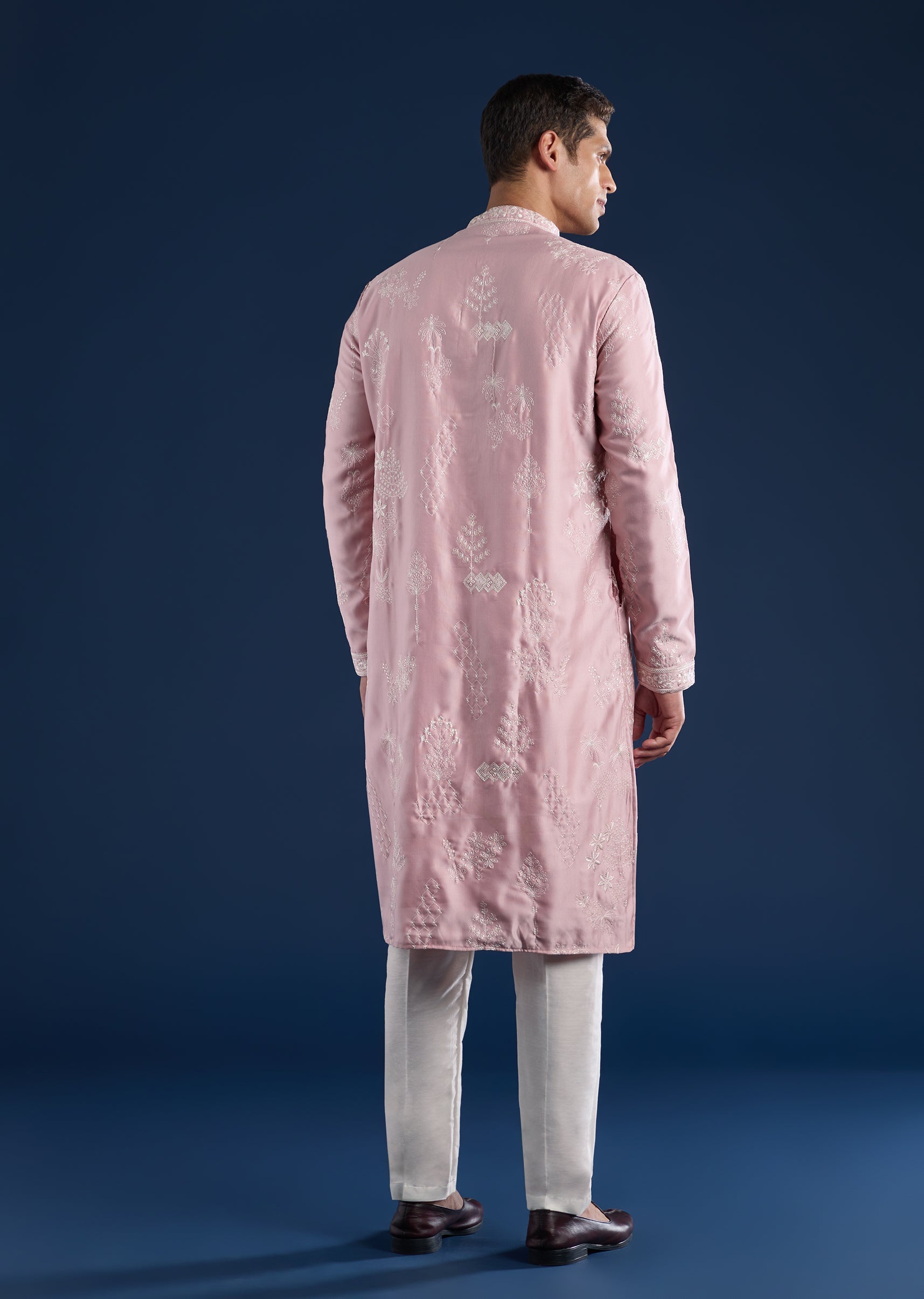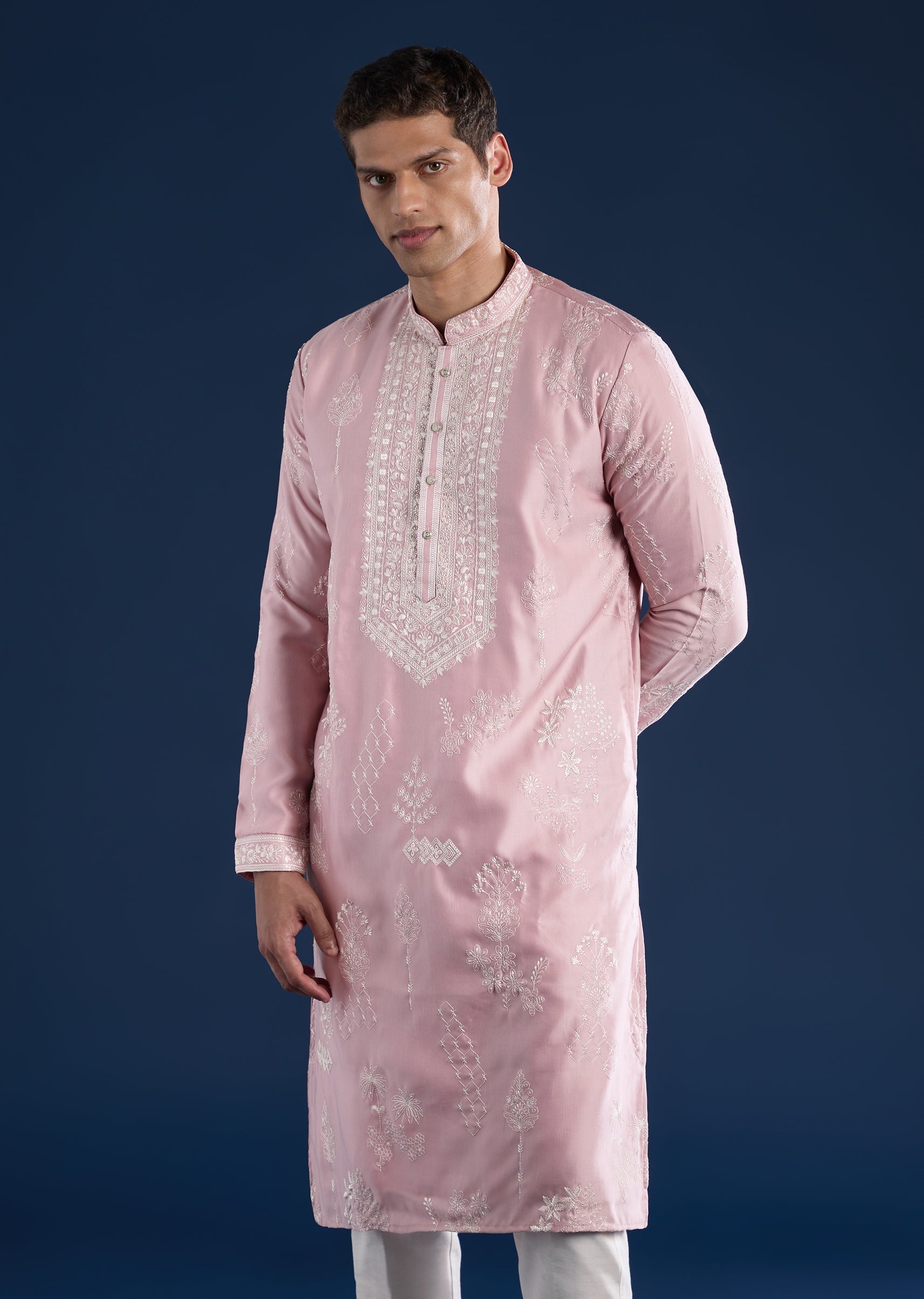 This pink kurta set is crafted in art silk with subtle resham detailing for a refined everyday-festive look. Featuring a mandarin collar, full sleeves, and side slits, it is paired... More Product Details