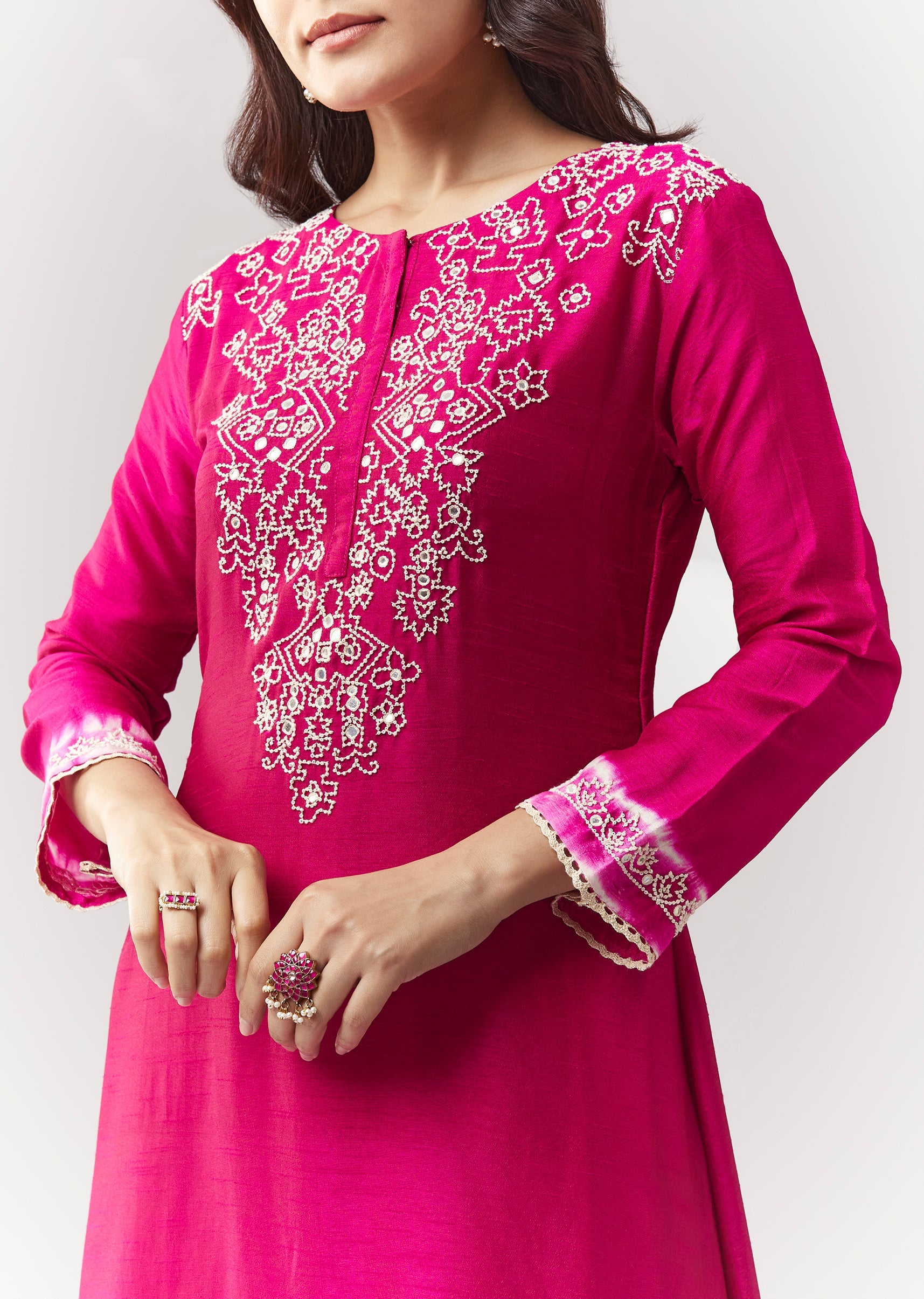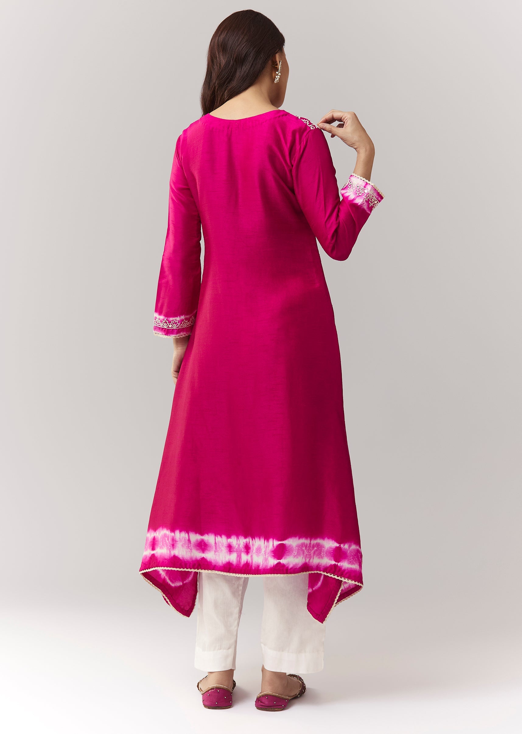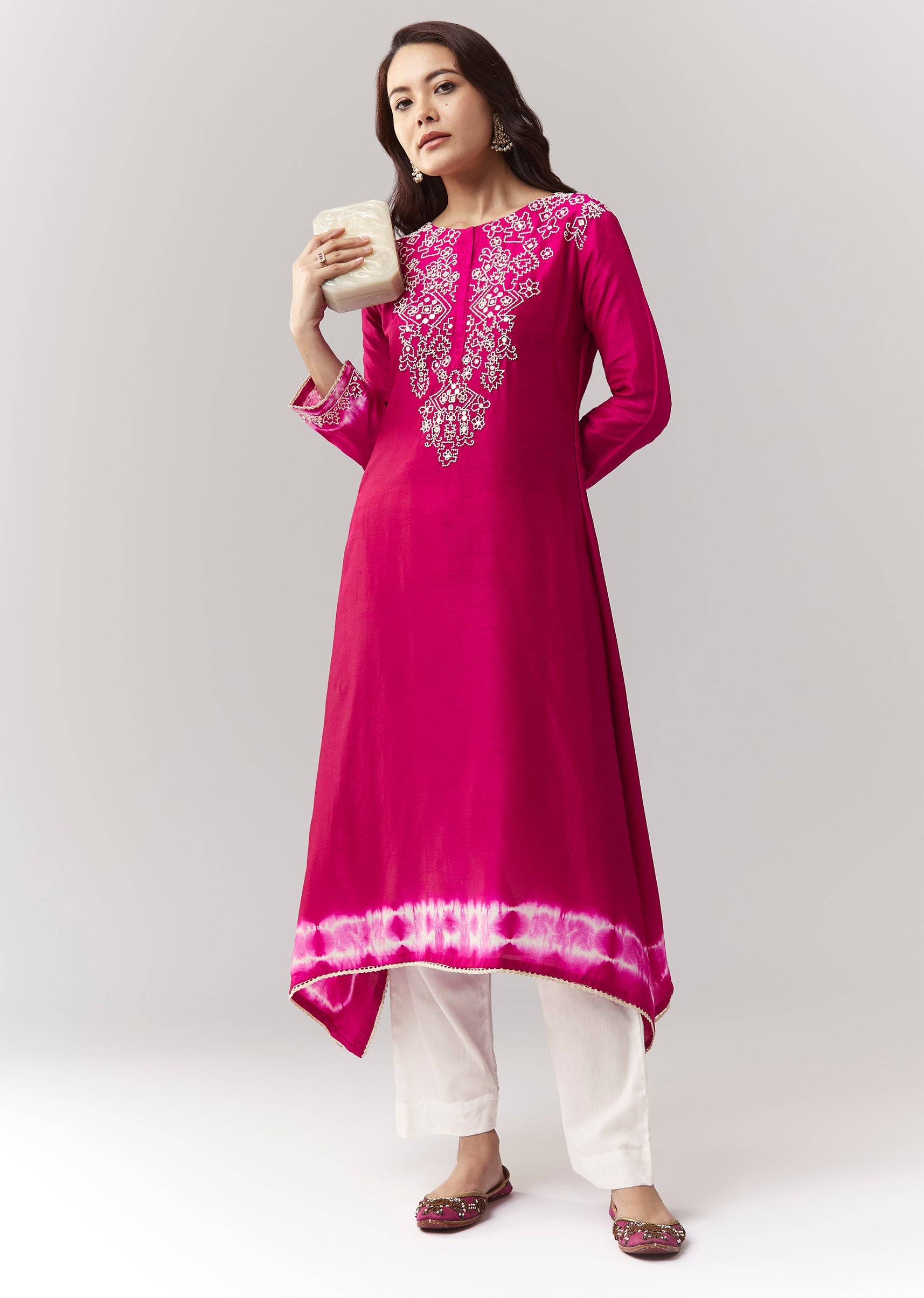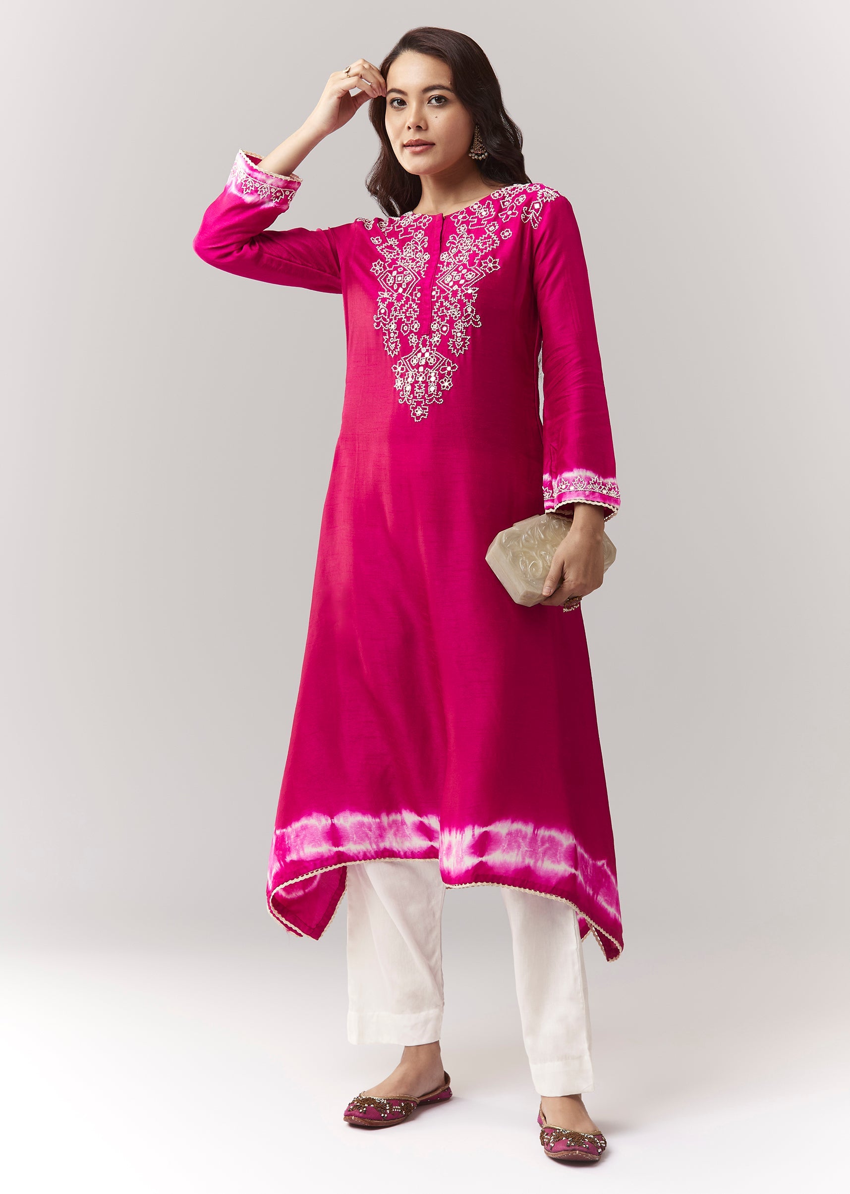 A minimal asymmetric co-ord with moti + mirror work on a dola silk kurta, finished with leheriya border, paired with straight pants (elasticated). Awarded as the Most Trusted Brand, we're... More Product Details
