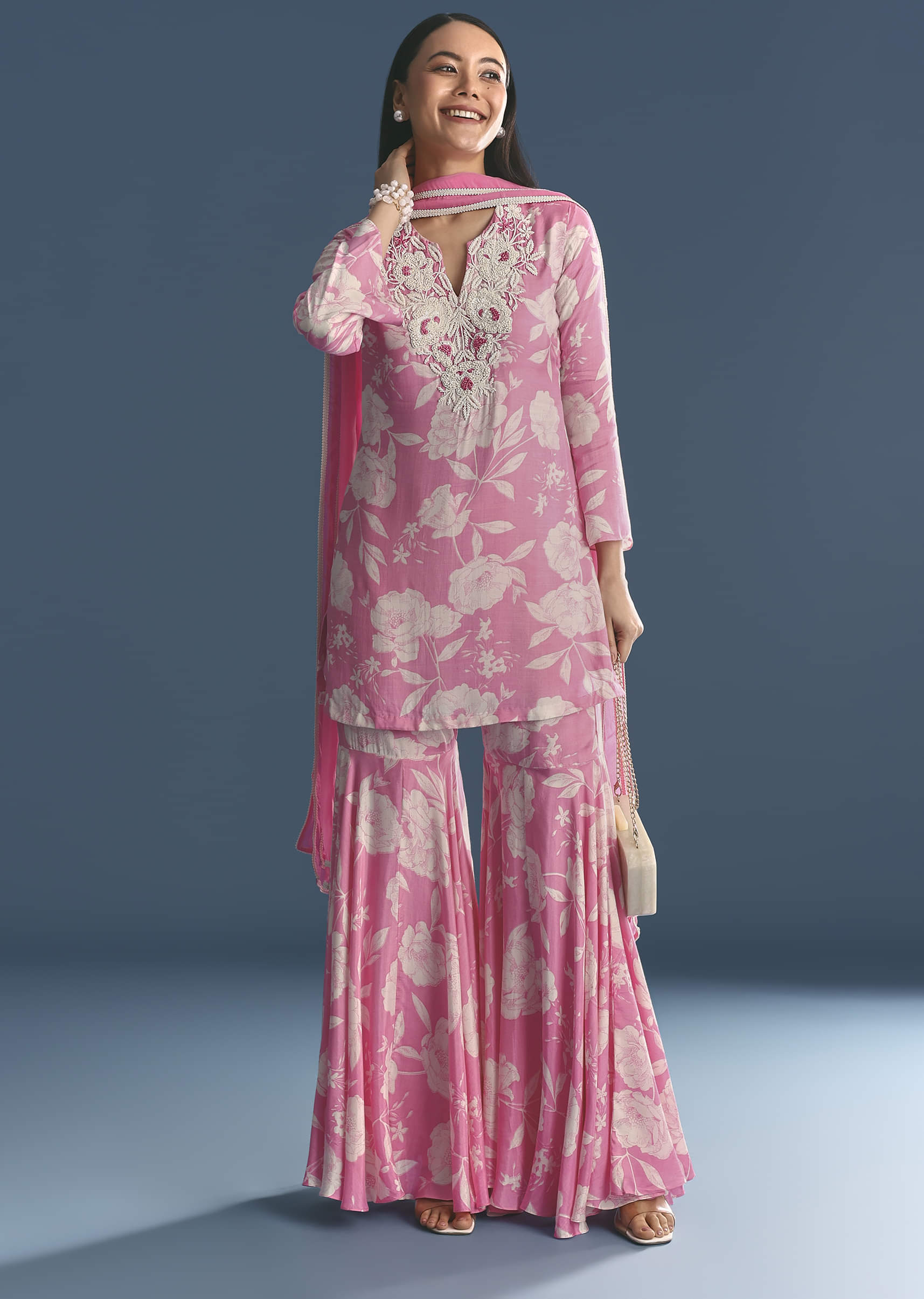 Pink Muslin Floral Print Kurta Sharara Suit With Moti Cutdana Work