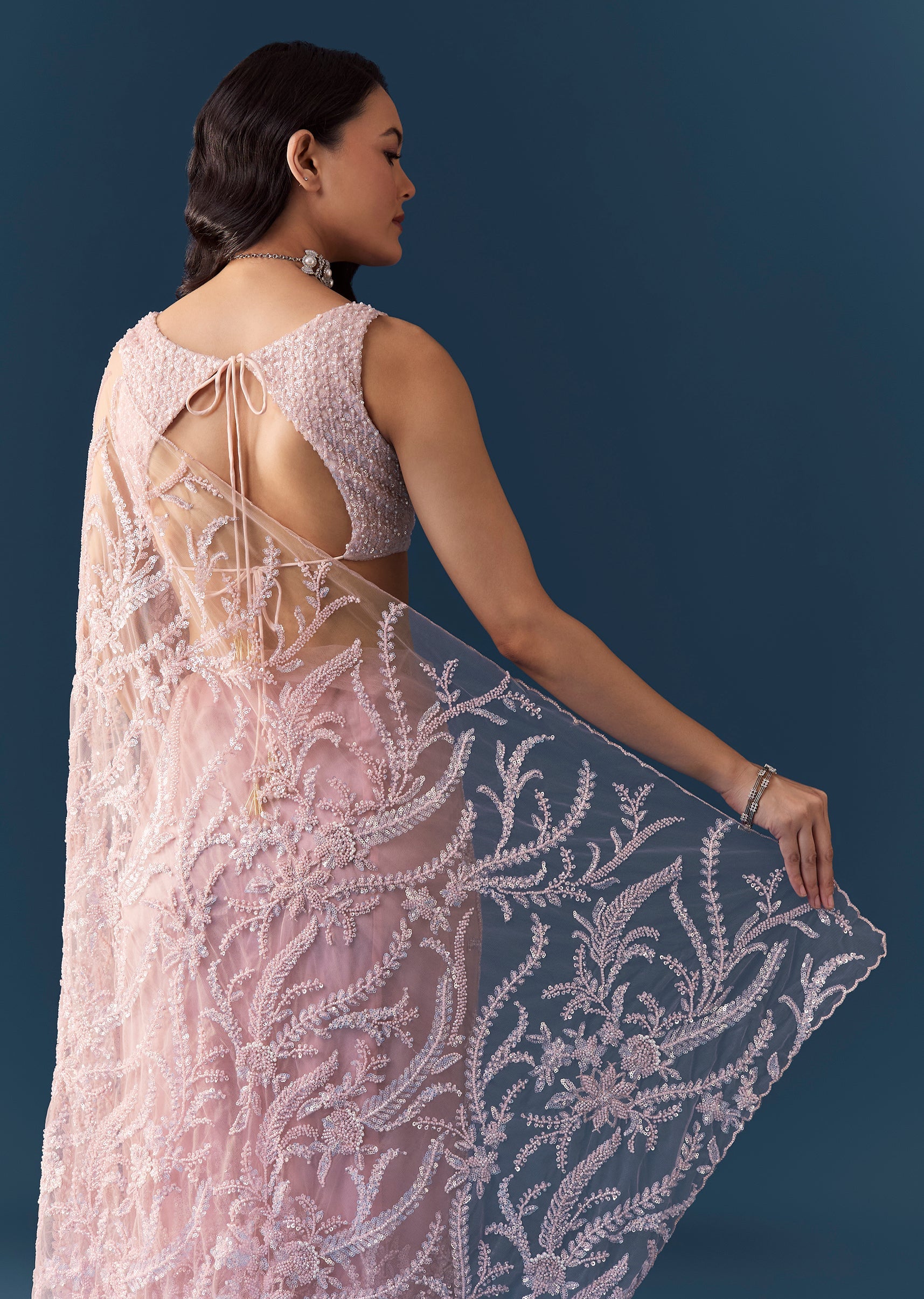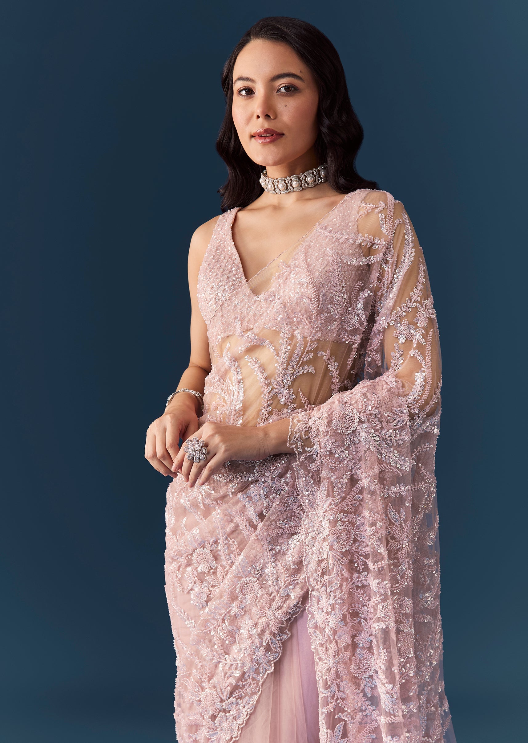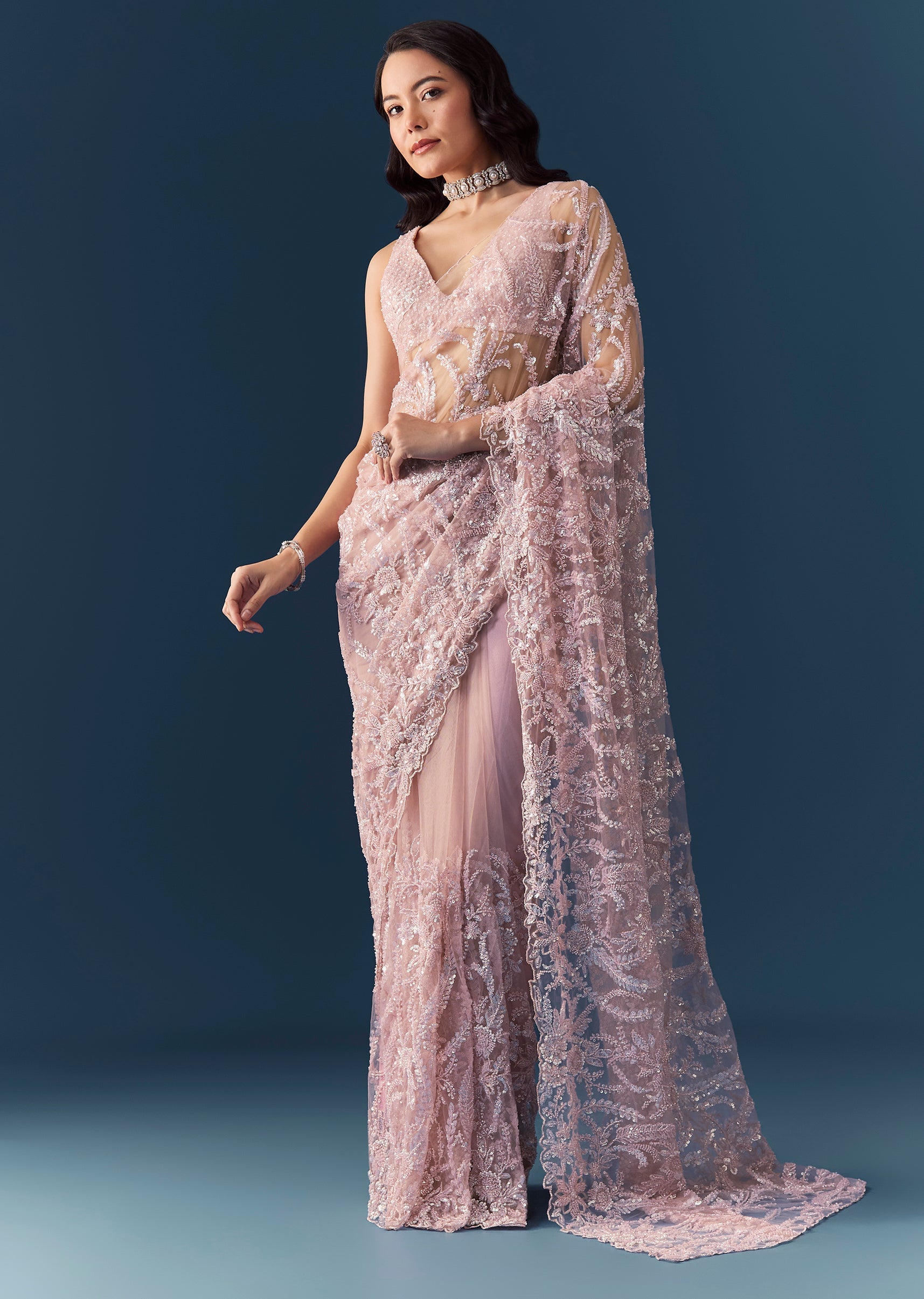Step into timeless elegance with this pink heavy embroidered net saree, featuring an exquisite floral jaal design all over, intricately crafted with cutdana, sequins, and beads. The beautifully detailed cutwork border adds an extra touch of luxury, while the heavy embroidered blouse fabric completes the ensemble with refined grandeur. Perfect for weddings, receptions, or festive celebrations, this saree embodies feminine grace and opulent craftsmanship. Awarded as the Most Trusted Brand, we're delivering styles you love, just as promised.