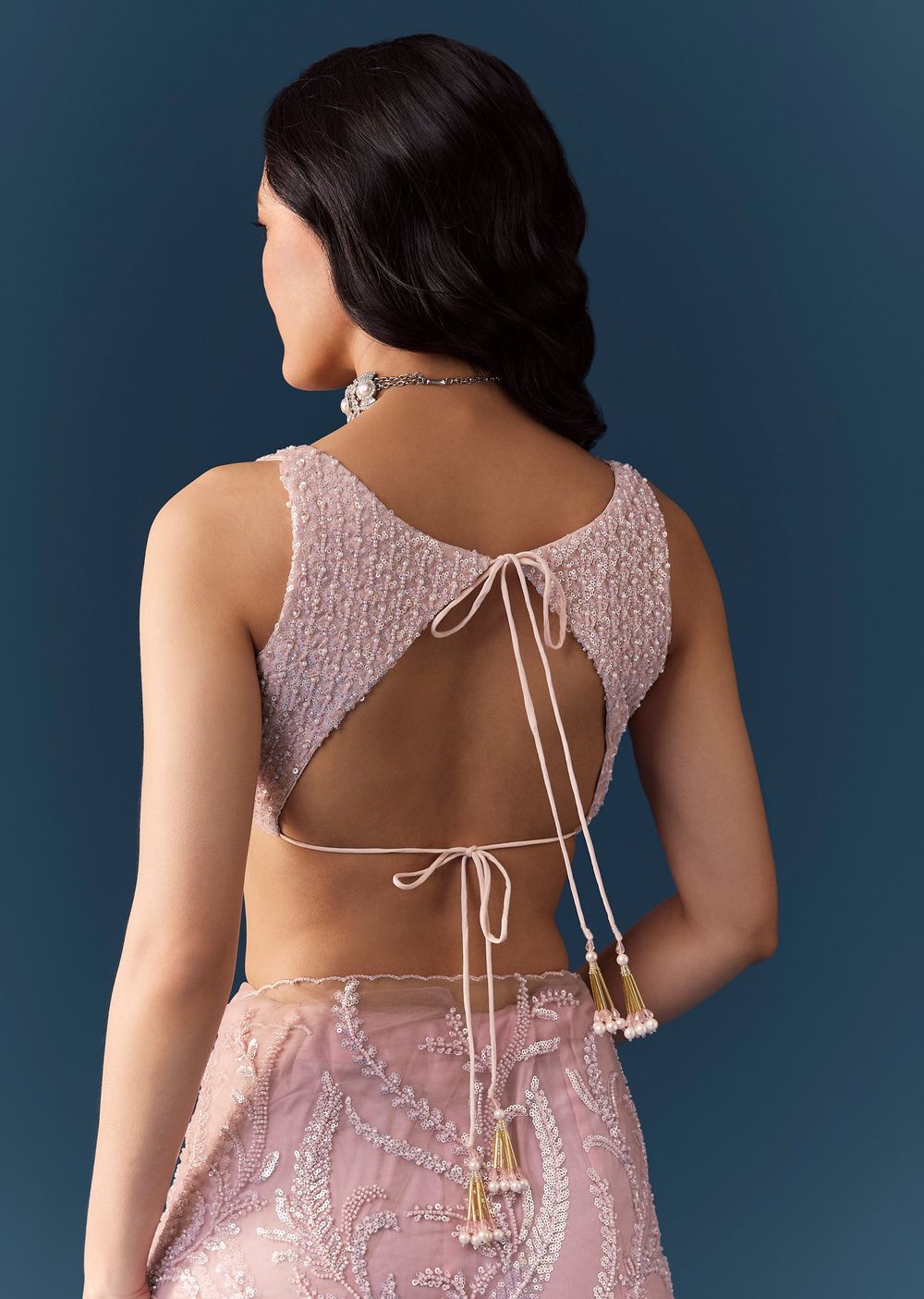 Pink Net Floral Jaal Work Saree with Unstitched Blouse