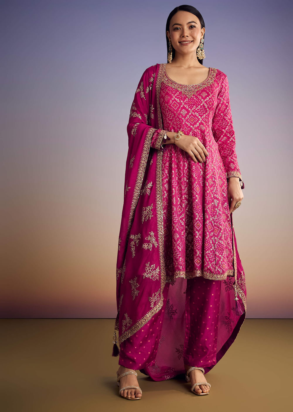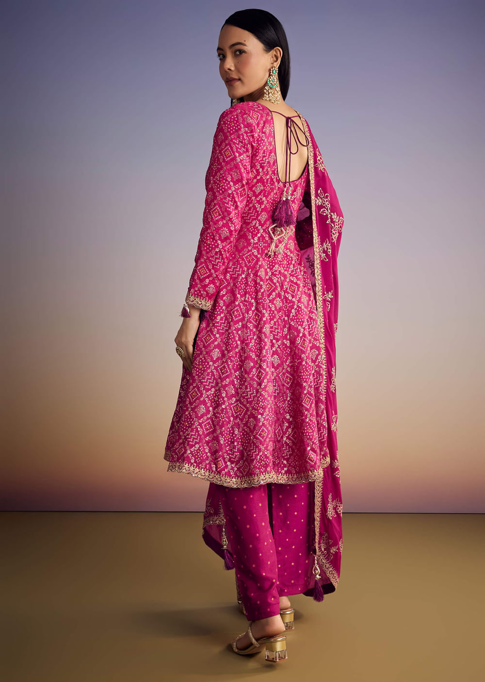 Pink Ombre Bandhani Anarkali Suit With Zardosi Neckline