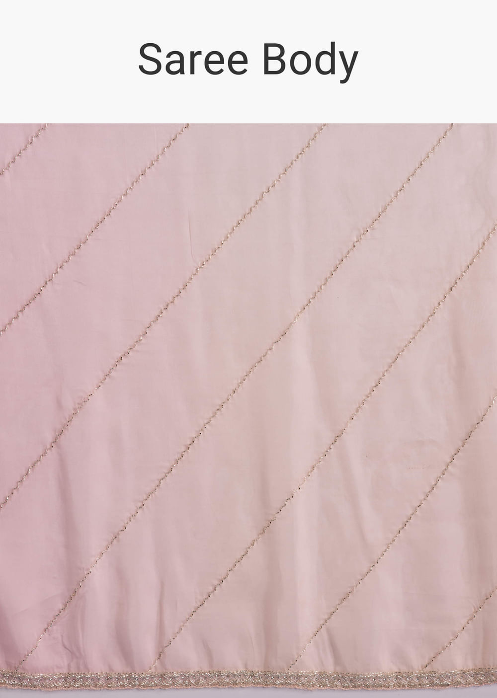 Light as air, this pink organza saree shows cross stripes embroidered in cutdana with fine sequin accents for a gentle shimmer. The sheer fall keeps movement easy through long functions.... More Product Details