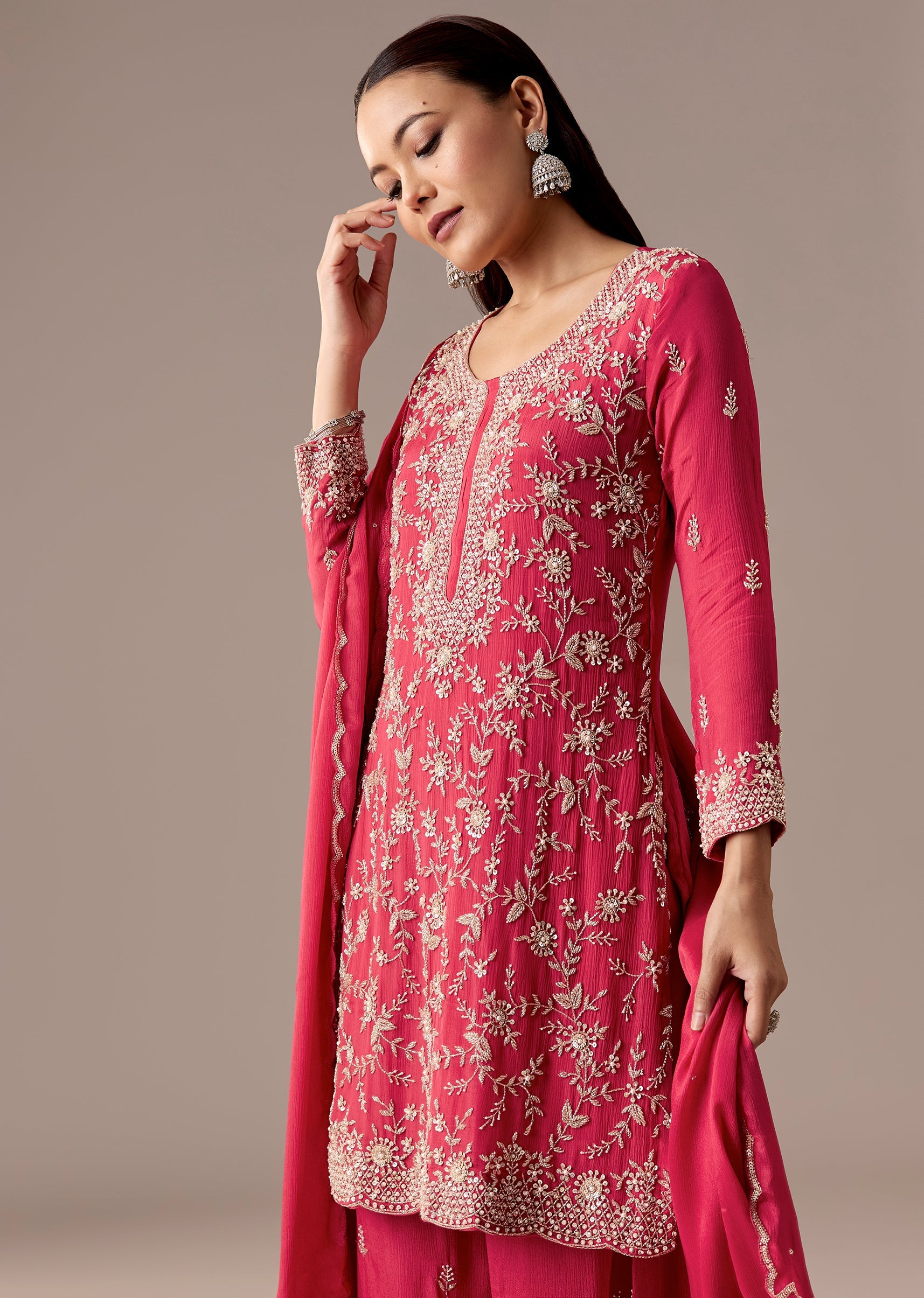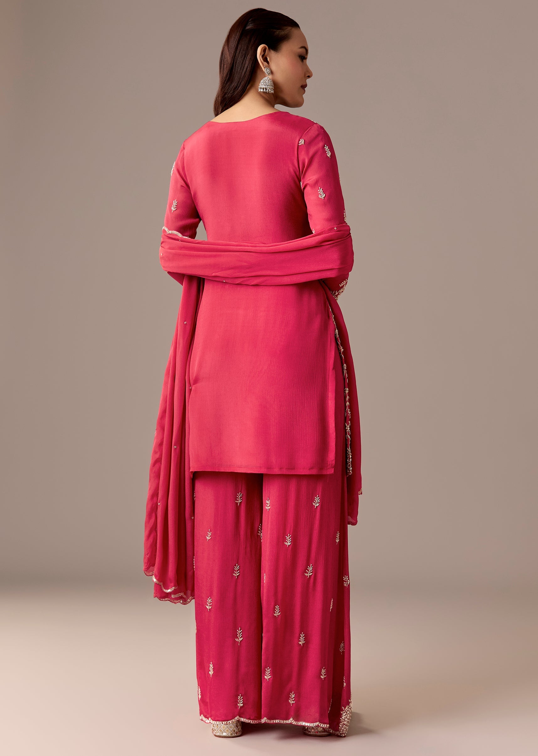 A classic pink chinon palazzo suit with a cut-dana embellished straight kurta, paired with palazzos and a matching dupatta. 3/4th sleeves, side slits, and a clean festive fall—ideal for engagement... More Product Details