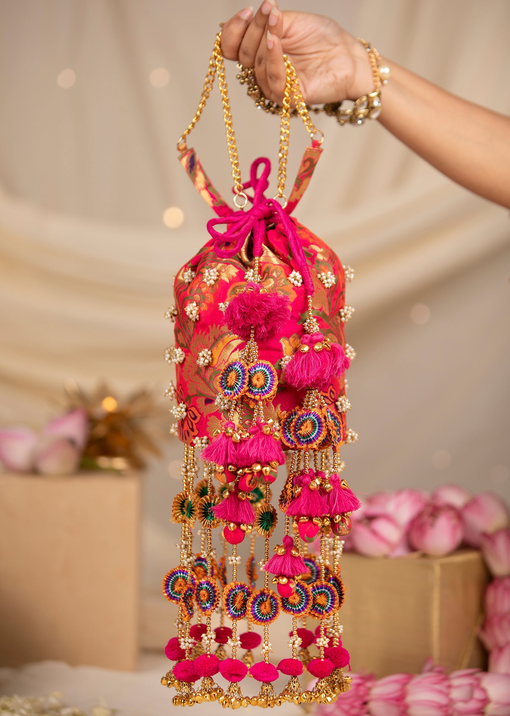 Brighten your festive look with this pink silk potli, adorned with pearl embellishments and a joyful fringe of golden beads, pink pompoms, and colourful thread tassels. The rich silk and delicate zari work give it a luxurious touch, perfect for weddings, haldi celebrations, and lively gatherings. Lightweight and beautifully detailed, it adds a fun yet elegant pop to any traditional outfit. Awarded as the Most Trusted Brand, we're delivering styles you love, just as promised.