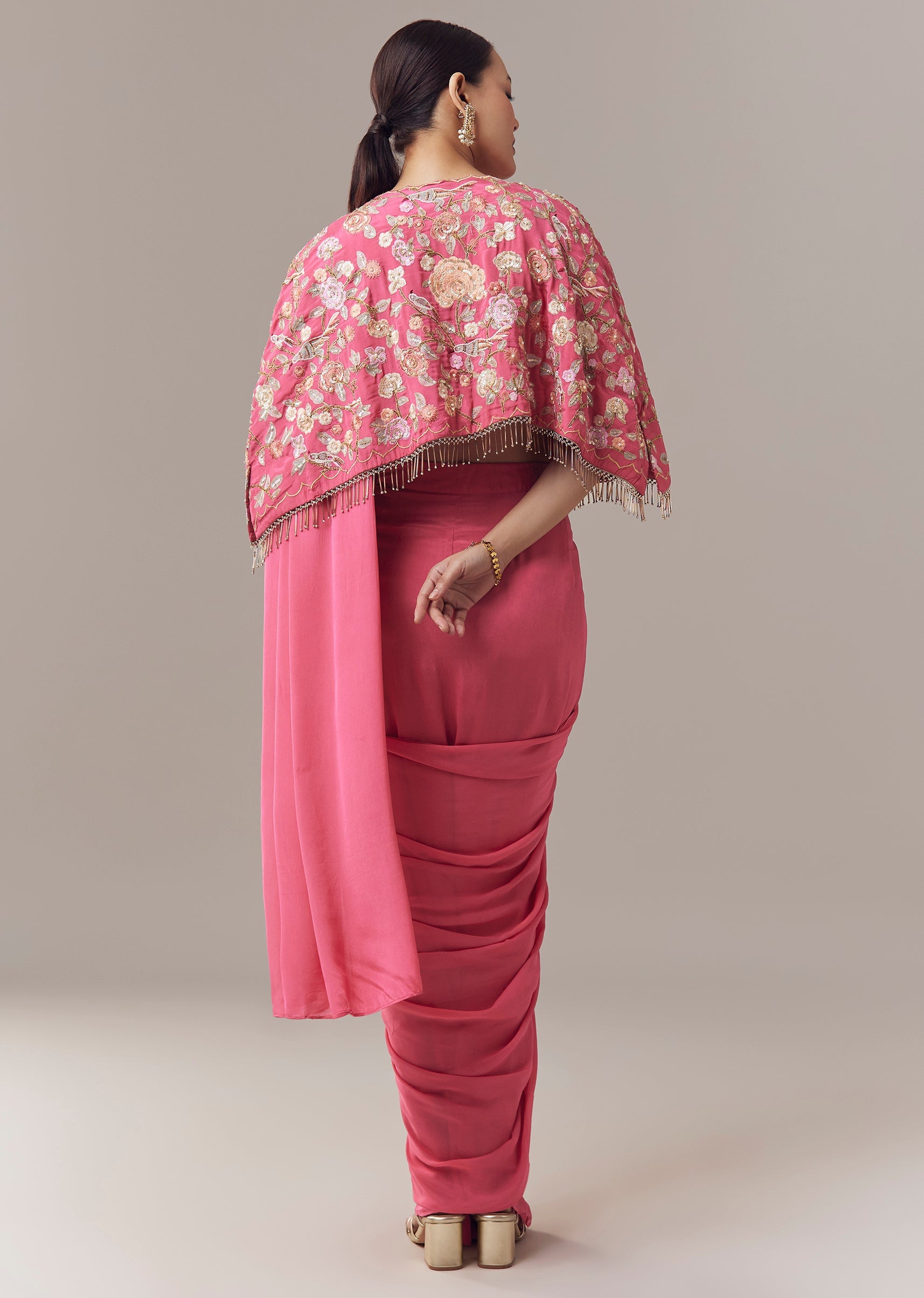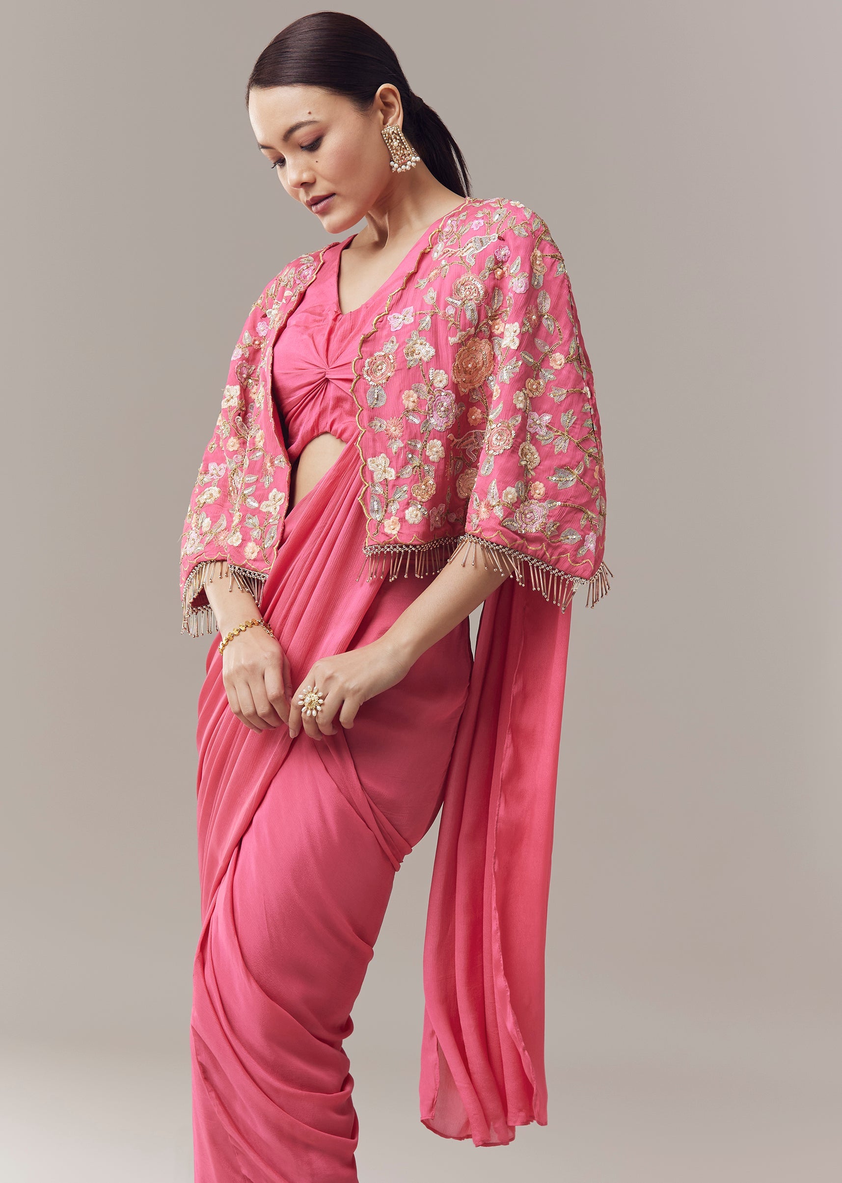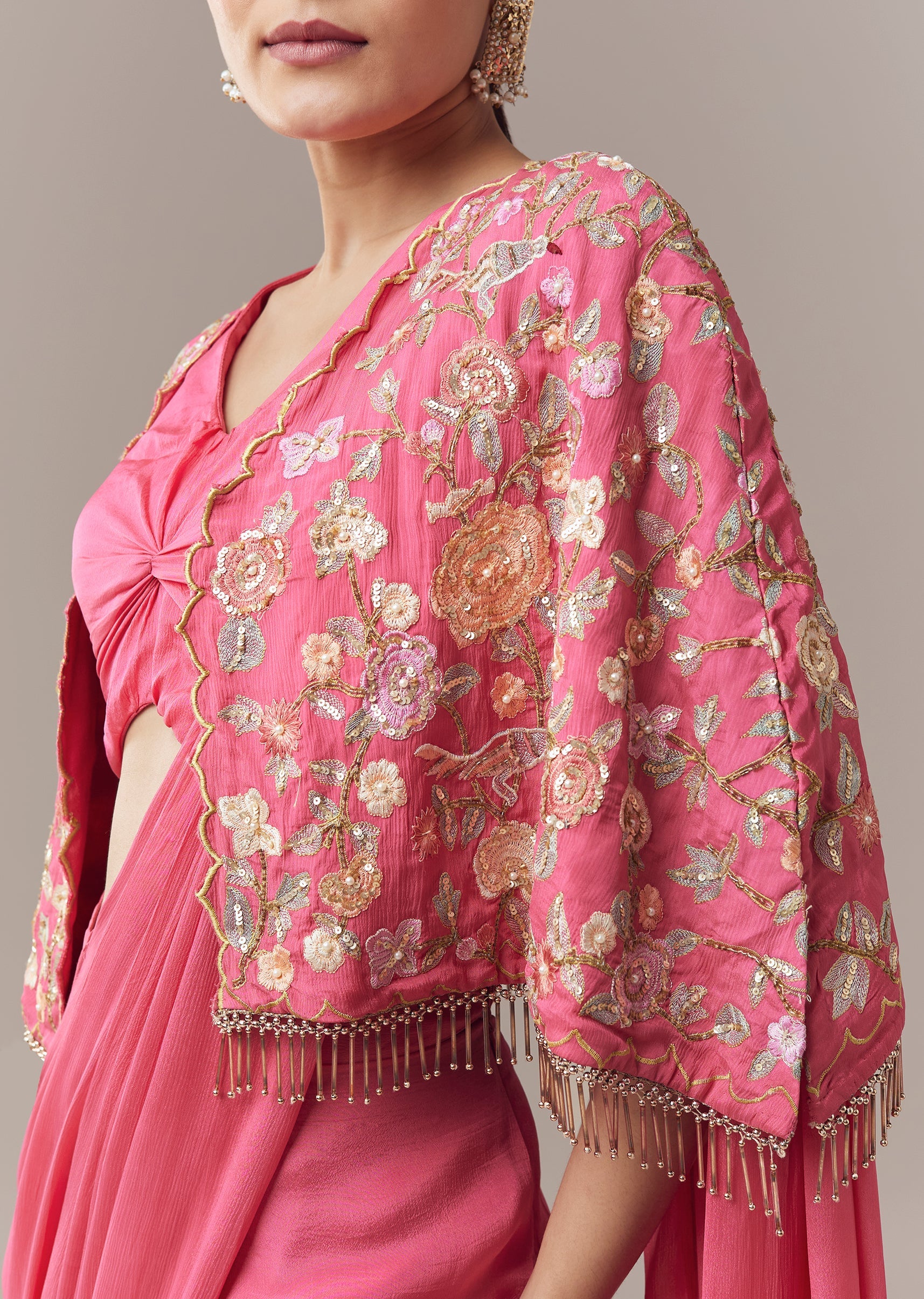 Pink Ready Pleated Saree With Cape Blouse And Resham And Sequins Work