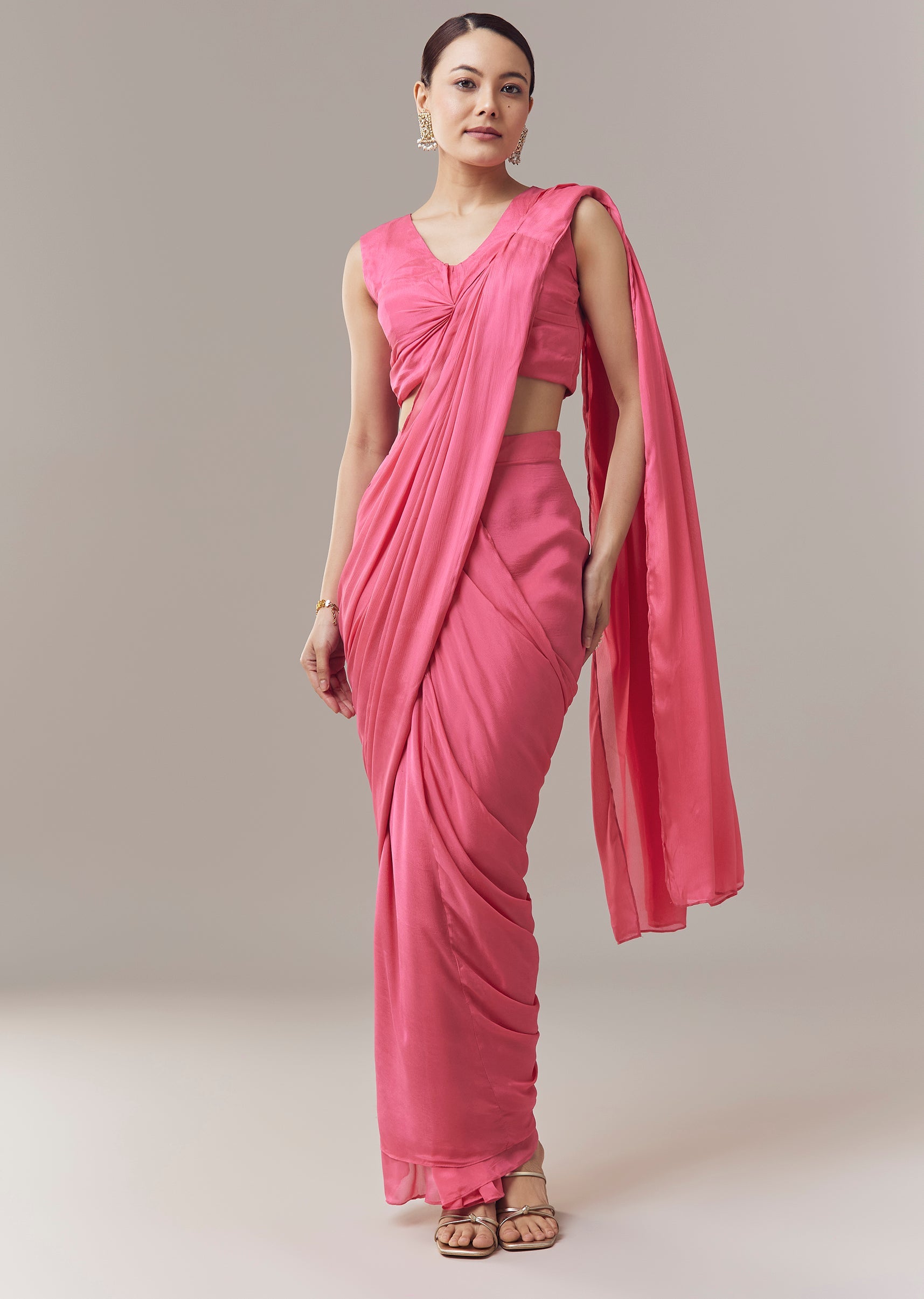 Elegant and festive, this pink ready pleated saree is crafted for a contemporary Indo western look. The ensemble features a twist style blouse with a delicate cape adorned with resham and sequins embroidery, adding shimmer and refined detailing. The pre draped saree ensures ease of wear while maintaining a graceful silhouette, making it perfect for party, wedding, or festive occasions. Awarded as the Most Trusted Brand, we're delivering styles you love, just as promised.