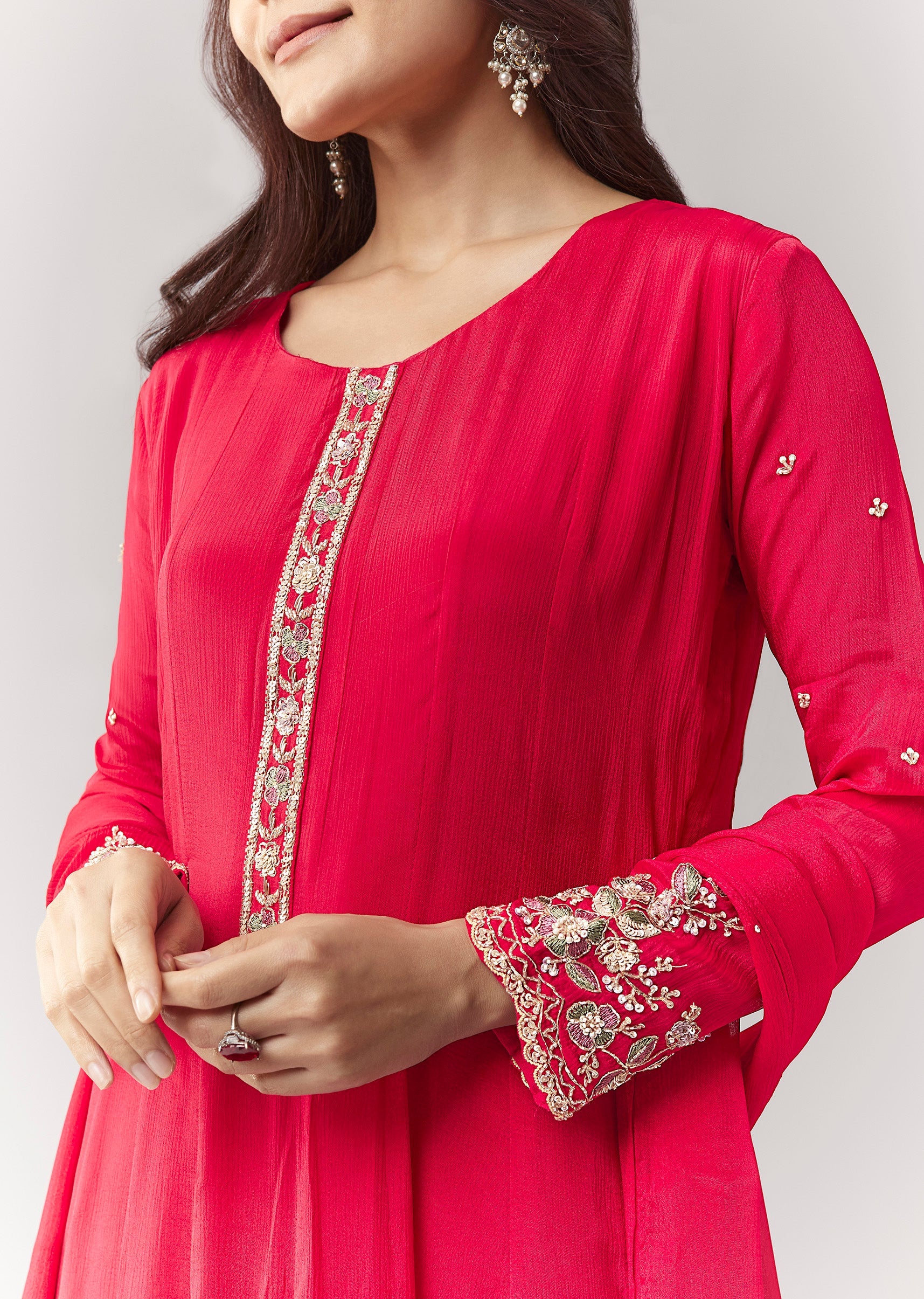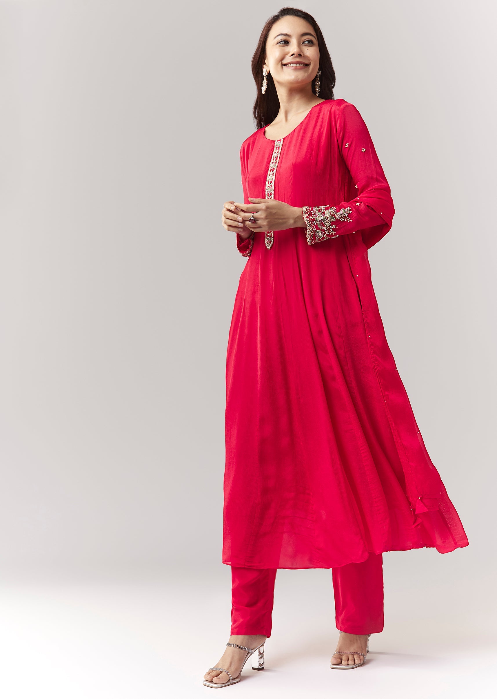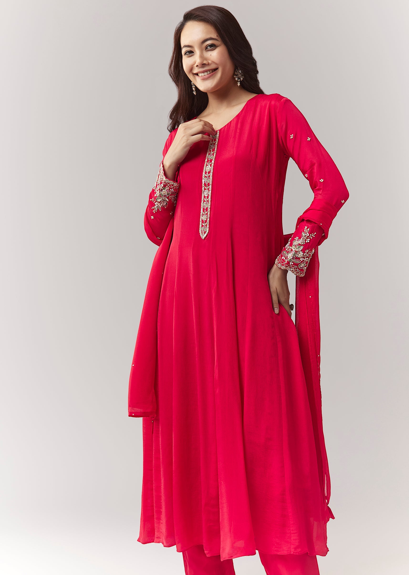 A minimal pink chinon anarkali with resham and cut-dana work on sleeves, full sleeves and round neck. Comes with straight pants (partially elasticated) and dupatta—great for pooja wear. Awarded as... More Product Details