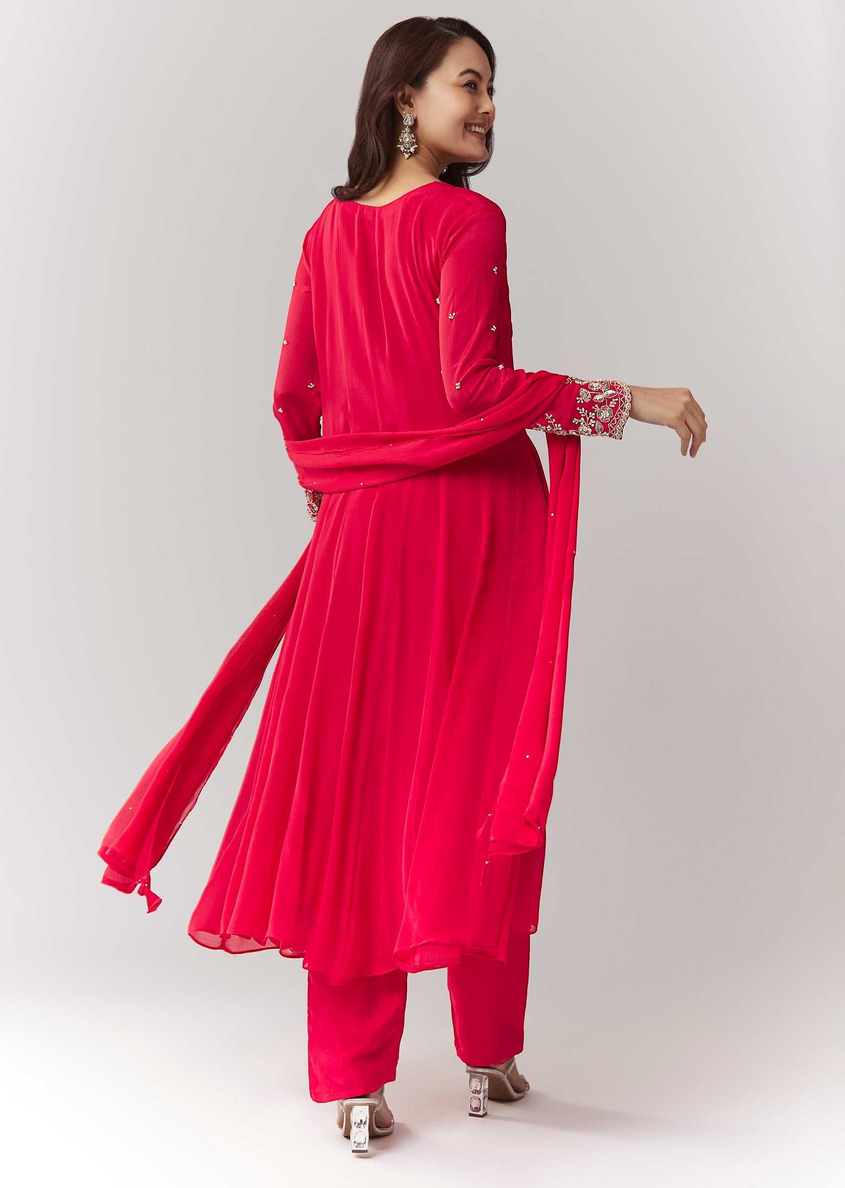 Pink Resham Cut Dana Sleeve Anarkali Pant Set With Dupatta