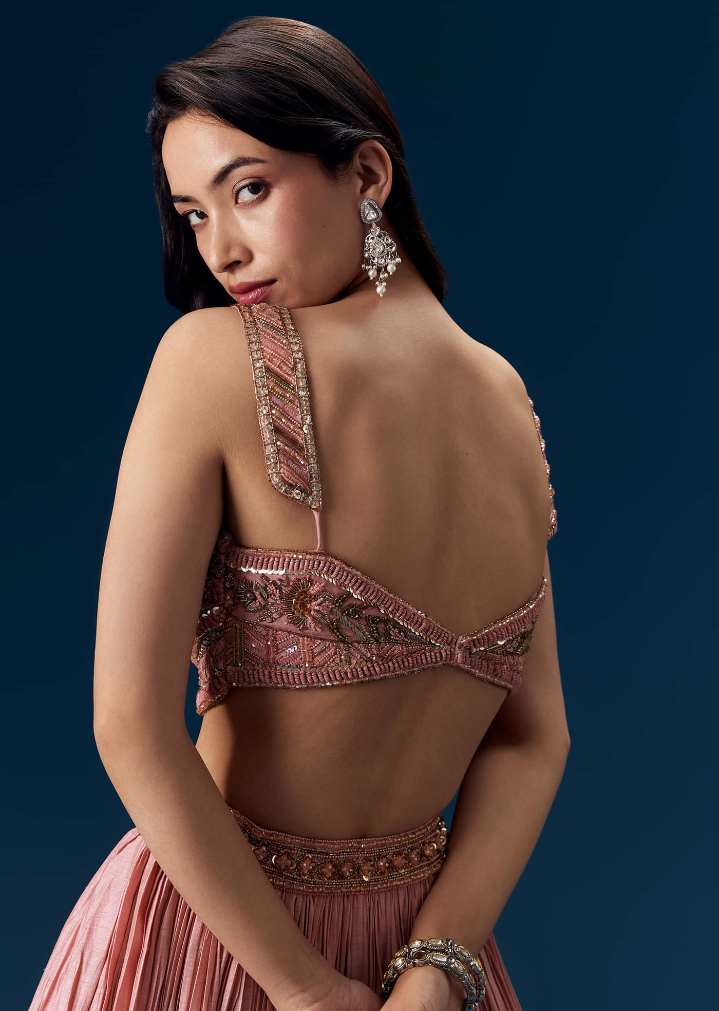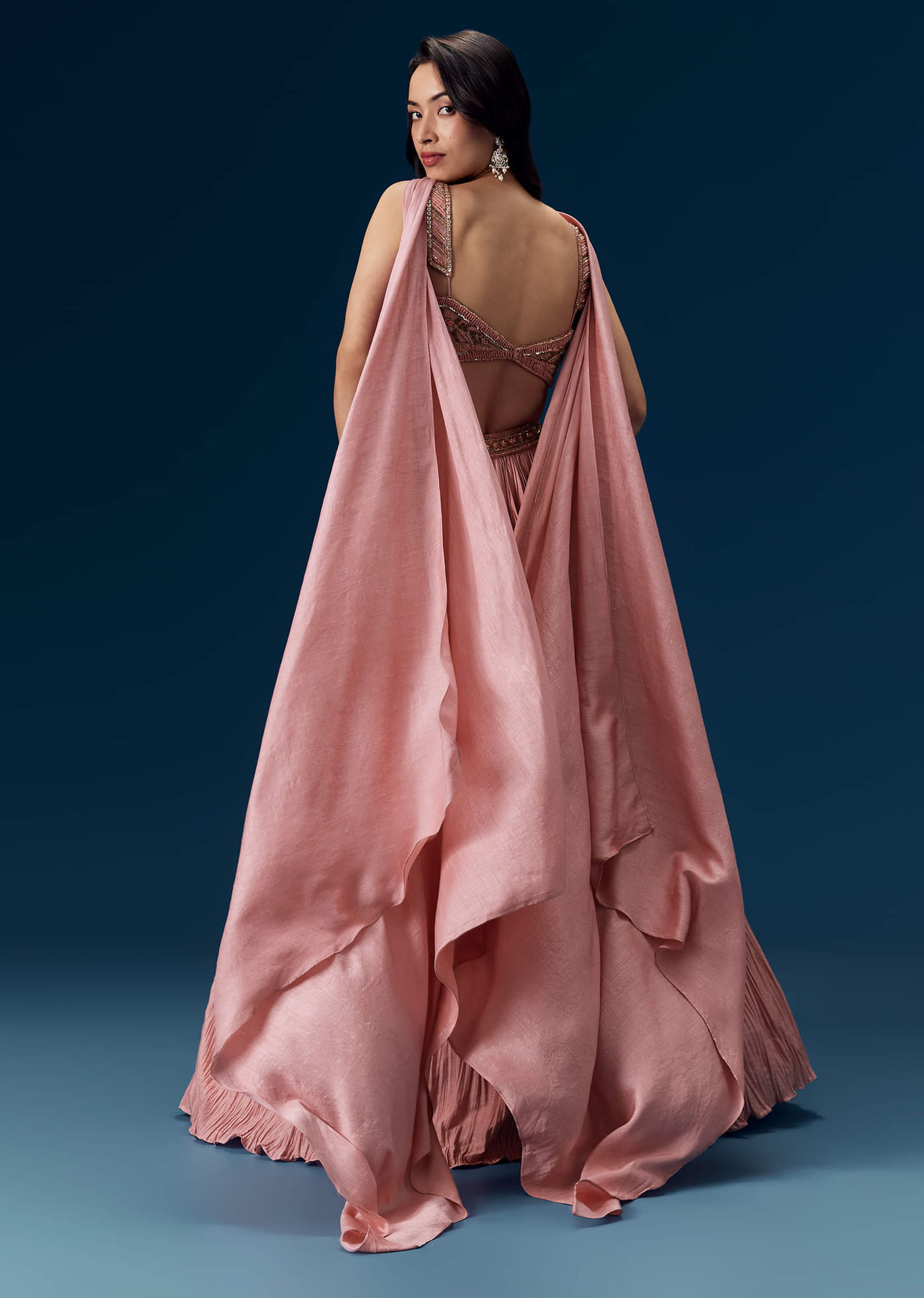 Blending contemporary glam with timeless bridesmaid charm, this pink ruched lehenga set features delicate ruching for a sculpted, romantic look. Intricately adorned with sequin, cutdana, and bead work on rich... More Product Details