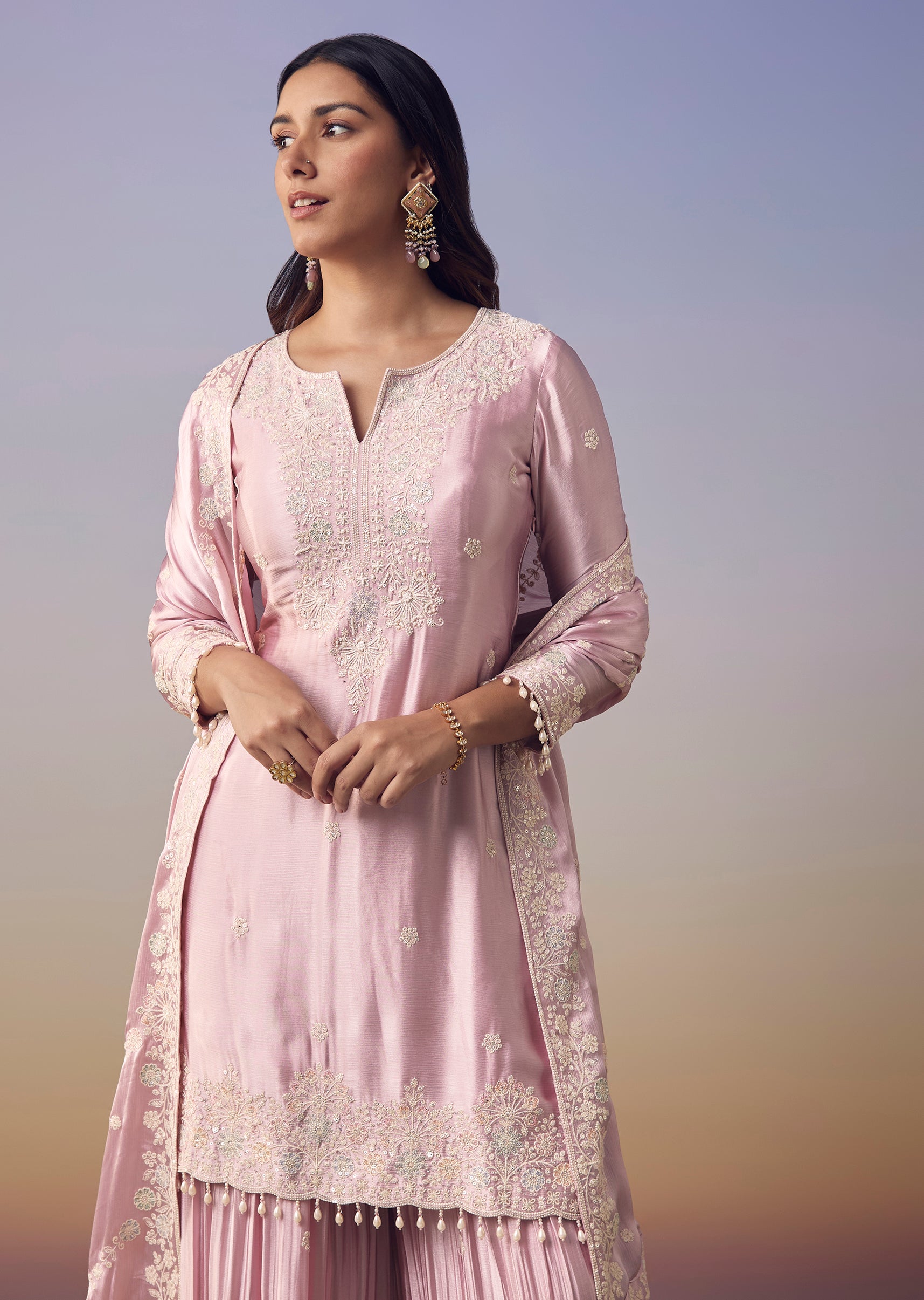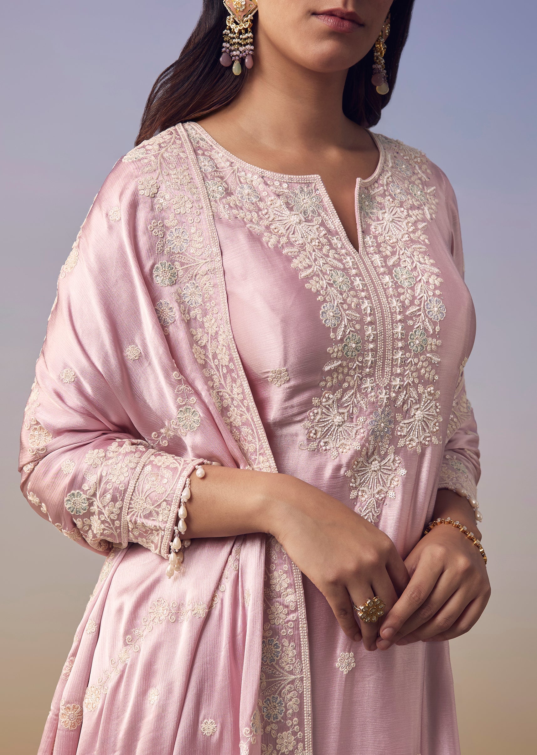 Embrace soft sophistication with this pink satin kurta set adorned with delicate thread embroidery and moti work that adds a graceful festive shine. The notched neckline and three fourth sleeves... More Product Details