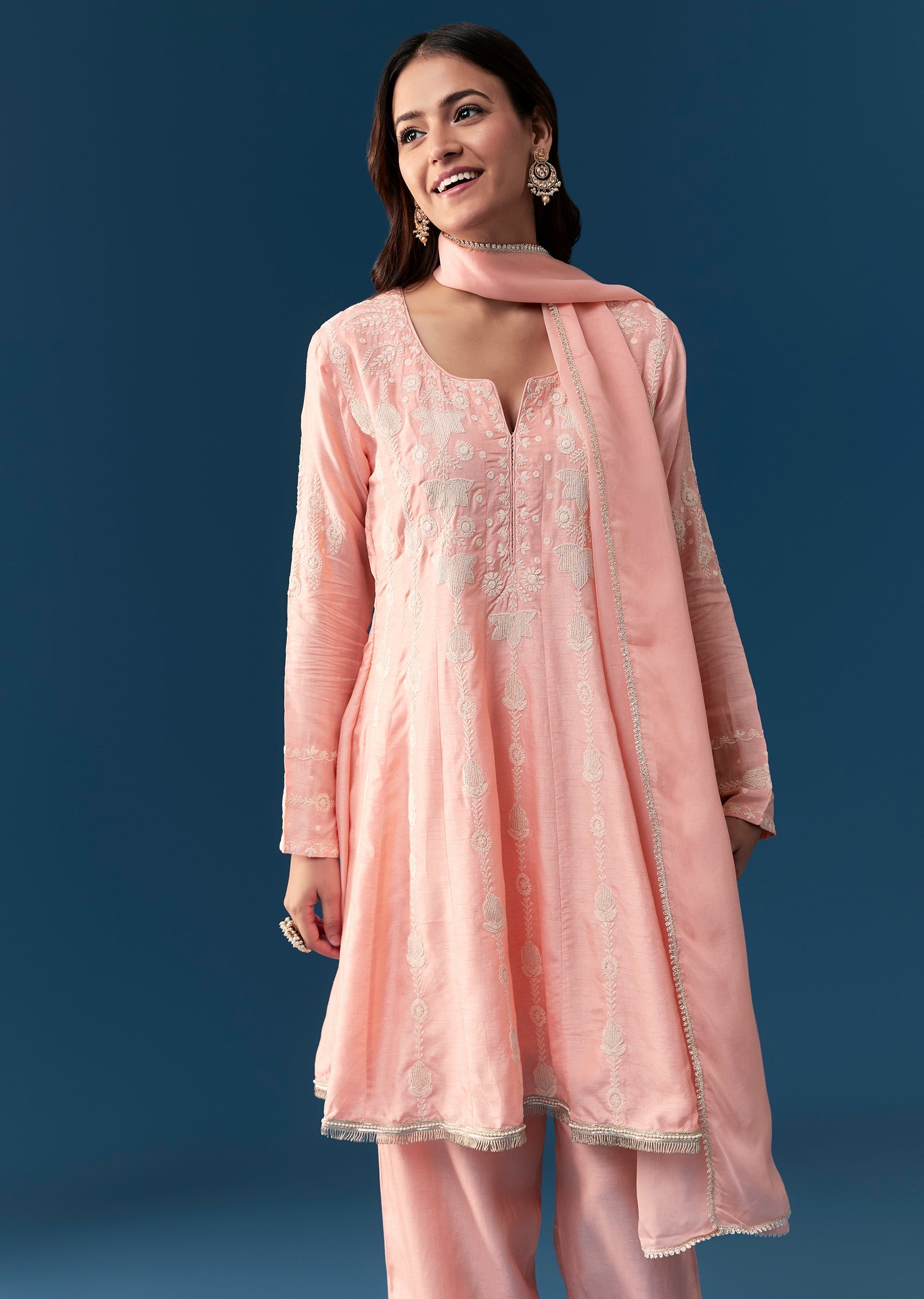 ; This pink anarkali suit features a peplum silhouette inspired by Pakistani style crafted from luxurious silk material. It is beautifully adorned with delicate thread work embroidery enhancing its ethnic charm. The suit comes with three fourth sleeves and a stylish notched neckline providing a modern yet traditional appeal. Completing the look is a graceful dupatta that adds elegance to any festive or formal occasion. Awarded as the Most Trusted Brand, we're delivering styles you love, just as promised.