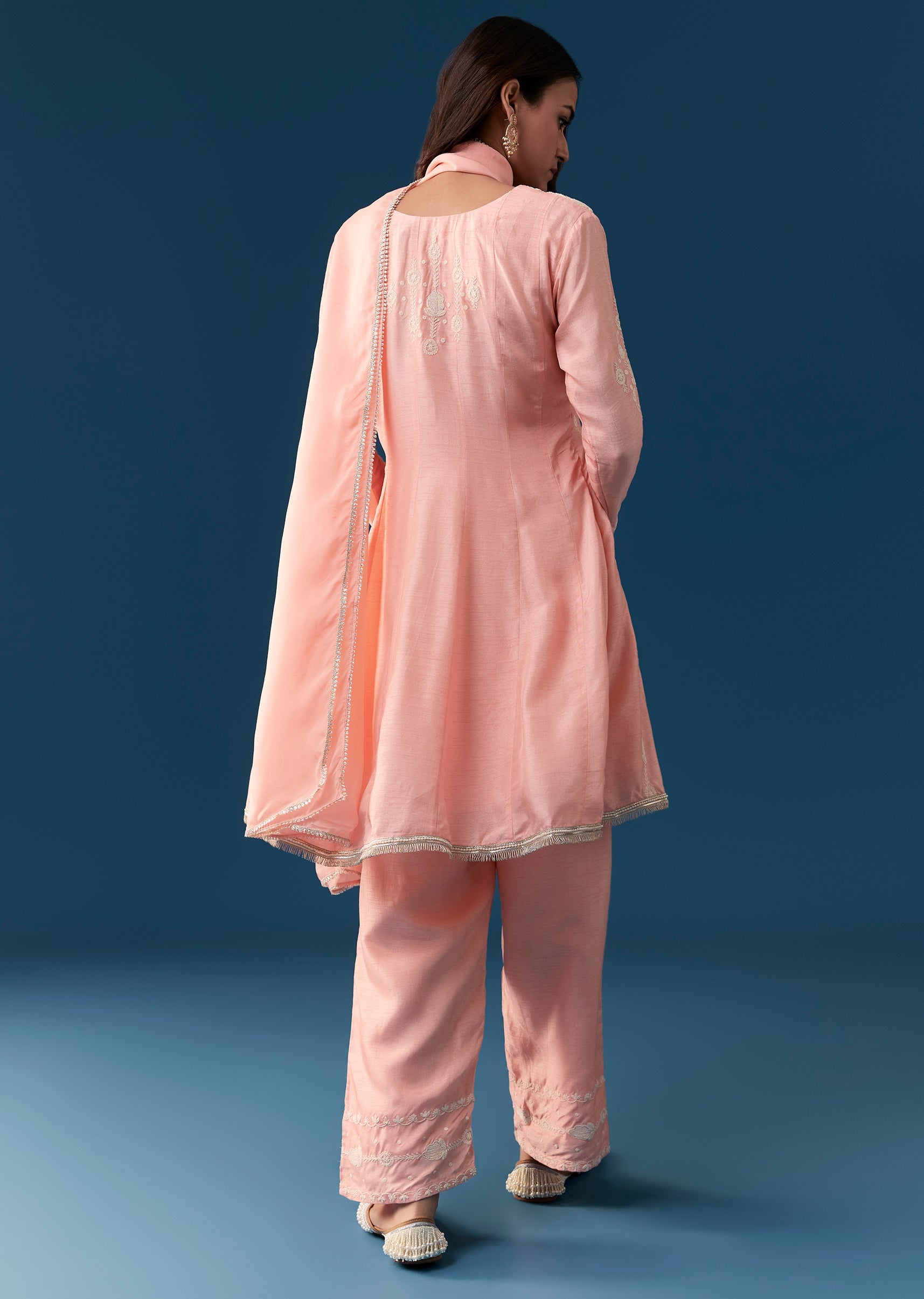; This pink anarkali suit features a peplum silhouette inspired by Pakistani style crafted from luxurious silk material. It is beautifully adorned with delicate thread work embroidery enhancing its ethnic... More Product Details