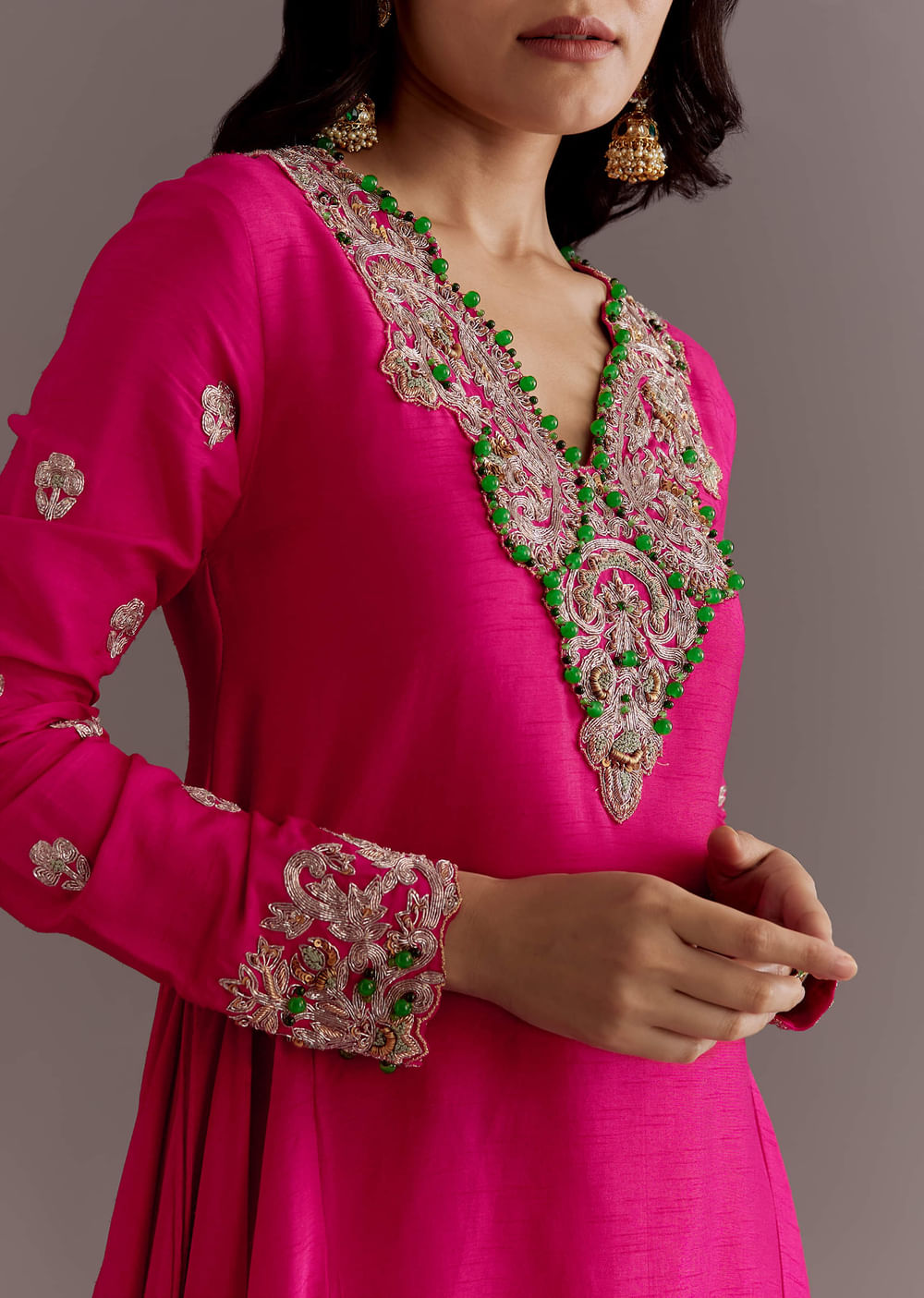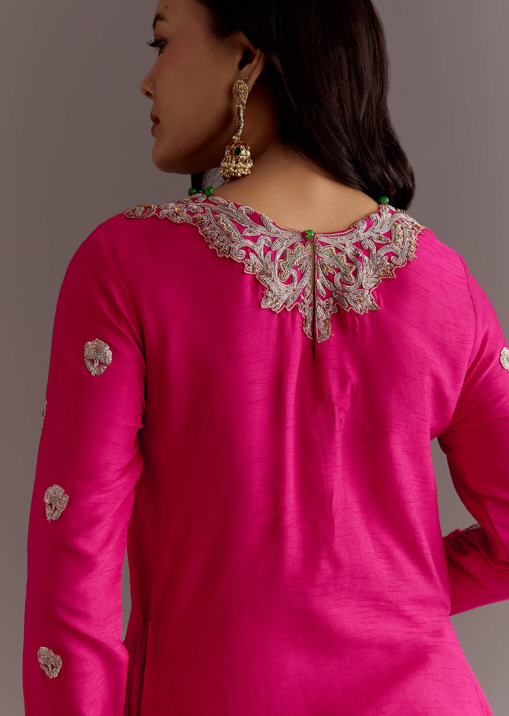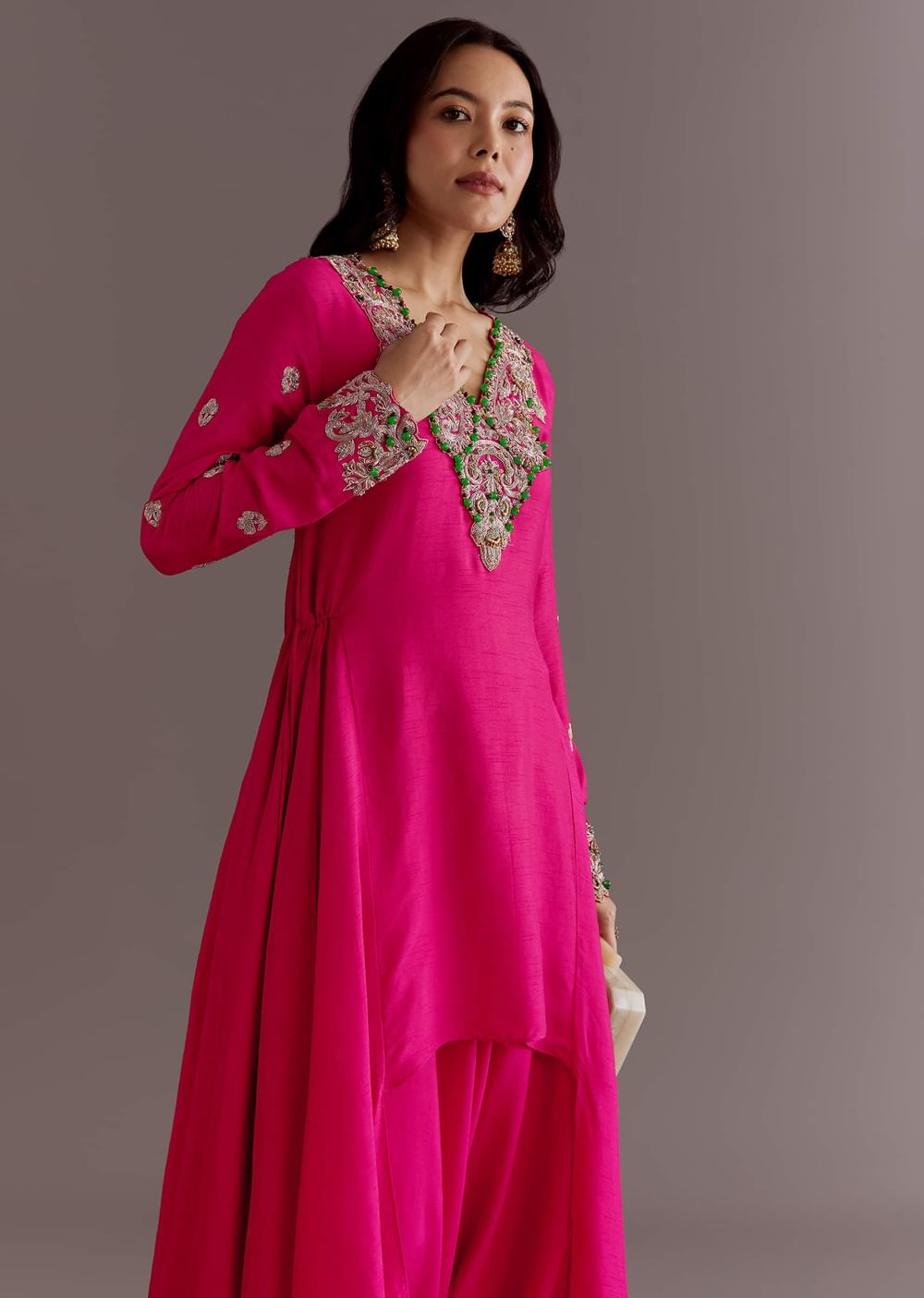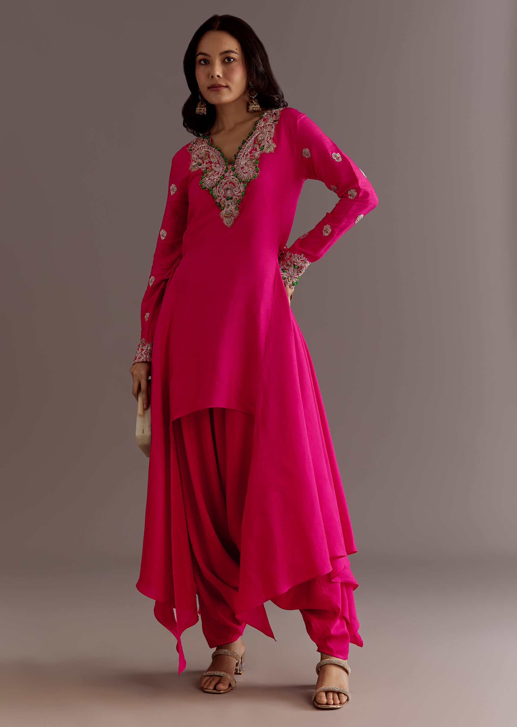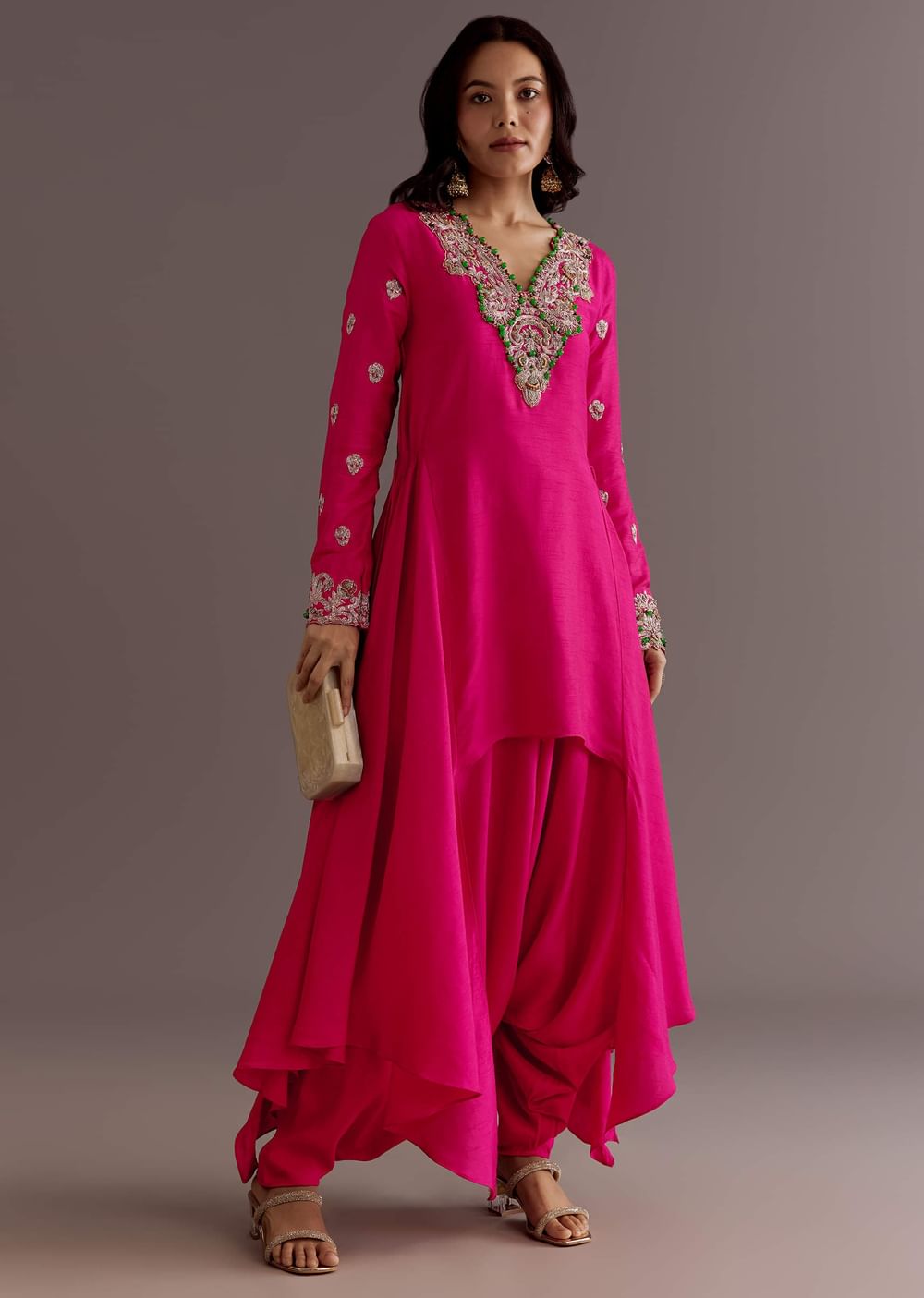 Pink Silk Asymmetrical Zardosi Work Kurta Dhoti Set