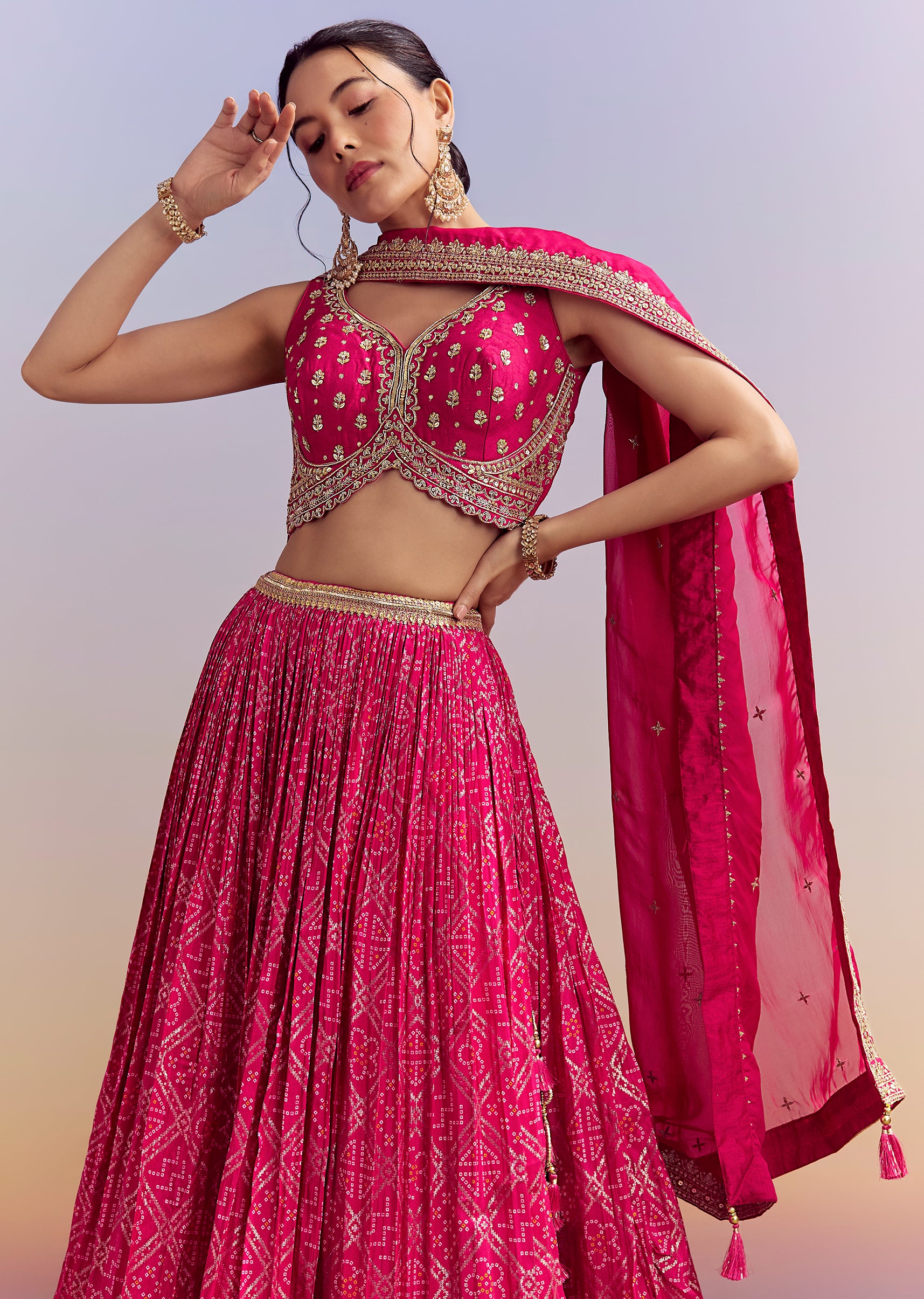 Nothing feels more joyful than this pink silk bandhani bridesmaid lehenga with its vibrant vibe. The blouse enhanced with zardosi embroidery creates a luxe contrast to the playful bandhani print.... More Product Details