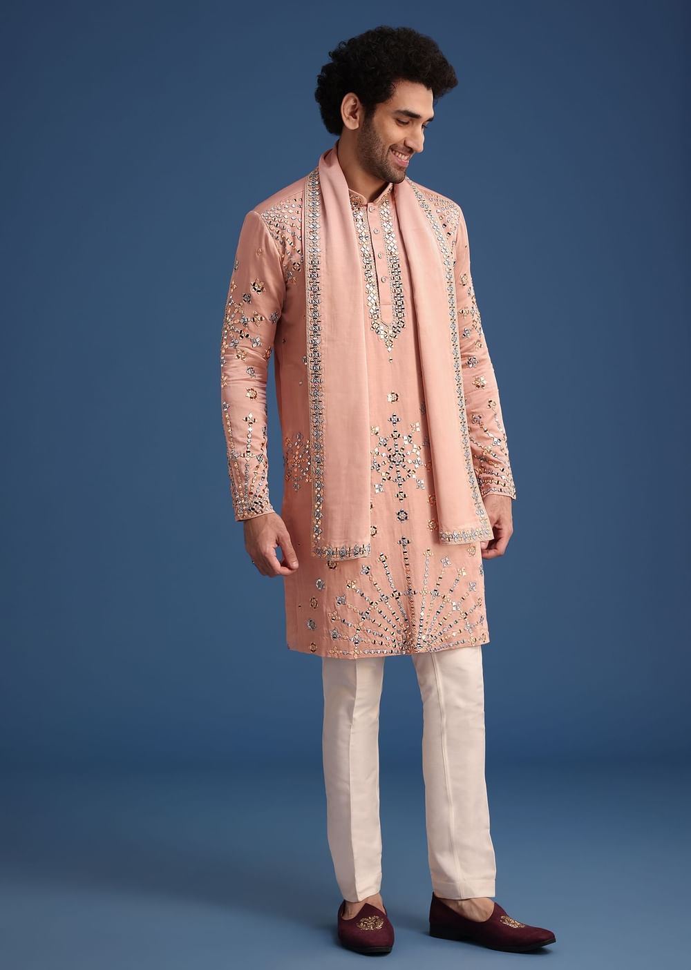 Crafted for celebrations this luxurious blended silk ensemble features glistening mirror work all over. Accentuated with a stylish front hookeye placket and a classic mandarin collar the full sleeves design... More Product Details
