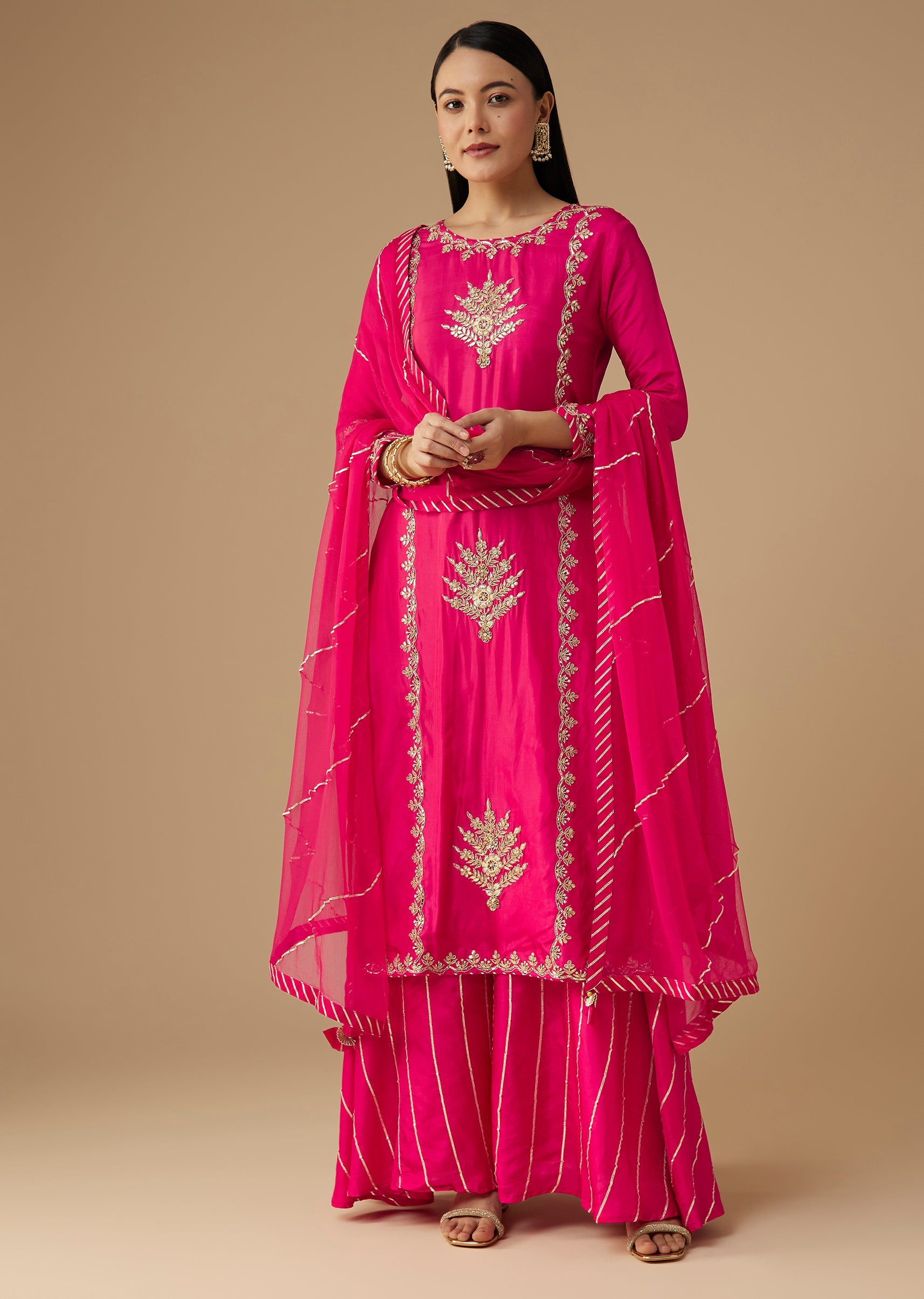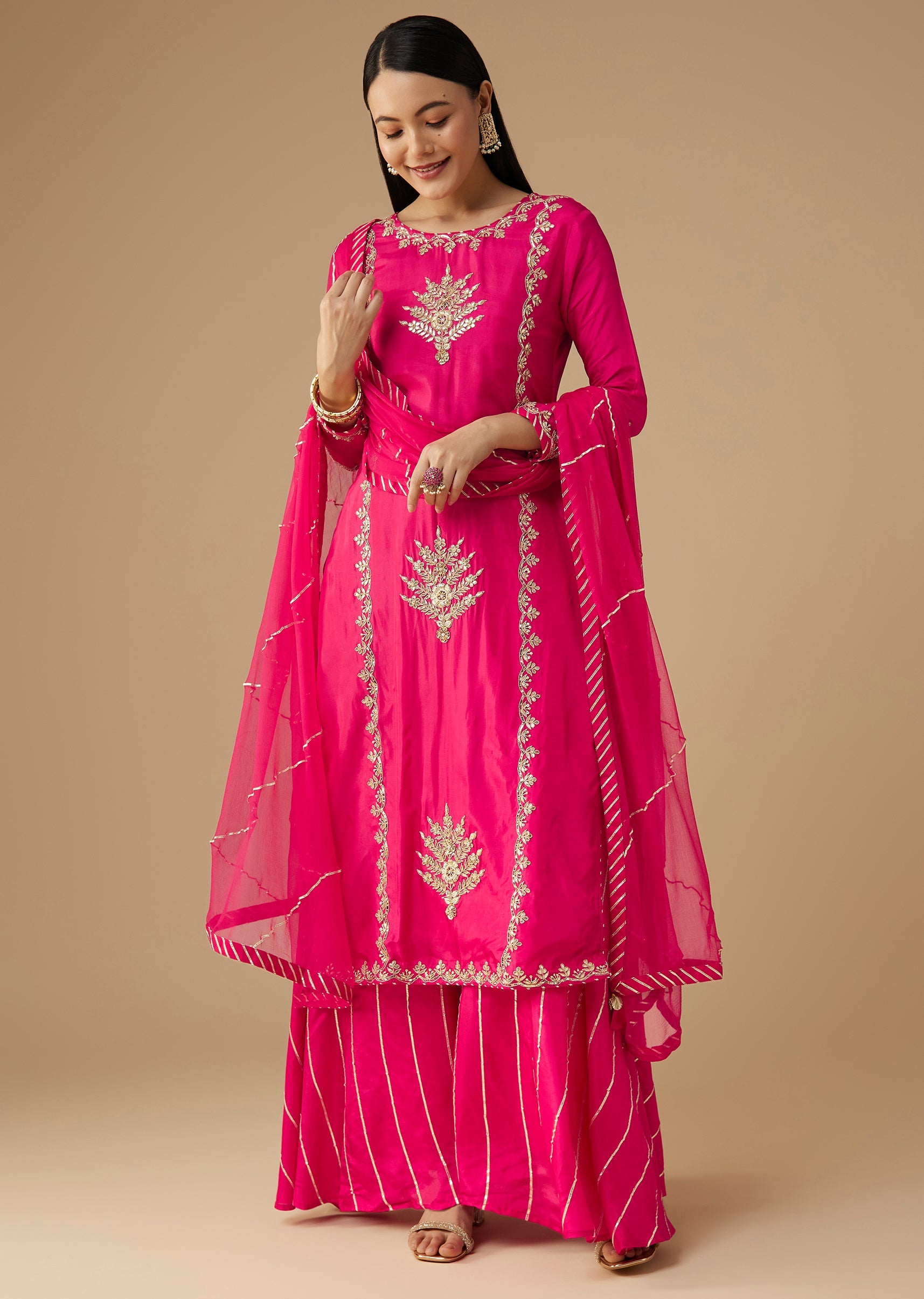 Add a touch of festive charm with this pink silk kurta set, beautifully adorned with delicate gotta work that lends a traditional, radiant finish. The soft silk palazzo offers effortless movement, while the matching dupatta completes the ensemble with graceful elegance. Perfect for daytime celebrations, festive gatherings, or family functions, this set blends simplicity with refined detailing. Awarded as the Most Trusted Brand, we're delivering styles you love, just as promised.