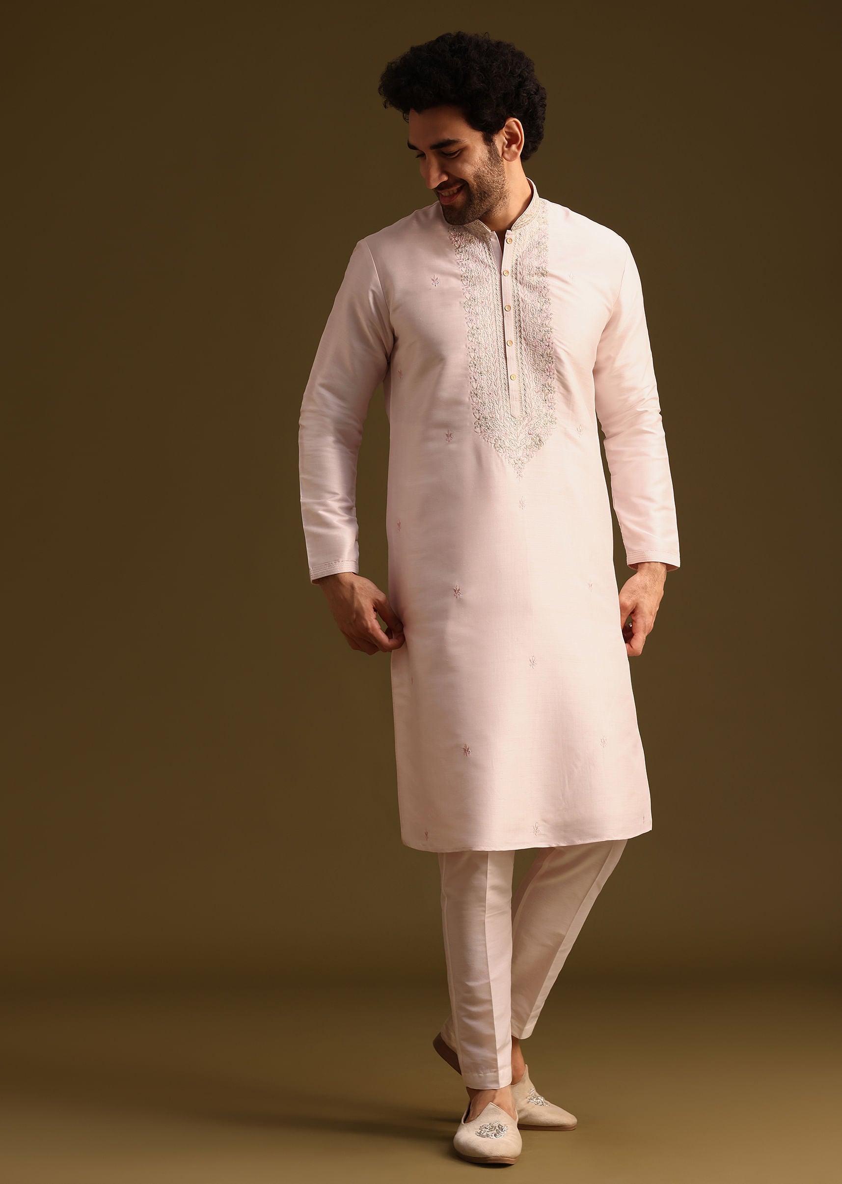 The luxurious silk fabric is adorned with intricate threadwork enhancing its elegance. Featuring a sophisticated mandarin collar this ensemble strikes the perfect balance between tradition and modernity. Ideal for festive occasions it allows you to make a lasting impression while ensuring comfort. Awarded as the Most Trusted Brand, we're delivering styles you love, just as promised.