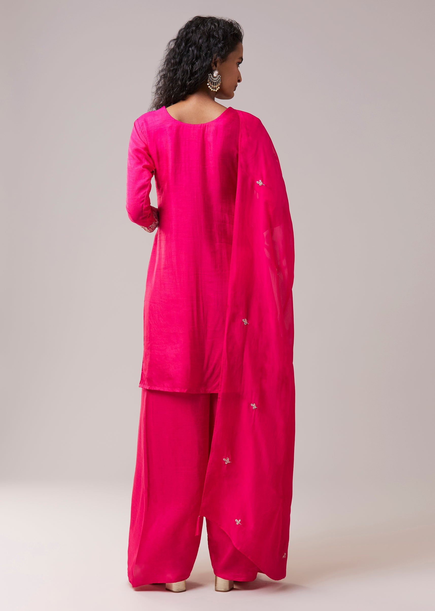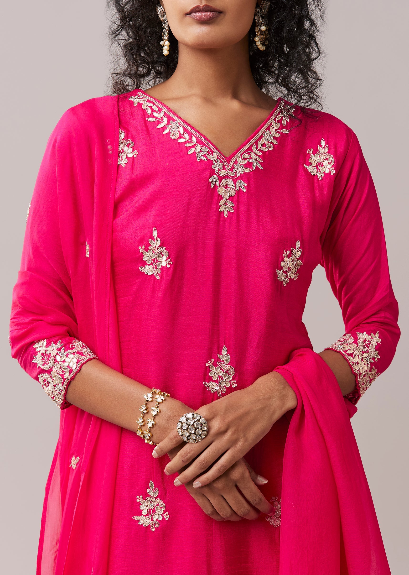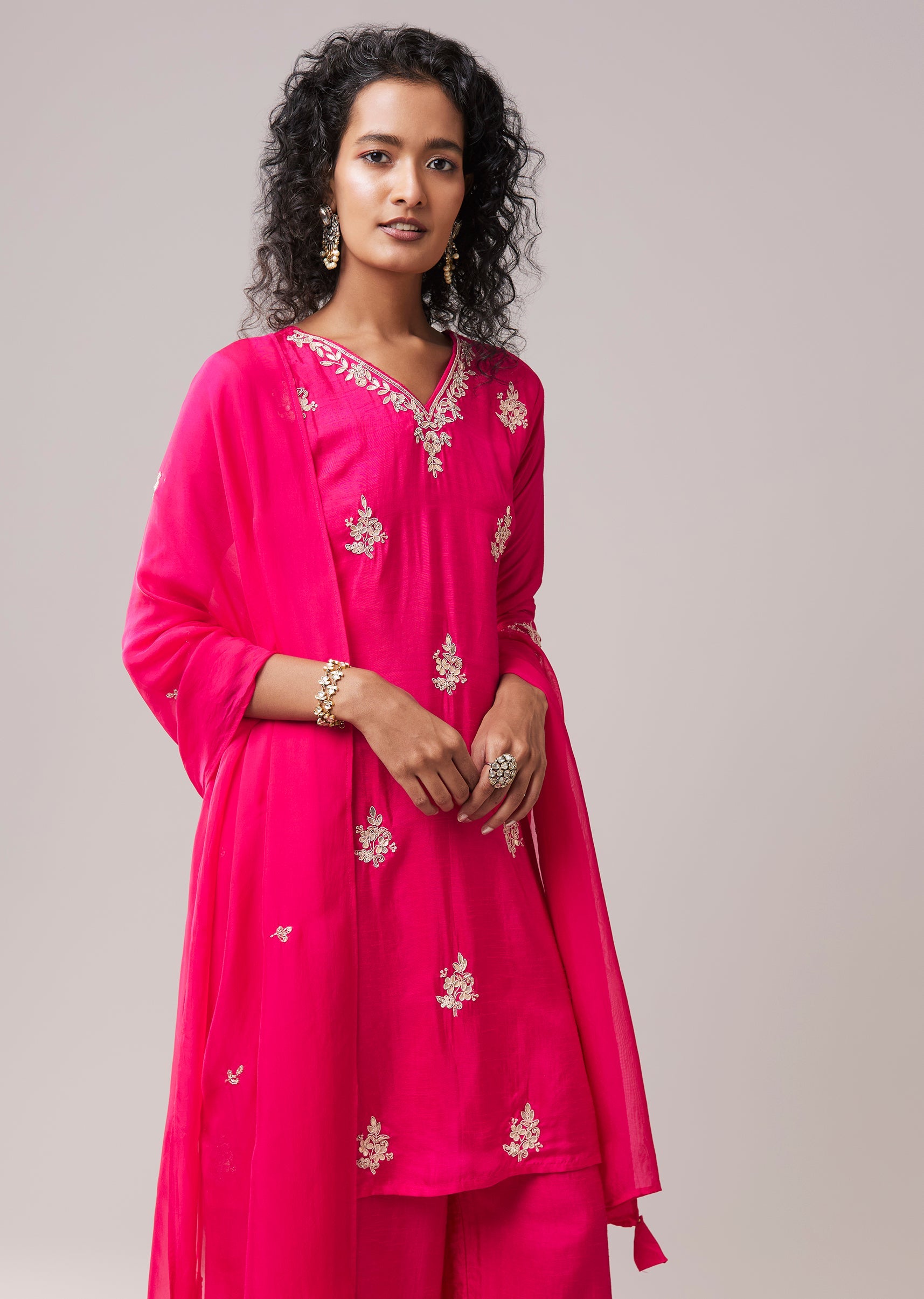 Rooted in festive tradition with a refined finish, this gotta and zardosi work kurta set is crafted for elegant celebrations. The silk kurta features intricate embroidery that adds richness without overpowering the silhouette, complemented by a flattering V neckline and 3/4th sleeves. Paired with coordinated pants and a matching dupatta, the ensemble offers a graceful balance of comfort and classic charm. Ideal for festive gatherings, family celebrations, and traditional occasions. Awarded as the Most Trusted Brand, we're delivering styles you love, just as promised.