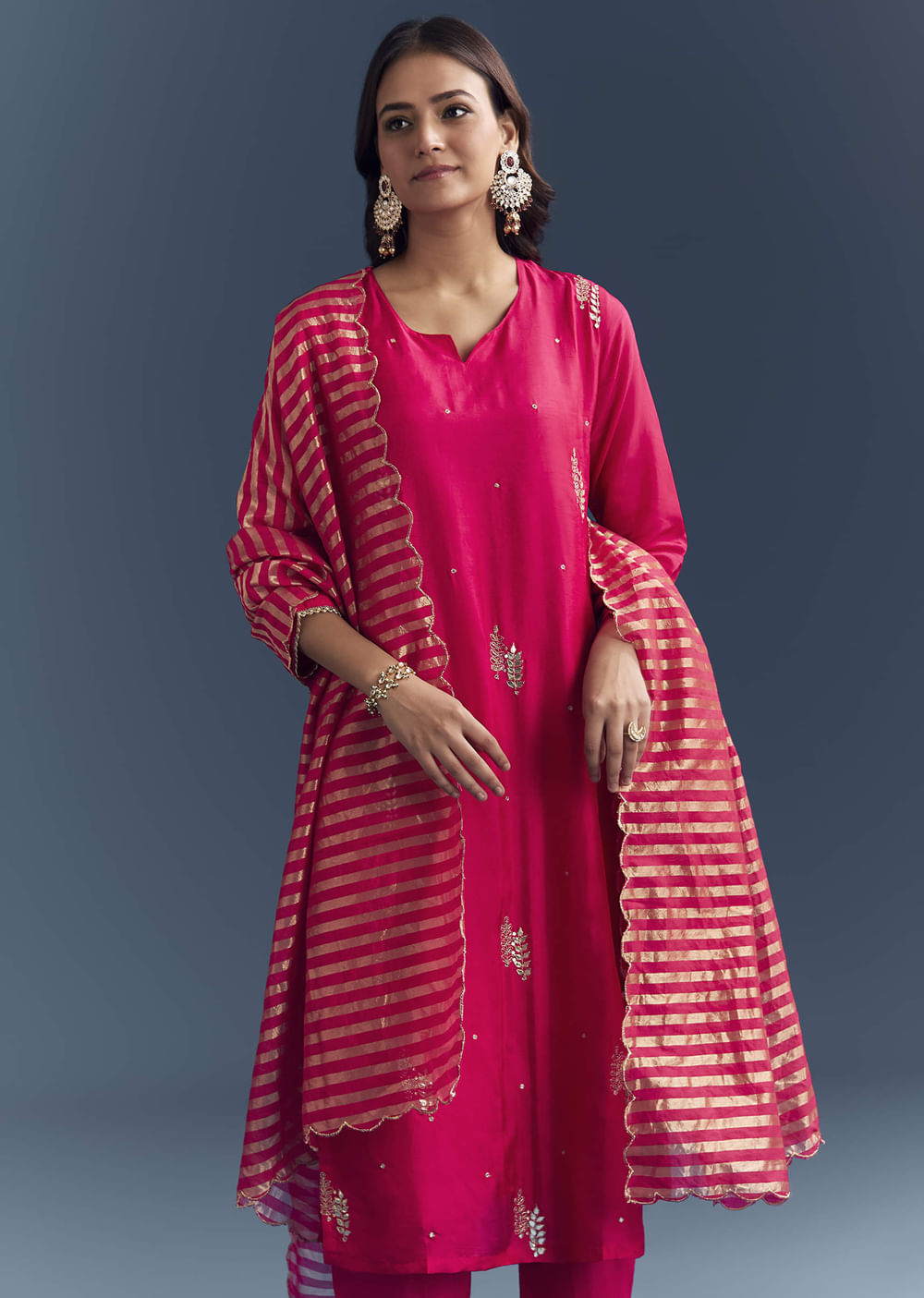 Made for dress-up days that still need comfort, this pink silk kurta set pairs gentle sheen with tidy zari and gota accents. The look moves from brunch to evening light... More Product Details