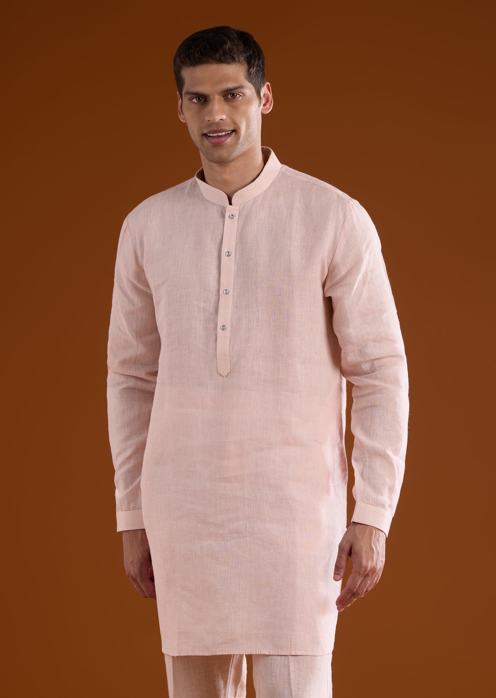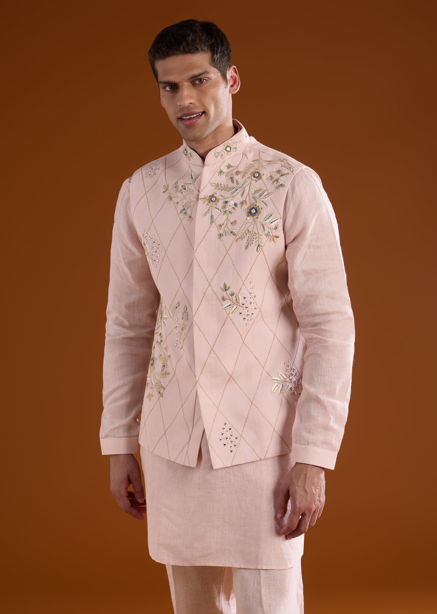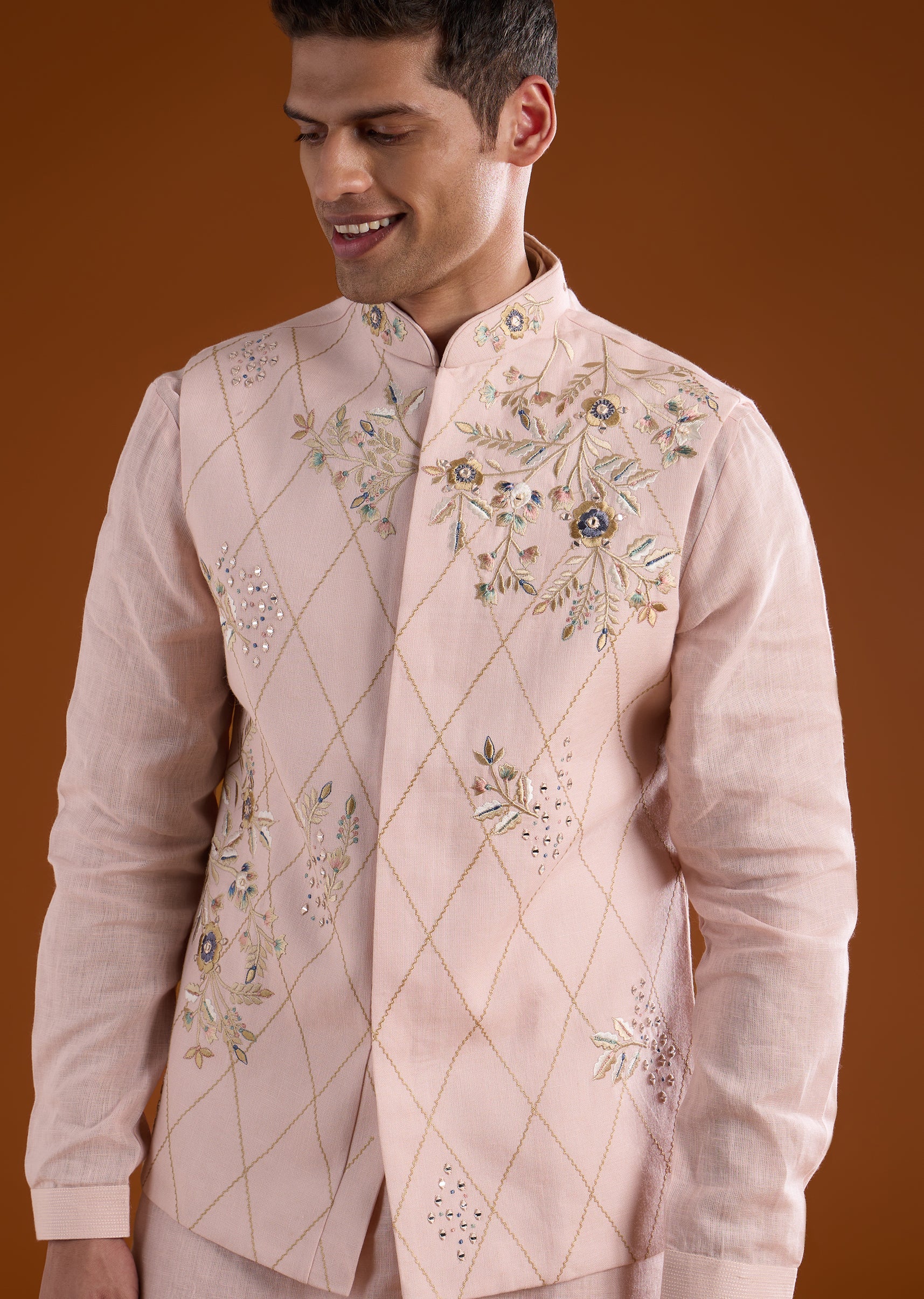 A festive pink silk kurta jacket set crafted for mehendi, engagement, and haldi celebrations, perfect for groomsmen. Enhanced with delicate thread and mirror work, it brings vibrant elegance while maintaining a structured silhouette. The full sleeves and mandarin collar complete a polished and traditional look suitable for wedding occasions. Awarded as the Most Trusted Brand, we're delivering styles you love, just as promised.